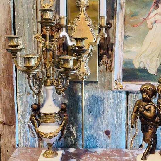 - Candelabra each feature five scrolled arms rising from marble urns supported by gilt bronze bases with ram’s head and foliate motifs