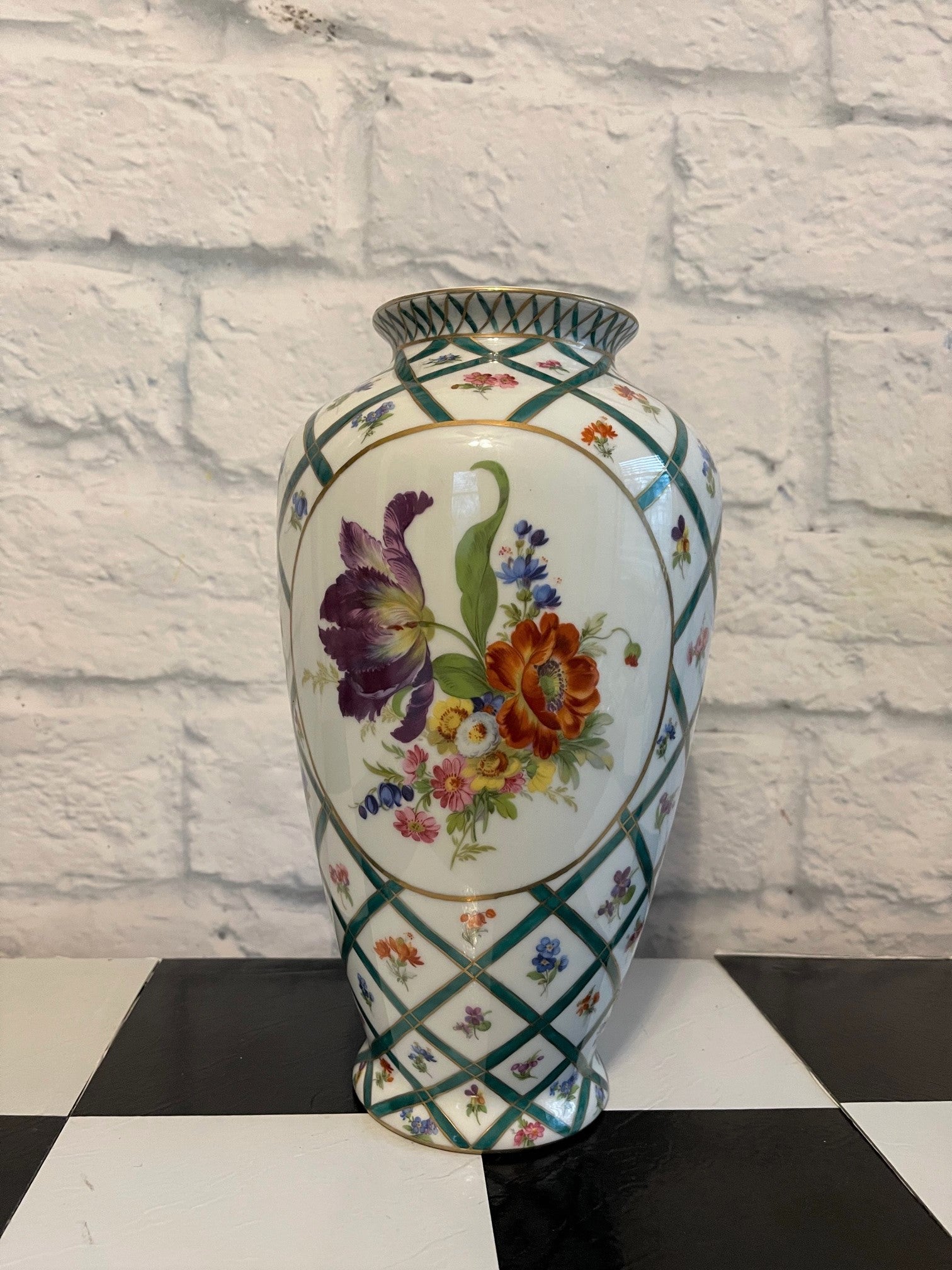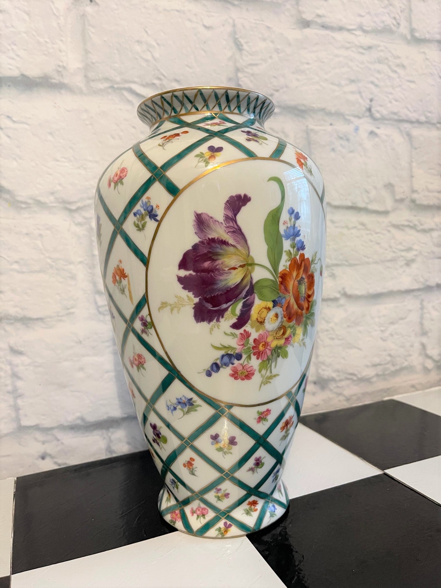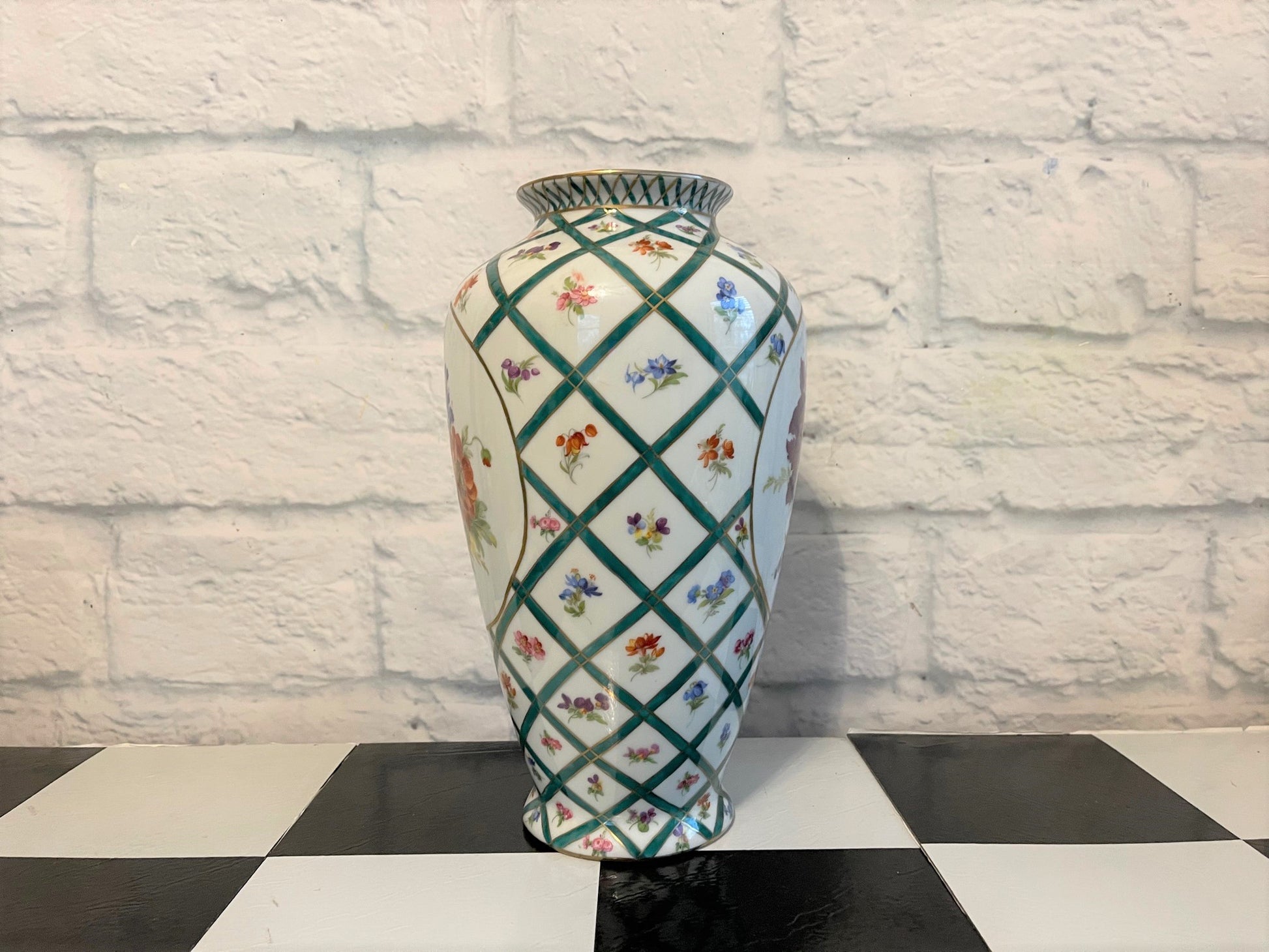 This lovely hand-painted Italian vase by Elios is so Posh! It’s in beautiful LIKE NEW condition. Decorated with beautiful botanicals... mini-bouquets and some single stems of various florals. The Lattice pattern in a lush Kelly green atop the pure white porcelain backdrop allows the vivid pinks, vermilion orange, varying shades of lavender, and canary yellow to POP. The rims, top, and bottom, are trimmed in gold. Fantastic condition and quality.