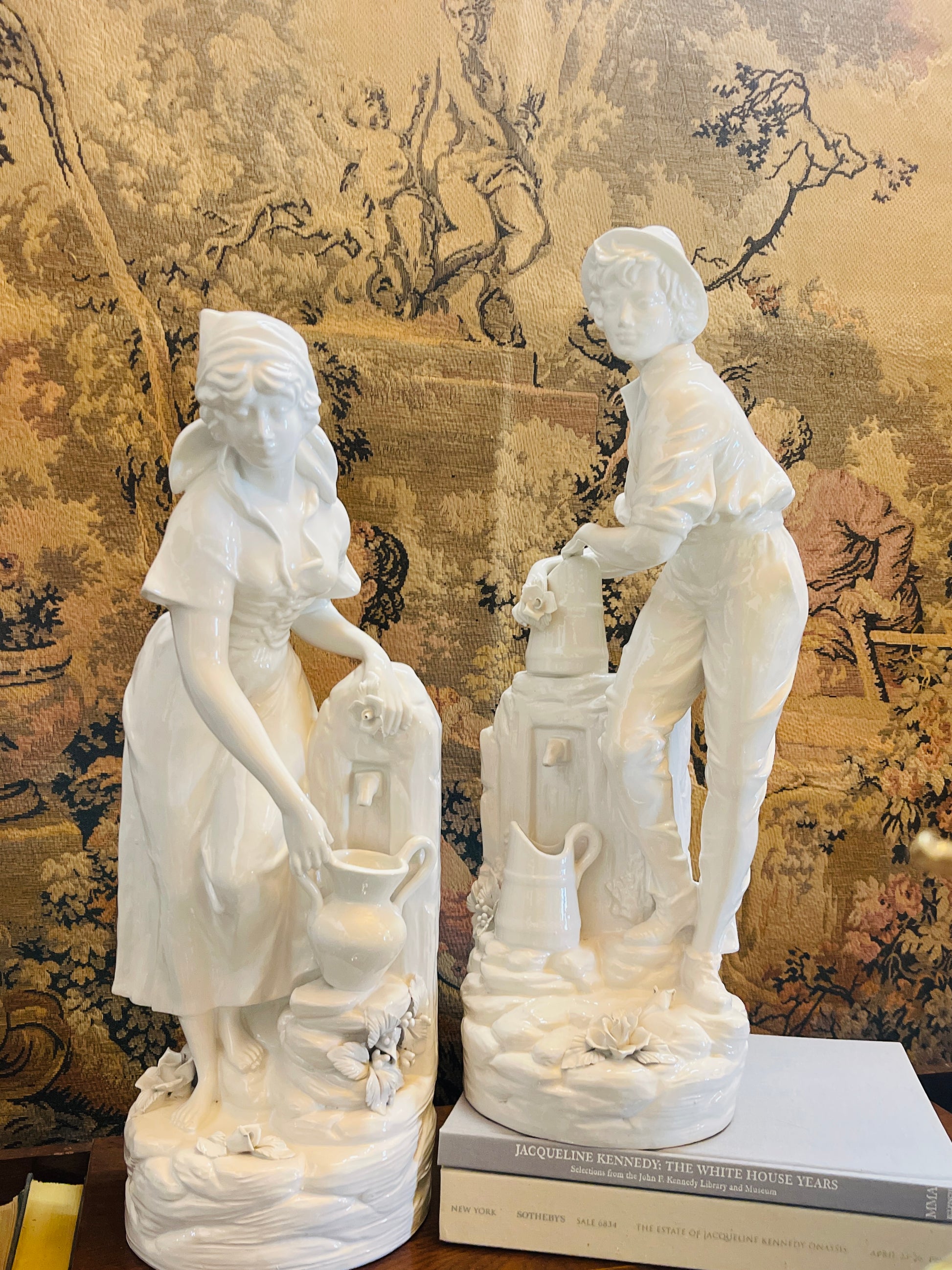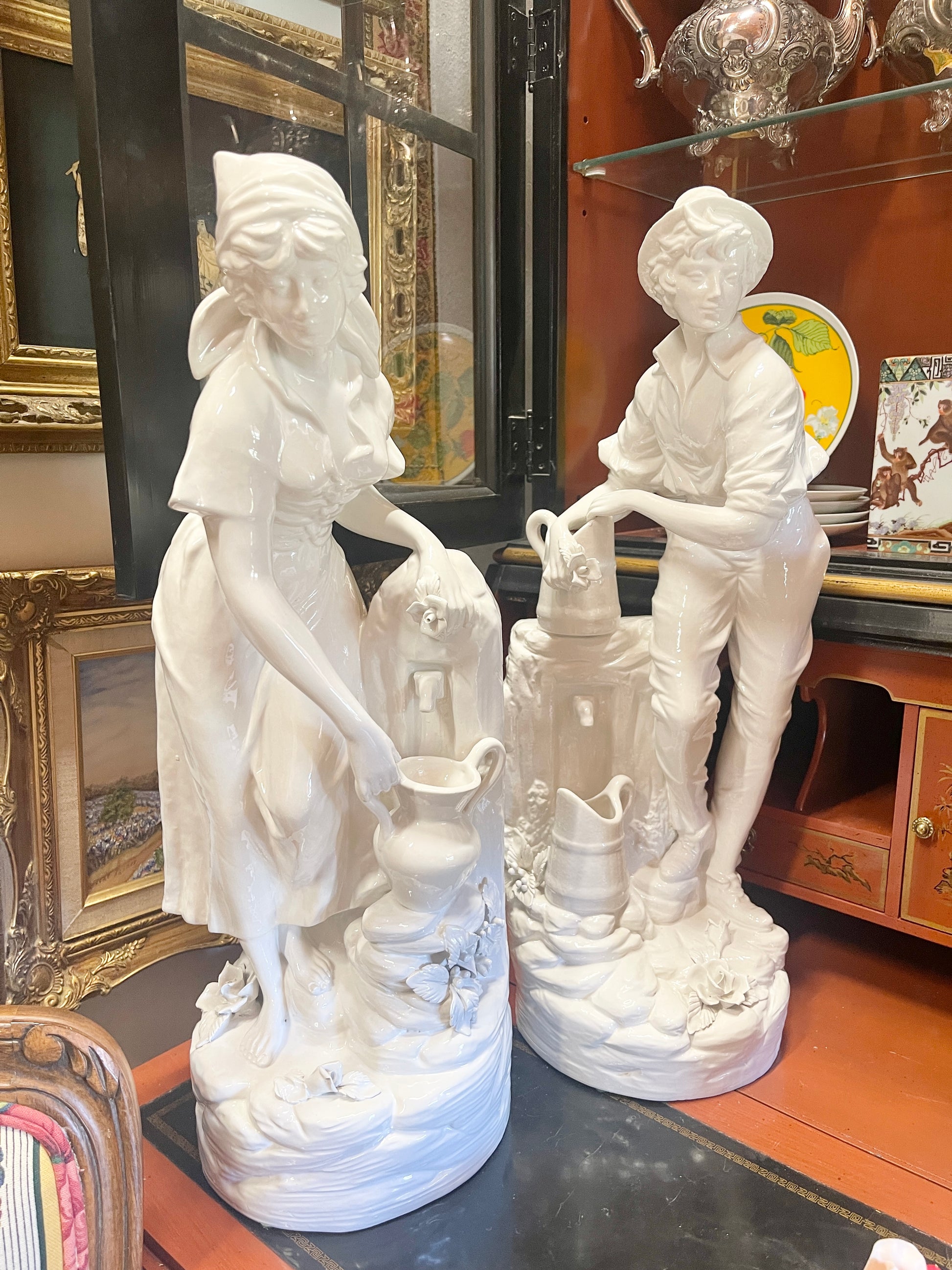 Romantic Italian Porcelain Statues – Rustic Shepherd & Shepherdess at the Fountain (Set of 2)