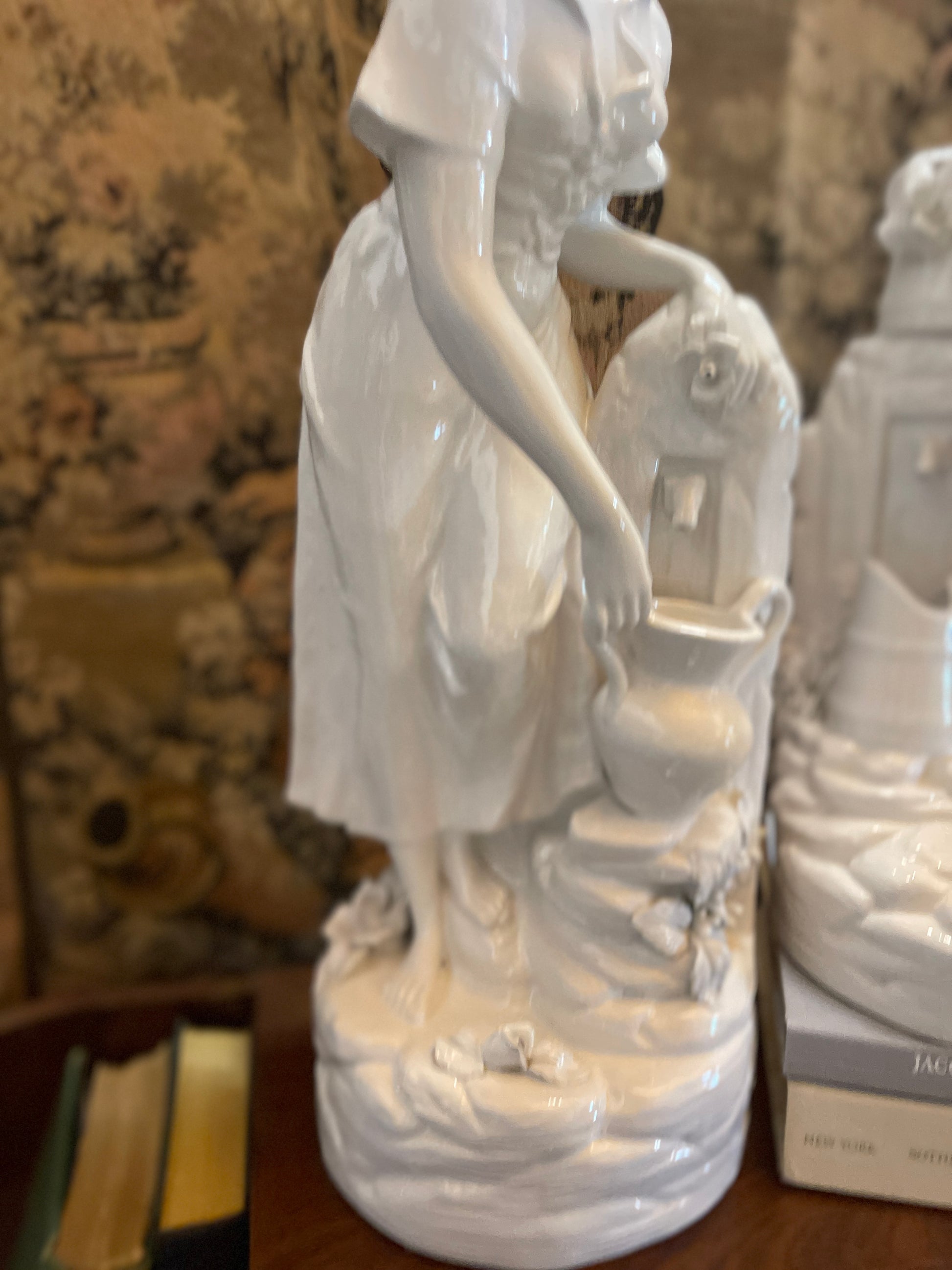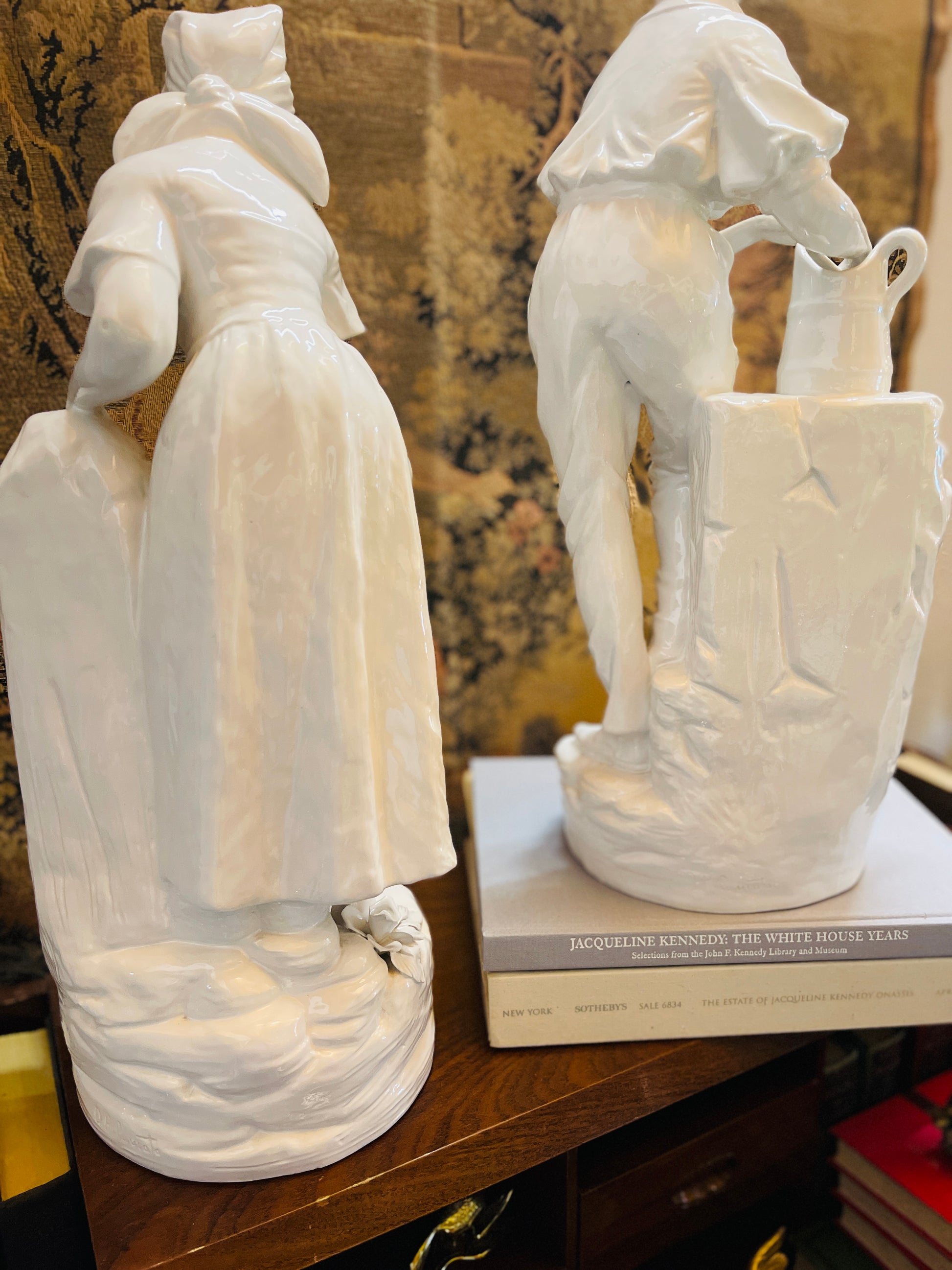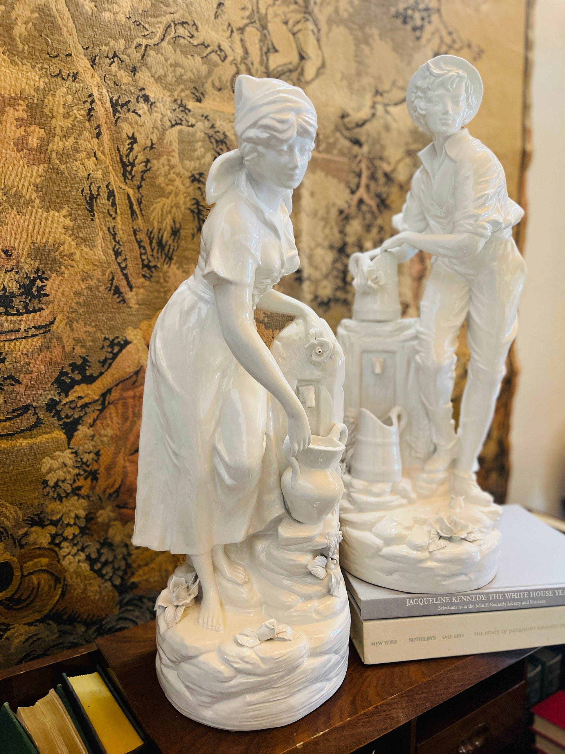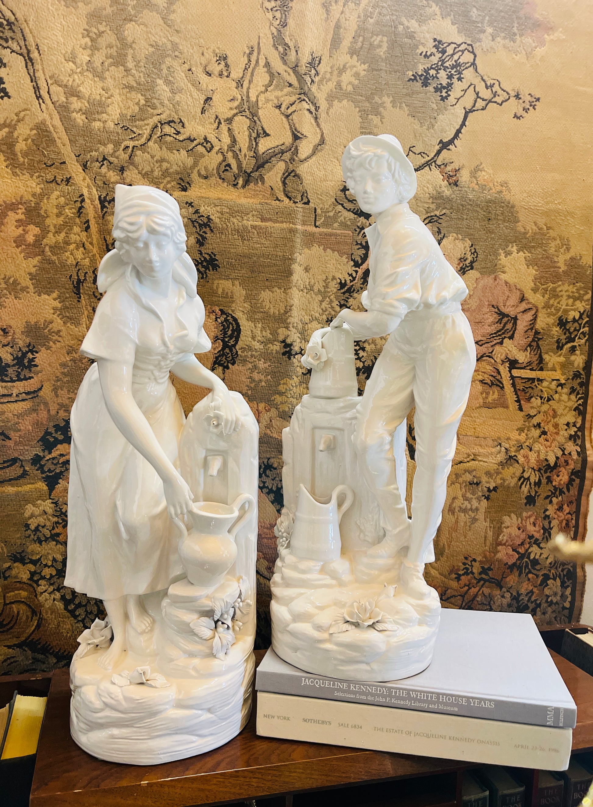 Capture the charm of the Italian countryside with this exquisite pair of porcelain statues, masterfully crafted in Italy and finished in a creamy high-gloss white glaze. Depicting a romanticized pastoral scene, the figures represent a young shepherdess fetching water and her beloved drawing from a rustic fountain. Together, they form a harmonious tableau of rural life, grace, and timeless beauty.