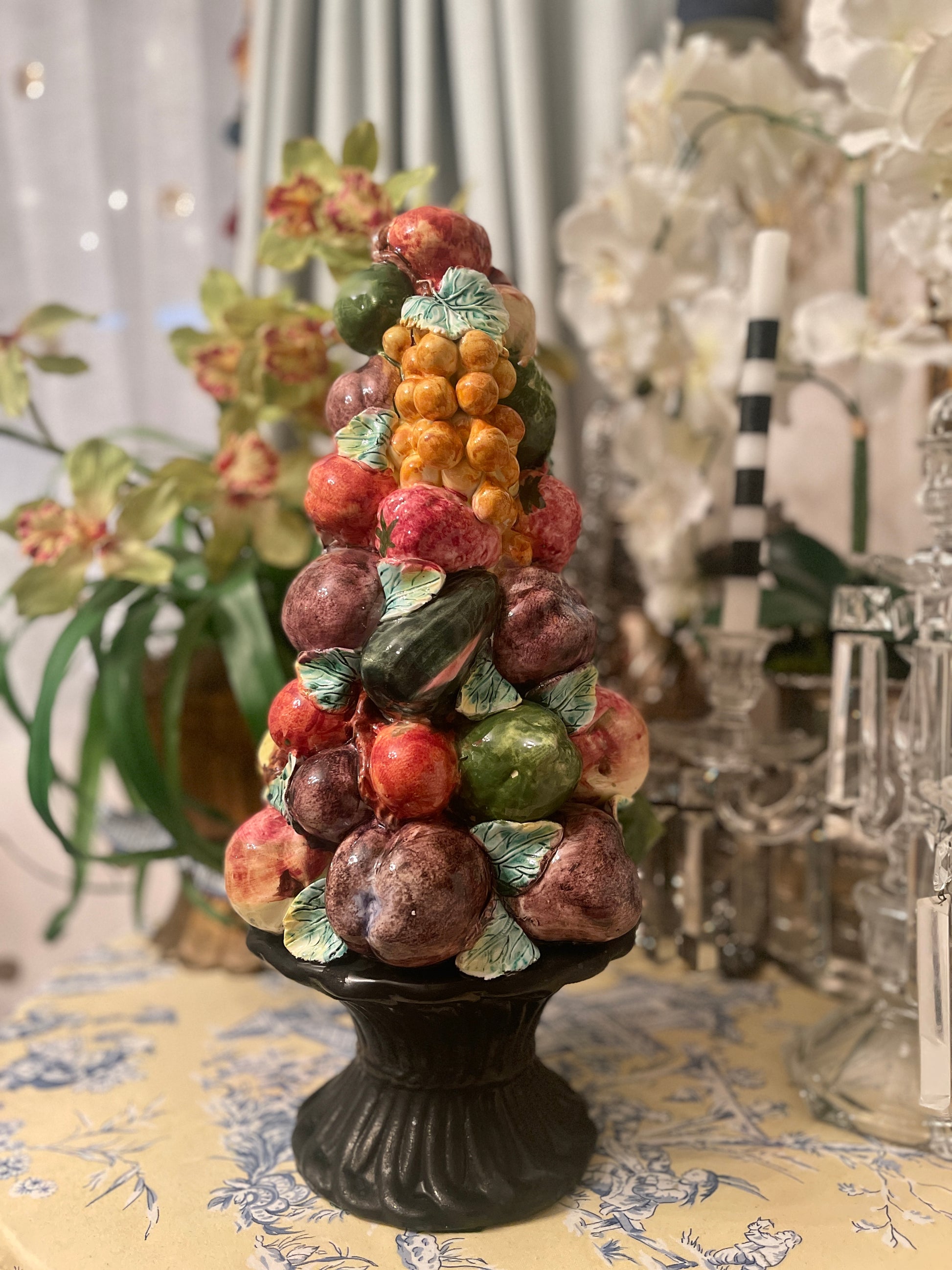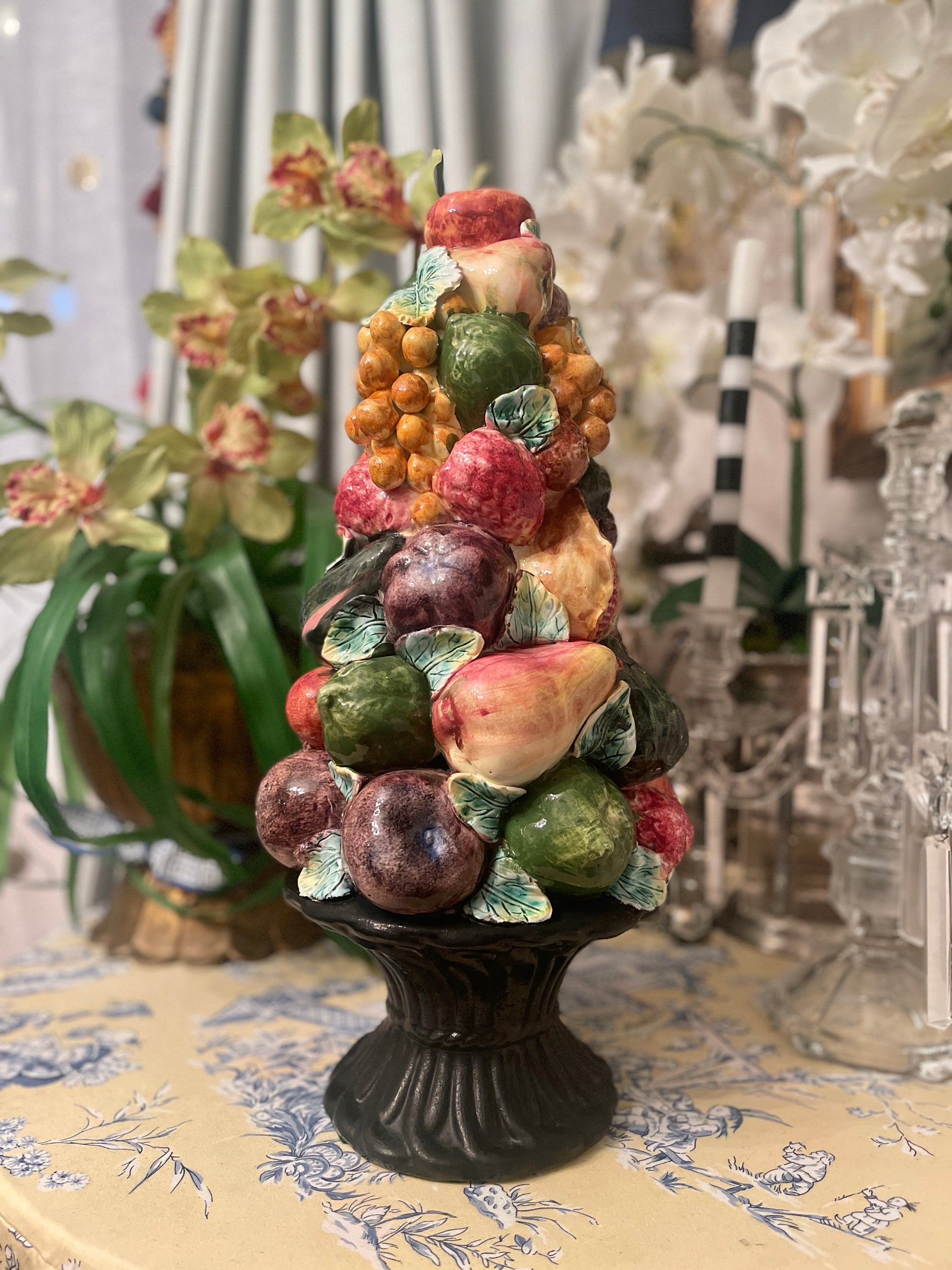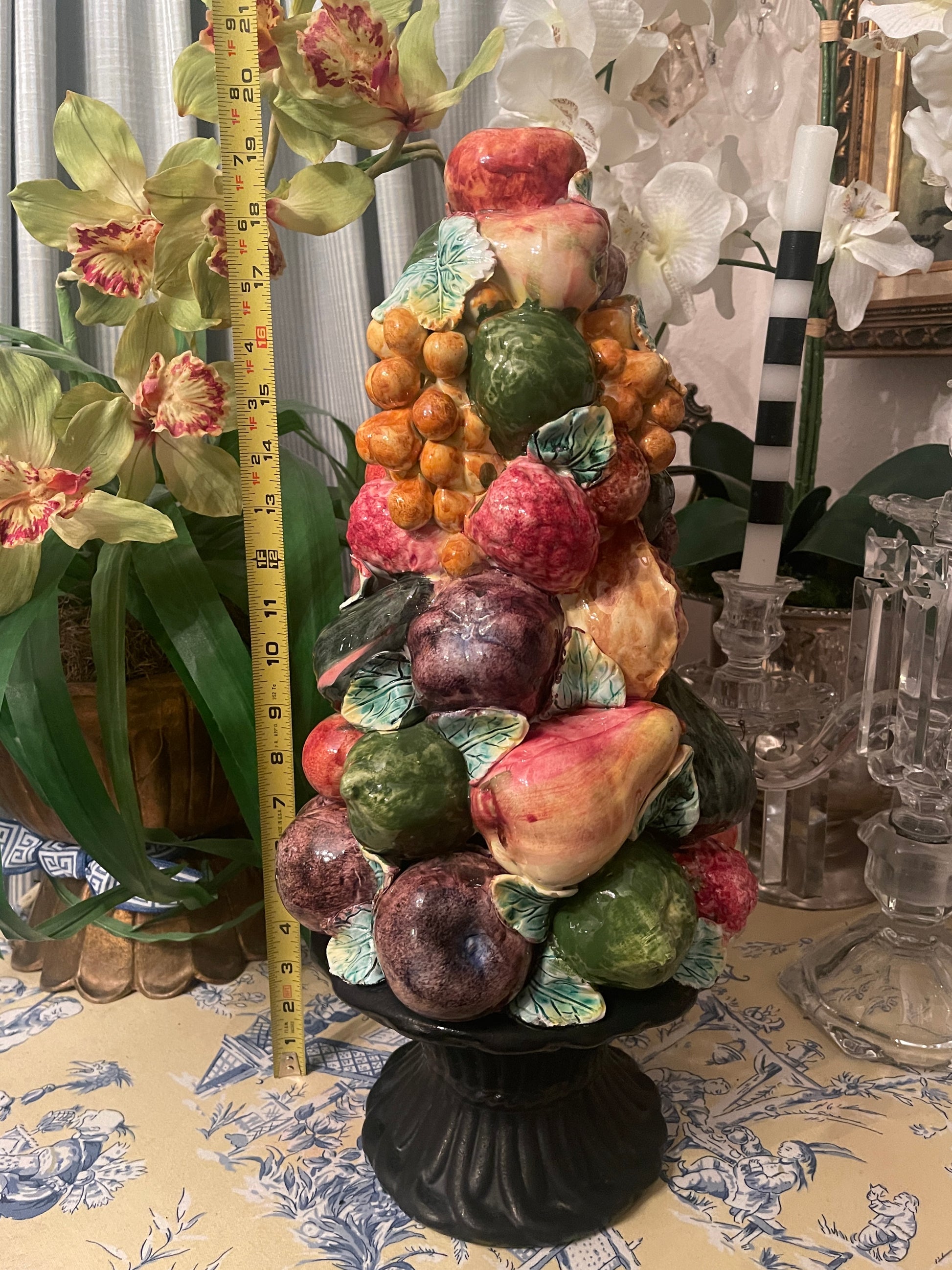 This vintage topiary is one of the loveliest I’ve seen… the variety of polychrome fruits including pomegranates, bananas, and oranges, just to name a few, make this piece visually interesting from all sides. Your eyes end dance from one piece to the next and the fact that they're ‘stacked’ in a black vessel is unique.