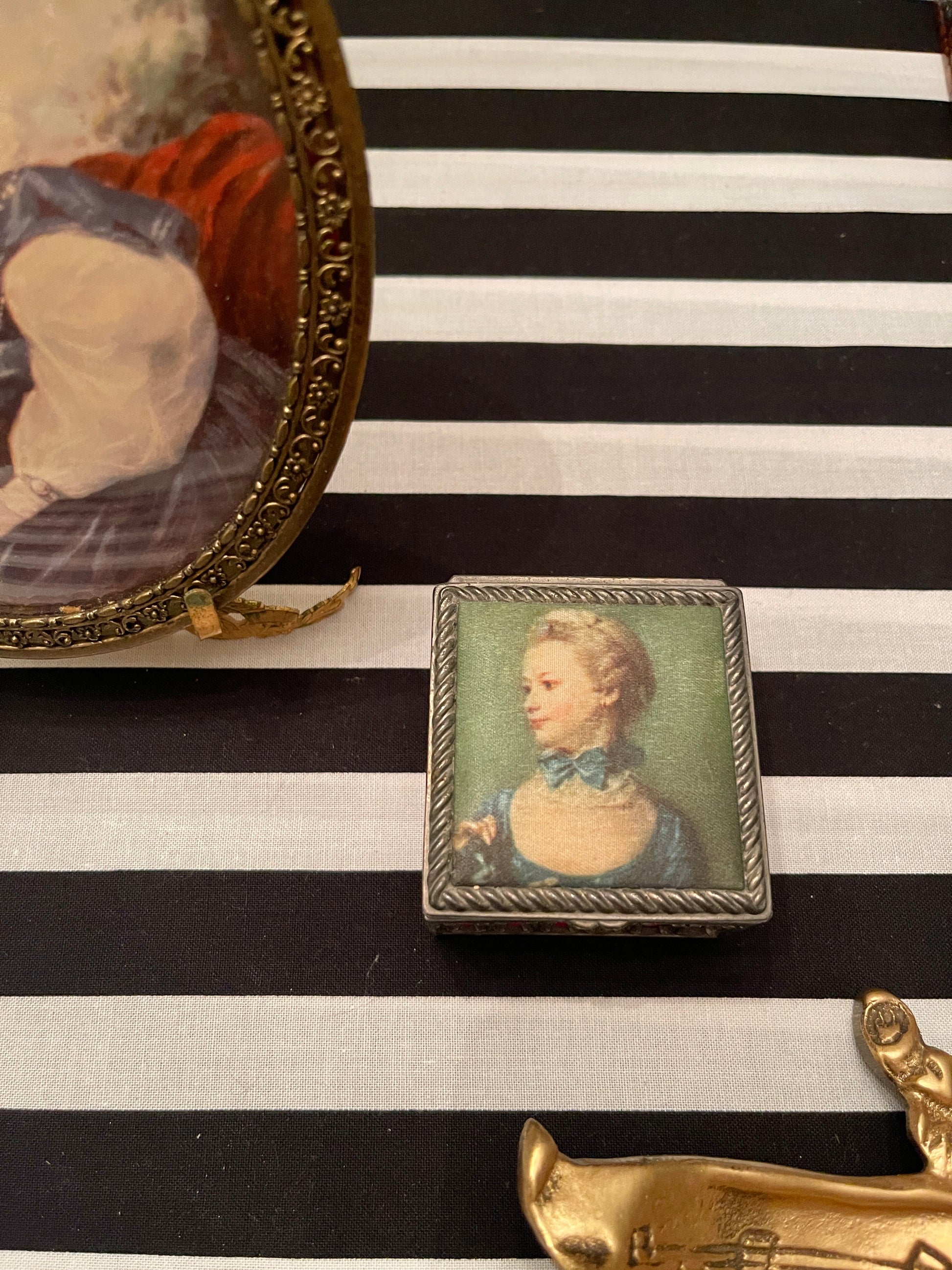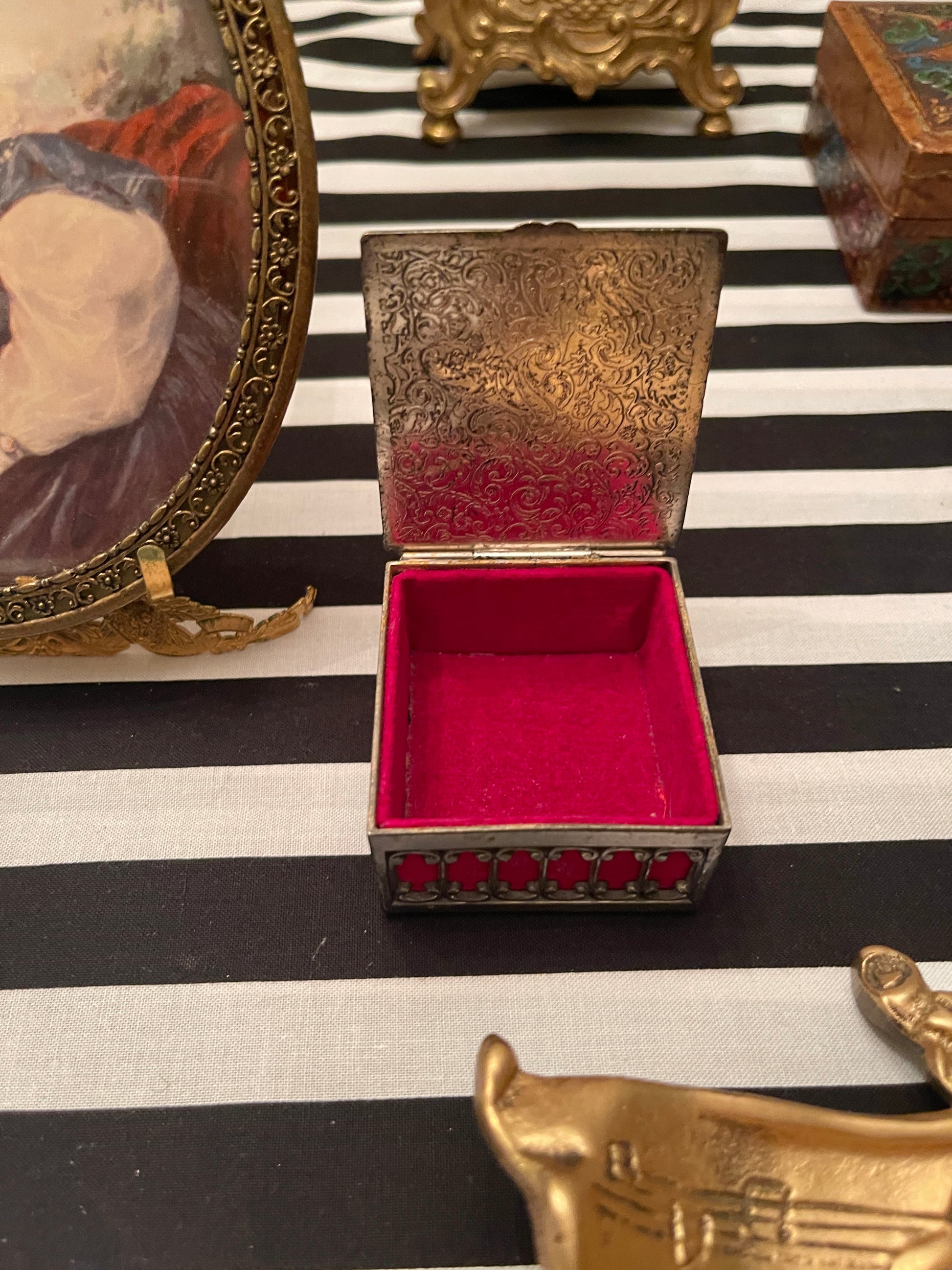 Sweet vintage Victorian hinged portrait box with the loveliest mademoiselle in a blue bow on silk, an open filigree design, and lined with red velvet. Made in Japan.