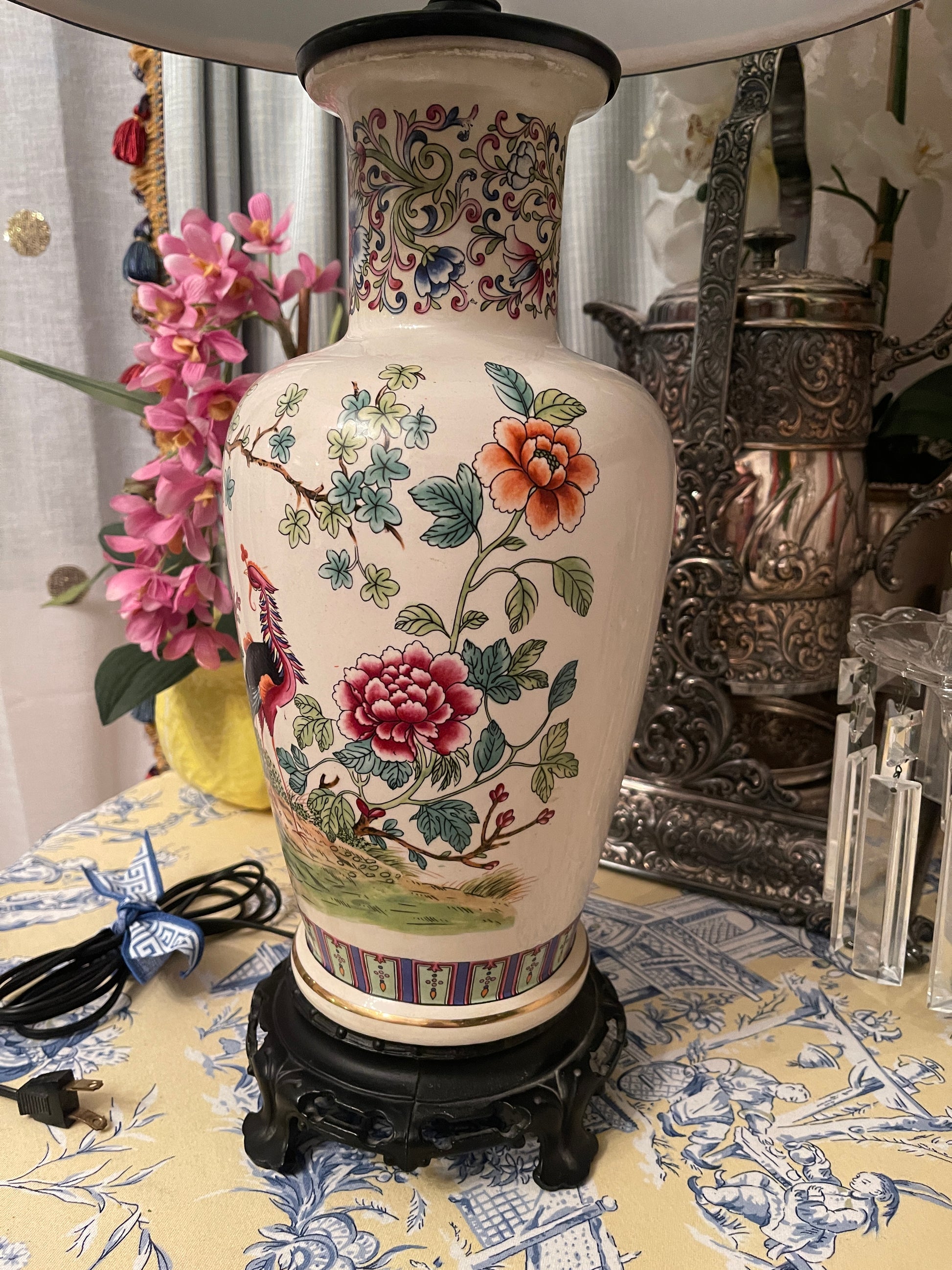 Vibrant Vintage Double Phoenix and Floral Chinoiserie Lamp.
