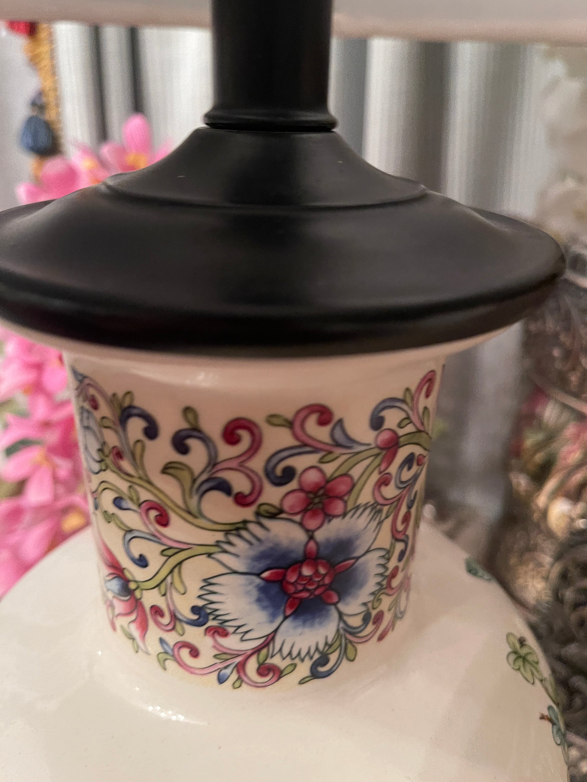 Beautifully detailed blooming botanicals, swirling acanthus with a glorious pair of Chinese Phoenix adorn this vibrant vintage table lamp. Shades of blue, pink, orange, and green create this lovely chinoiserie paradise. Asian symbols in red, black ornate footed metal base and cap add to the charm.