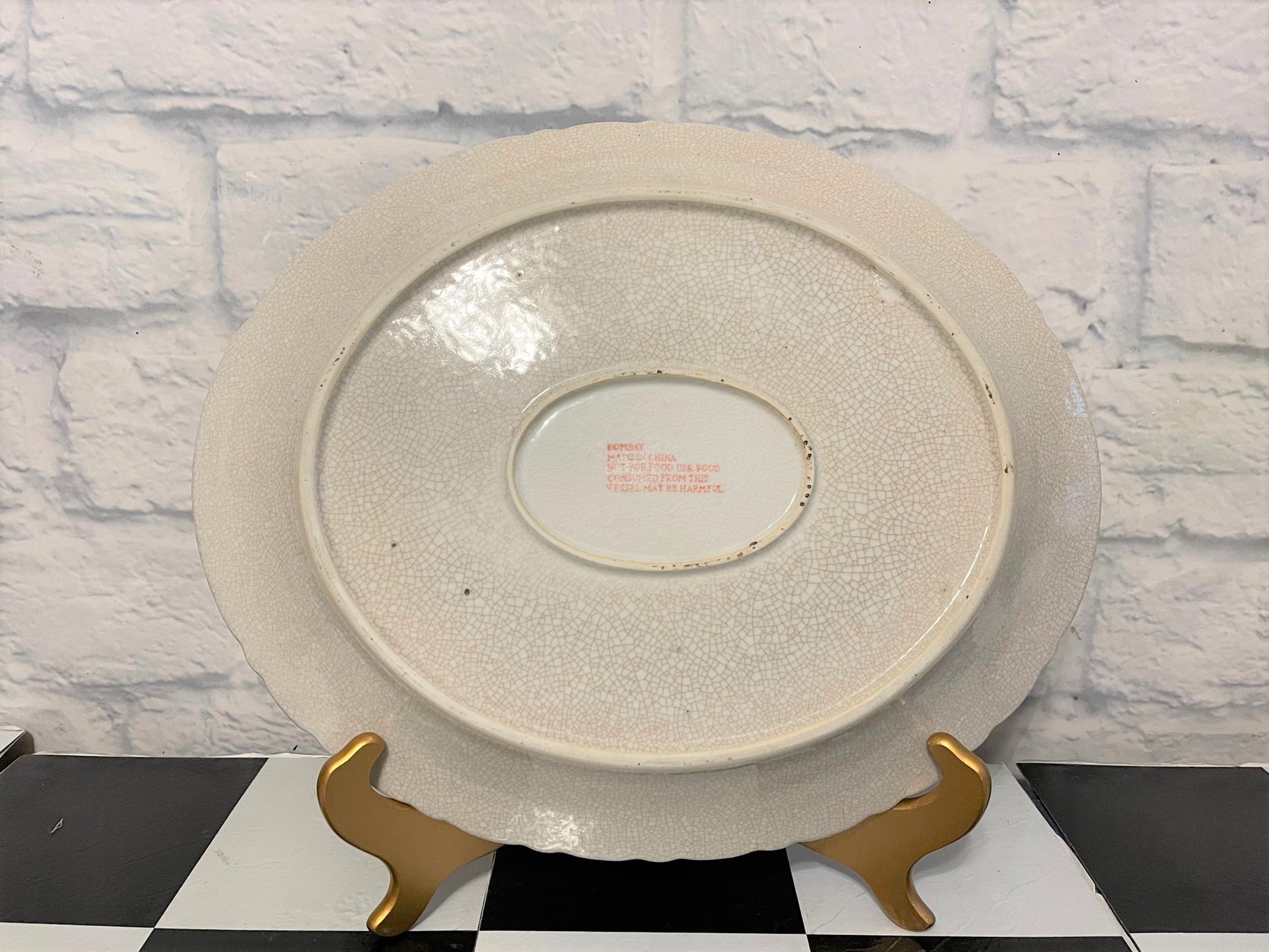 This LARGE Bombay Platter features a stately floral design over the entire piece. Some of the flowers look to be peonies and lotus blooms with chrysanthemums on the scalloped edged handles. It has intentional crazing throughout and a few little blemishes in the original finish, but nothing that detracts from its beauty or displayability. Fantastic condition and quality.