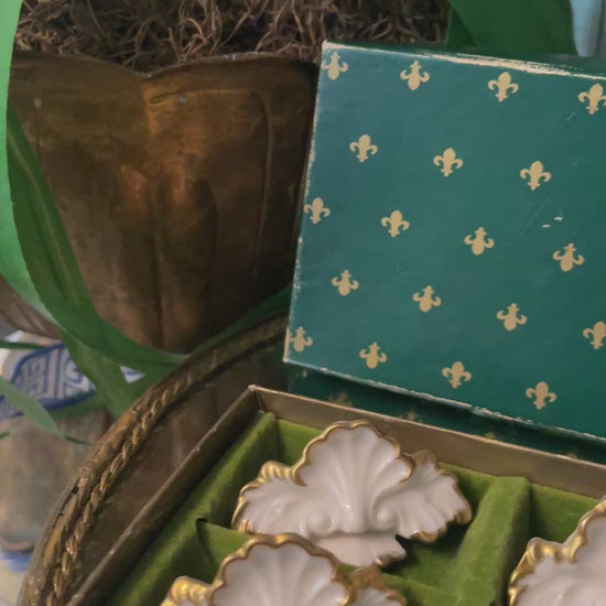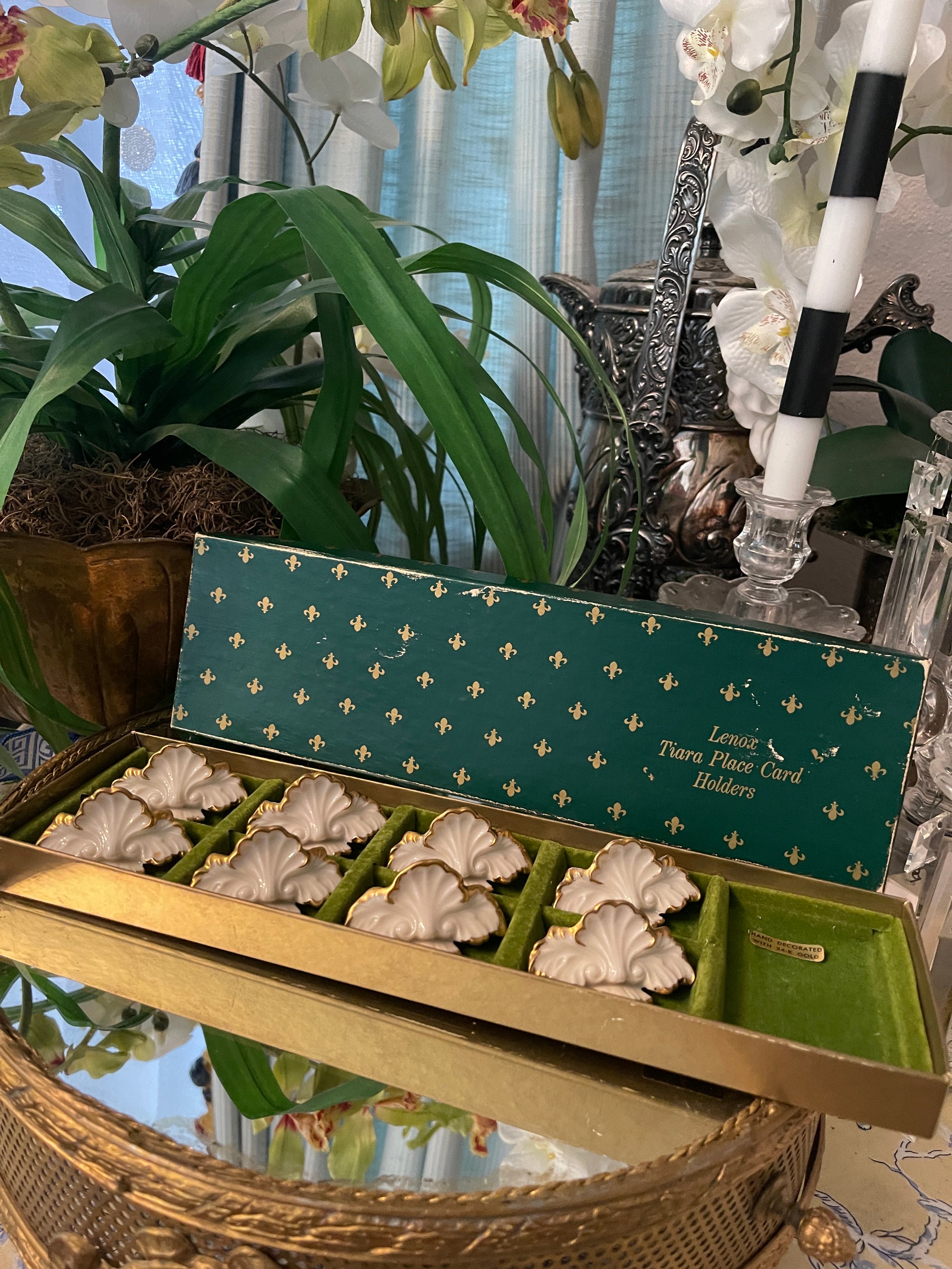Elevate your tablescapes with this exquisite set of eight vintage Lenox “Tiara” Place Card Holders, beautifully preserved in their original green-and-gold presentation box. Crafted from classic Lenox ivory porcelain and accented with hand-applied 24K gold, each holder features the elegant fan-shell motif that defines the Tiara line—timeless, refined, and effortlessly sophisticated.