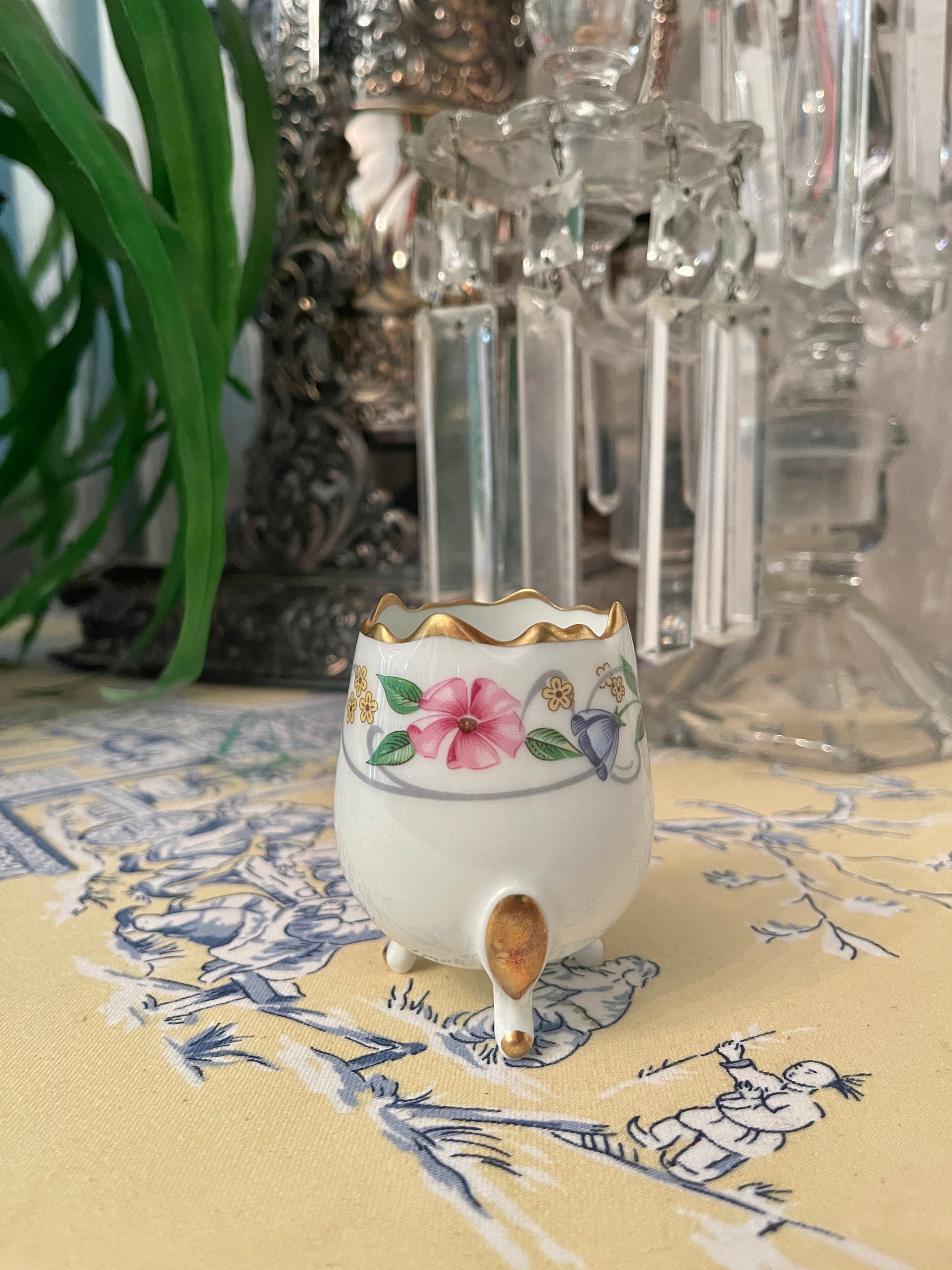 Vintage Limoges footed Egg Salt Cellar, Vase, Toothpick Holder. Beautifully hand painted with flowers in pink, purple, and yellow with green vibes and leaves with gilt detail. Made in France.