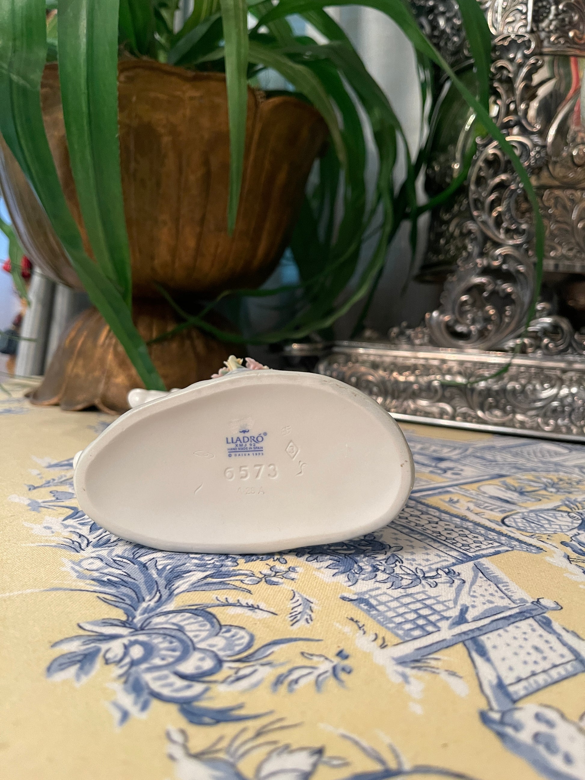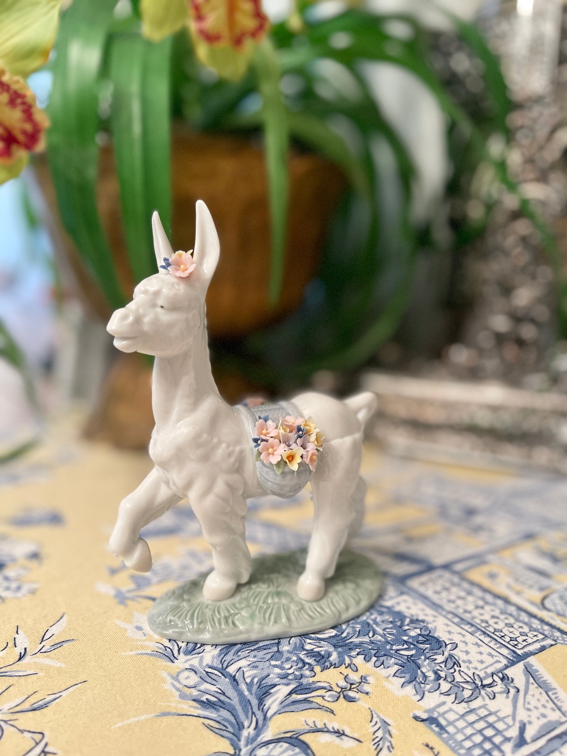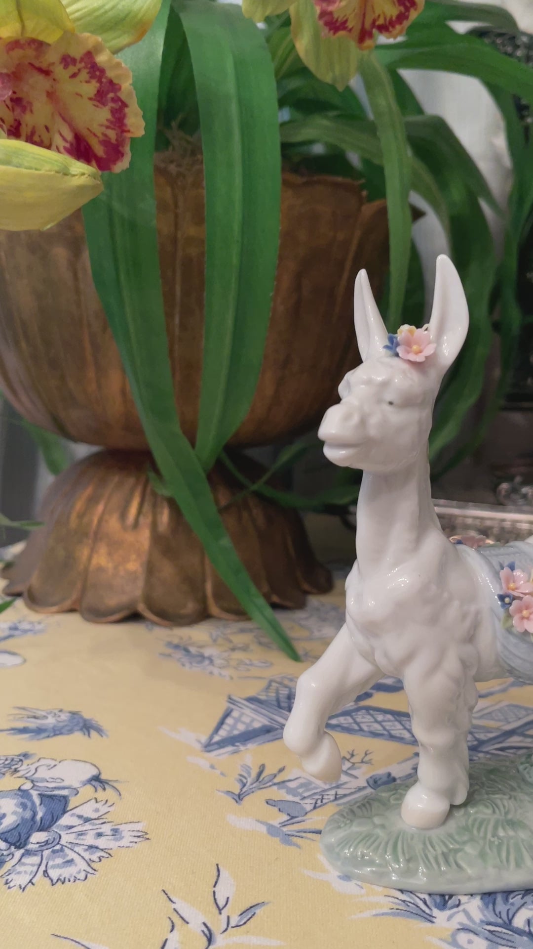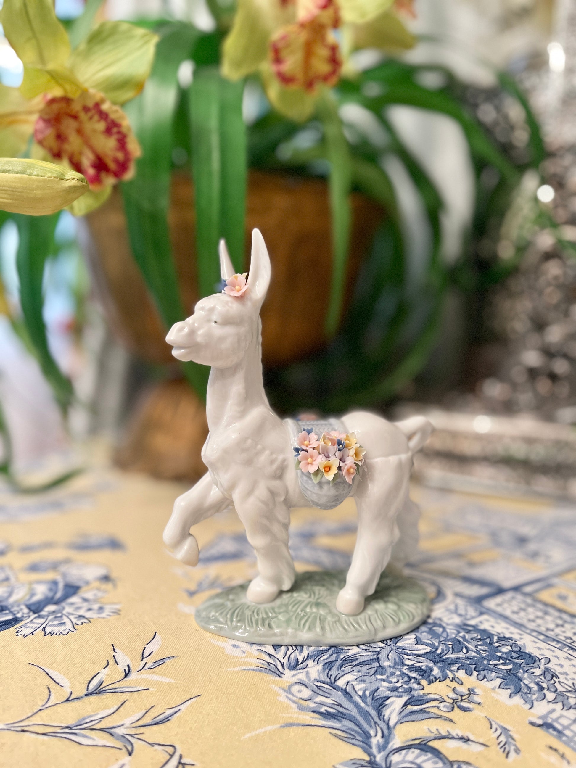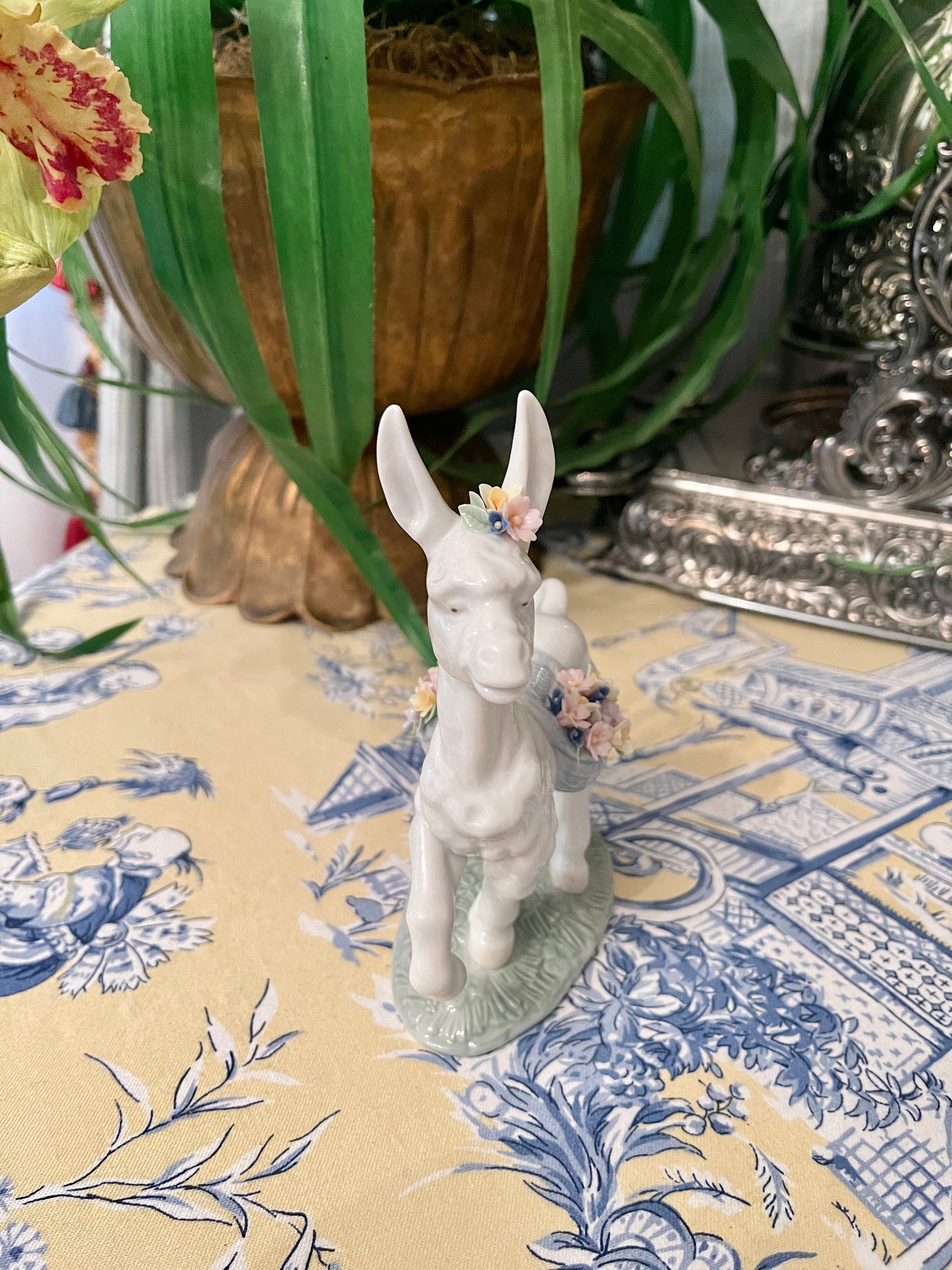 Vintage Lladro Parading Donkey. This prancing prince with his light blue baskets full of Spring flowers in pink, yellow, lavender, and cornflower blue with Green Leaves is such a charmer. Hand-painted and crafted in Spain.