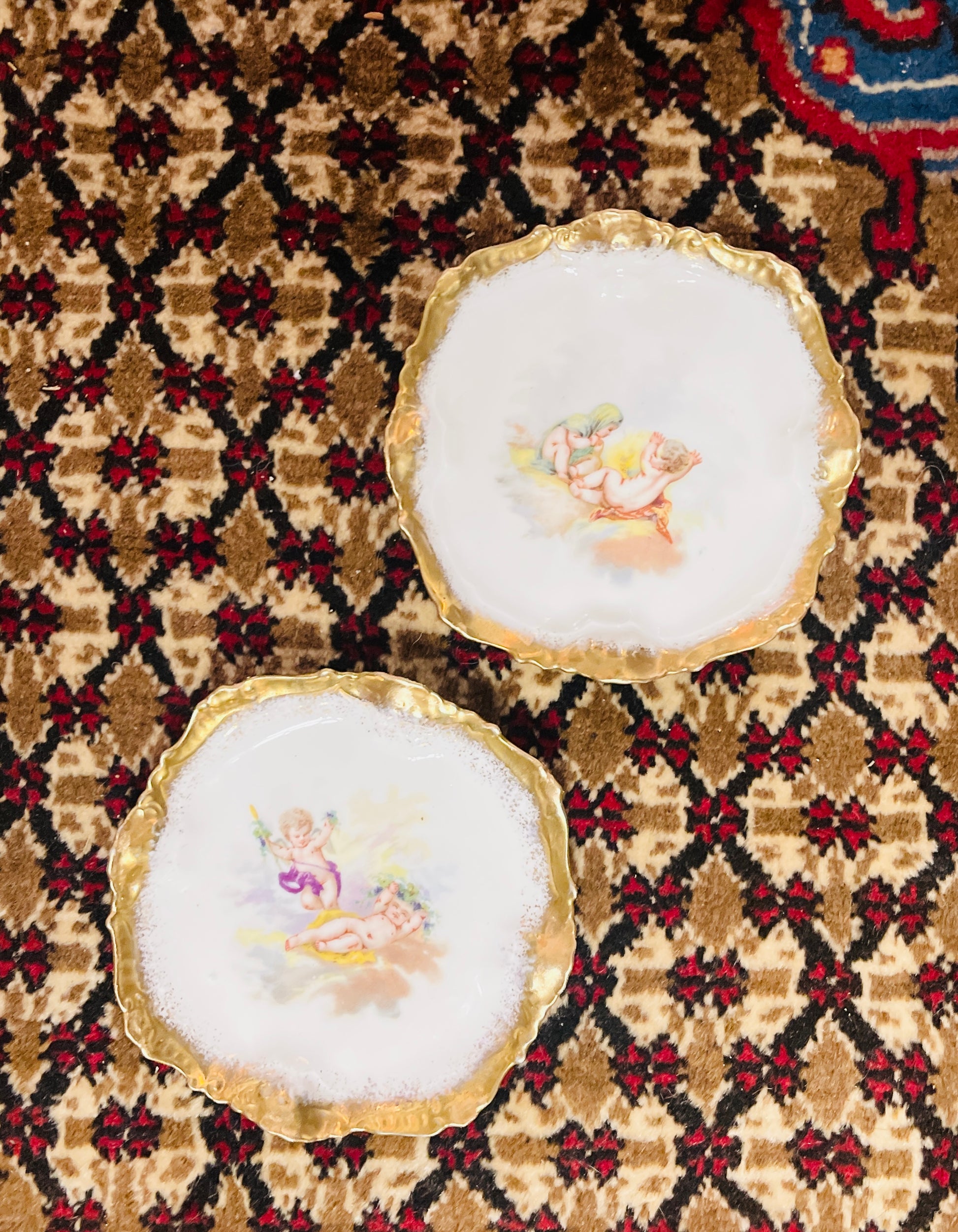 Each plate measures 5.5” in diameter and is in excellent antique condition, with no chips, cracks, or repairs. The charming putto or cherub at the center is a fine example of Victorian sentimentality, often used in Limoges designs meant for boudoir or parlor display.