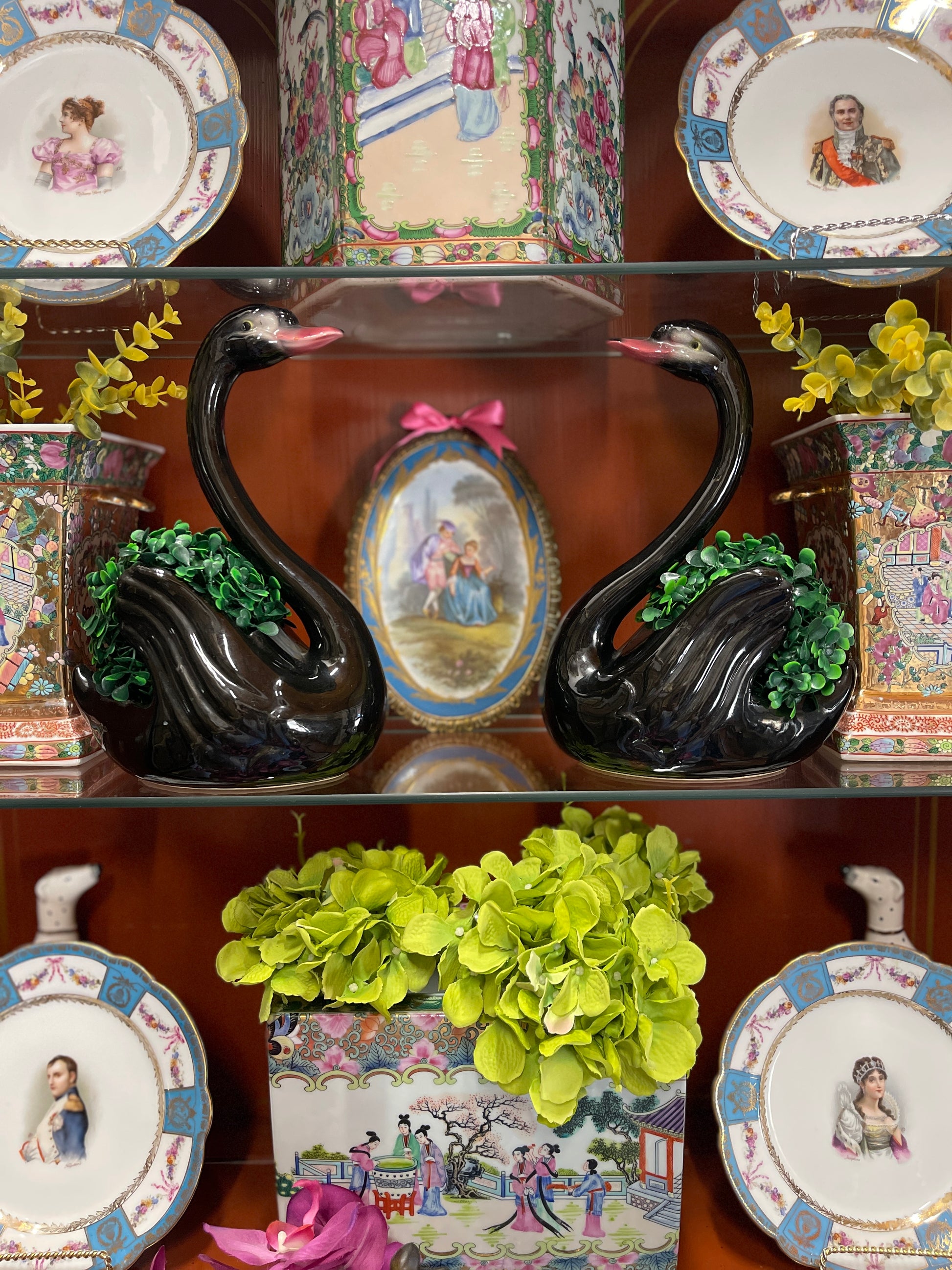 My very first thought when I saw this FAB pair was… Jackie Kennedy swans!! These gorgeous pieces are in a high gloss black with the prettiest pink beaks. Made by William Maddux, a ceramic potter in California famous in the 1930s-1950s for his bird figures, particularly the black swans. I am thrilled to have found a pair, especially in this lovely condition.