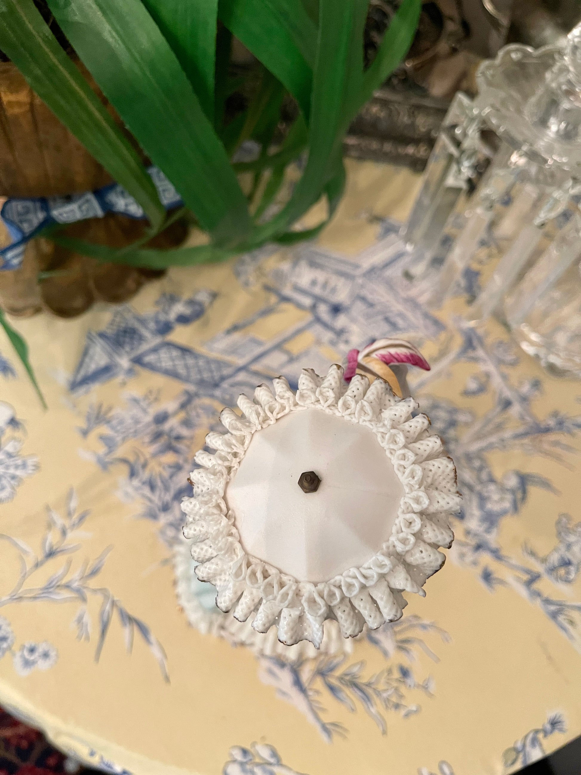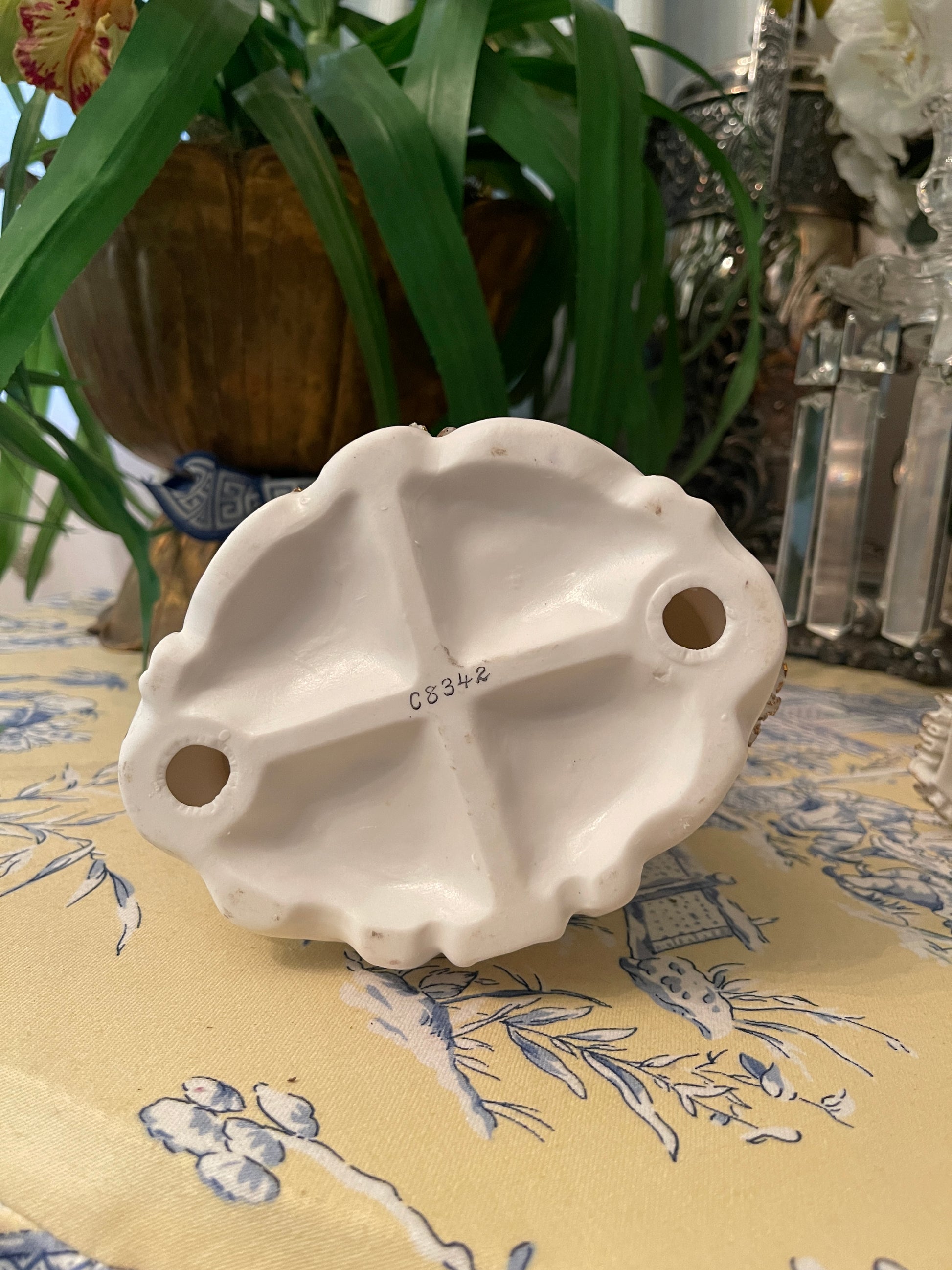 This vintage porcelain figural statuette is DIVINE! She’s giving full on Bridgerton vibes… she is beautifully hand painted in a French blue and white gown with applied flowers holding a parasol, ‘Dresden’ lace, and flowers in her hair.