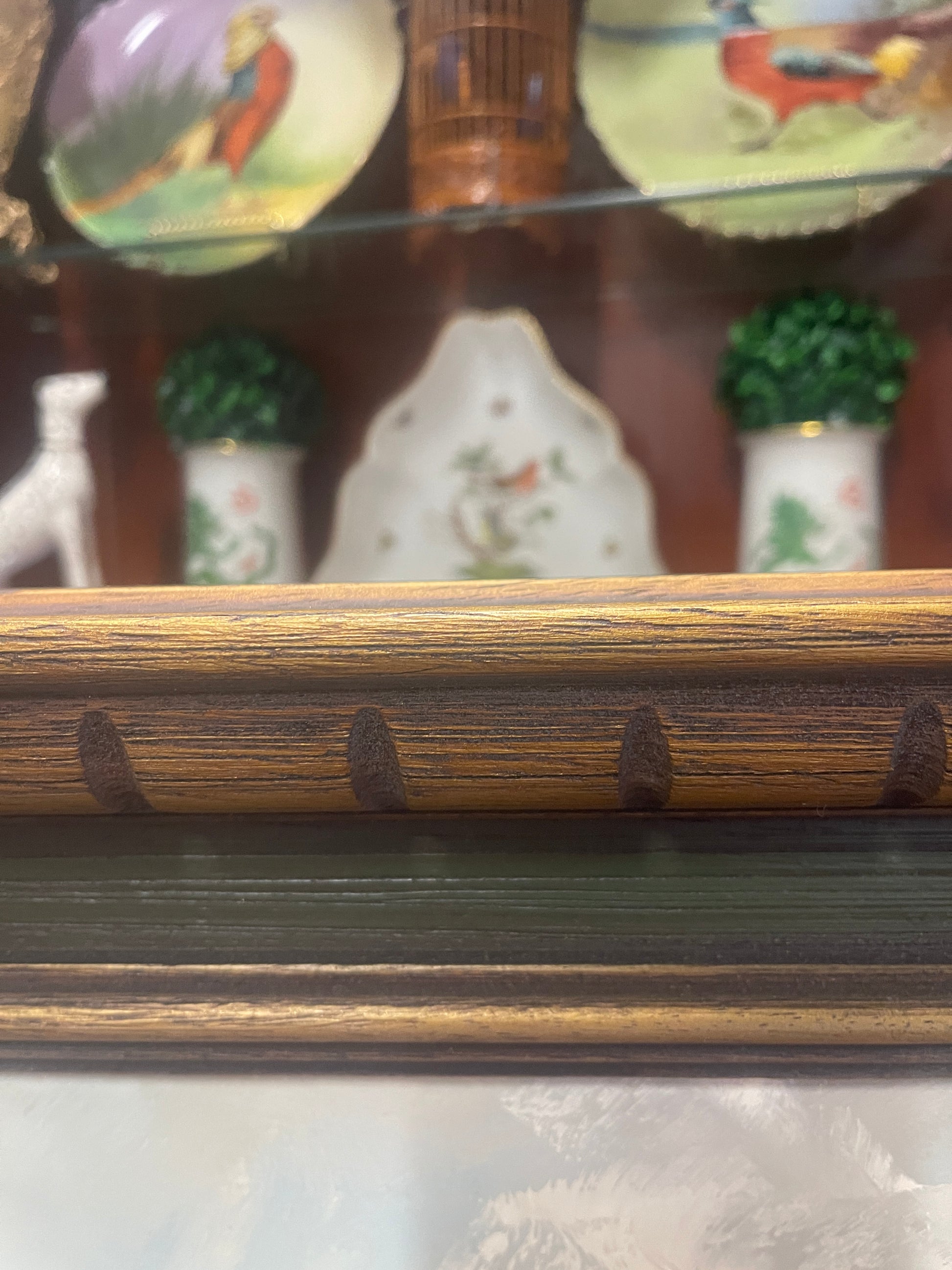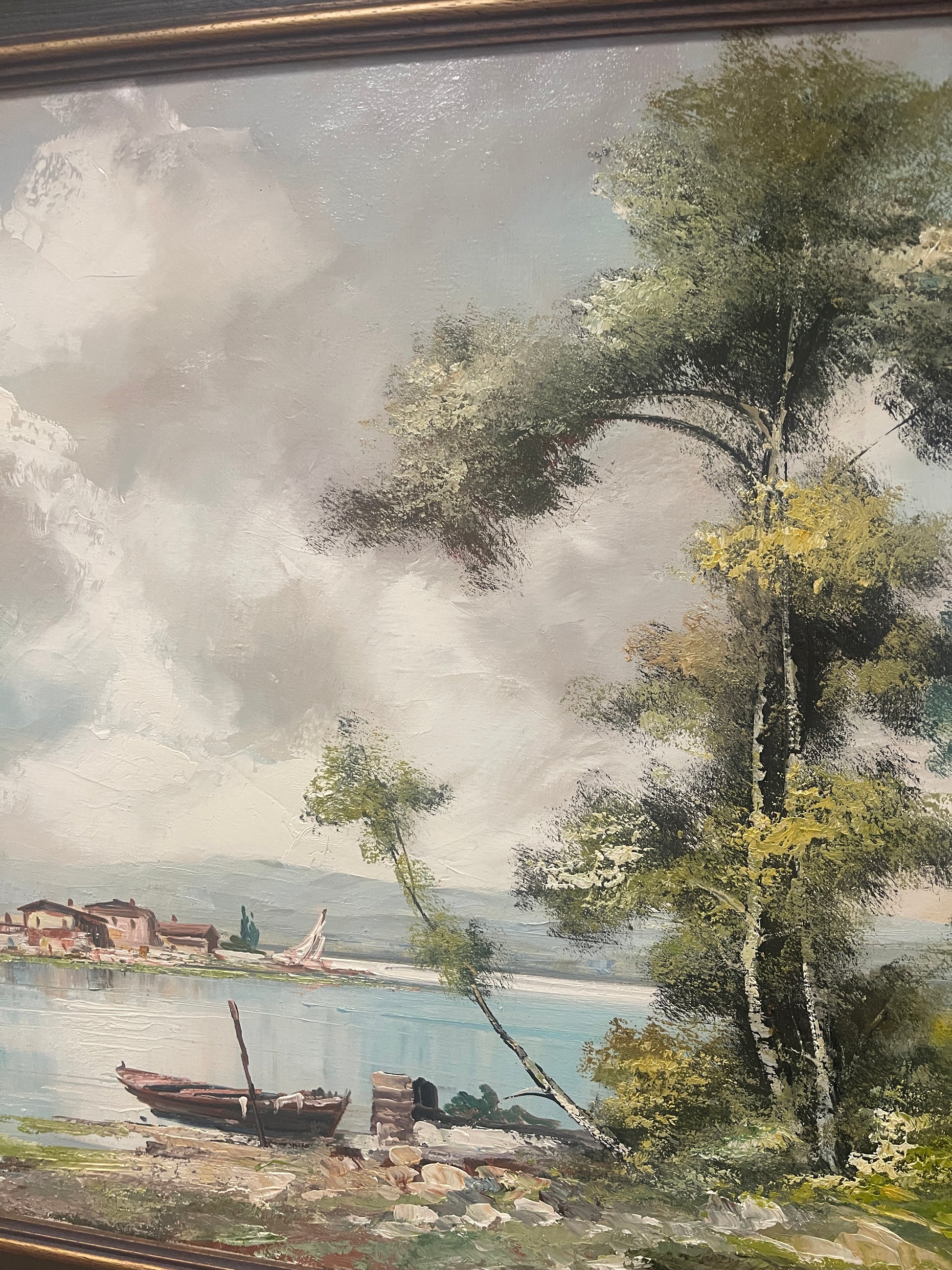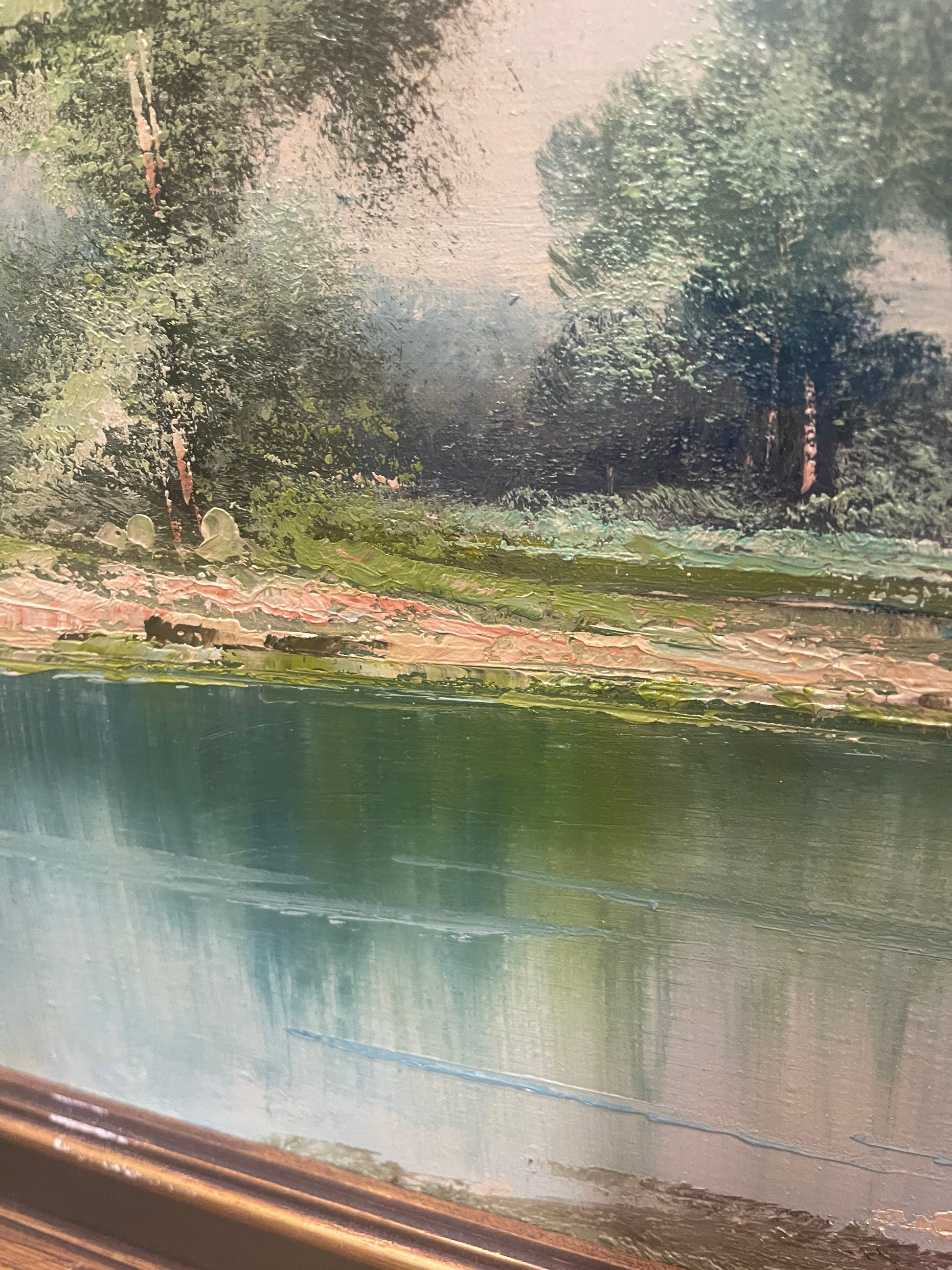 This is one of those pieces that immediately draws you in… it’s so beautifully done with crisp colors and heavy palette knife work. I love the technique in the water making it look like ripply. So, so good! It’s signed in the lower right corner by the artist with a name plate. It’s framed in solid wood with a hanging wire attached.