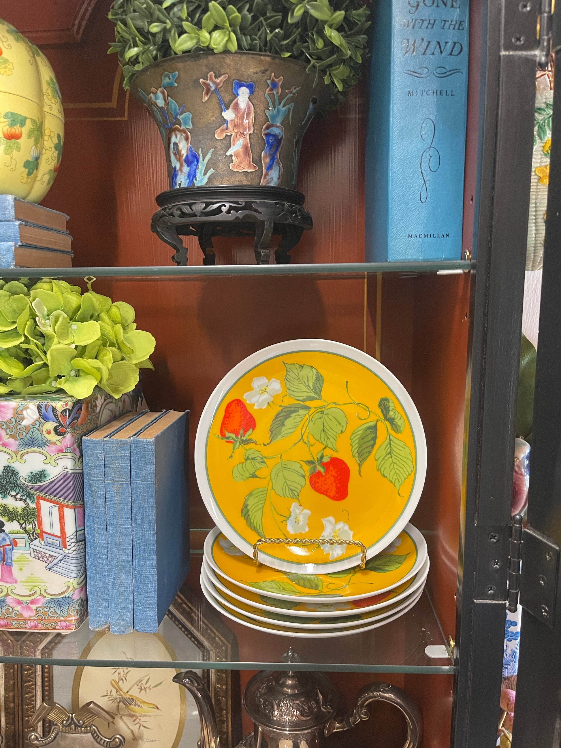 Vintage Neiman Marcus Strawberry Botanical Plates – Set of 5 | Bold Yellow with Red Strawberries & Morning Glories- Made in Japan