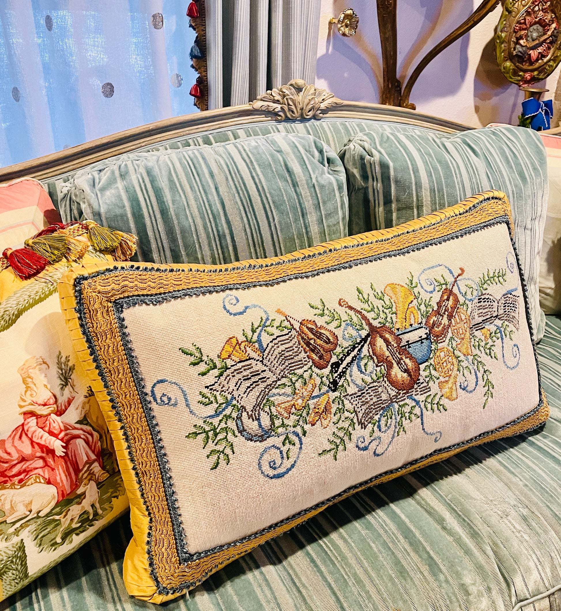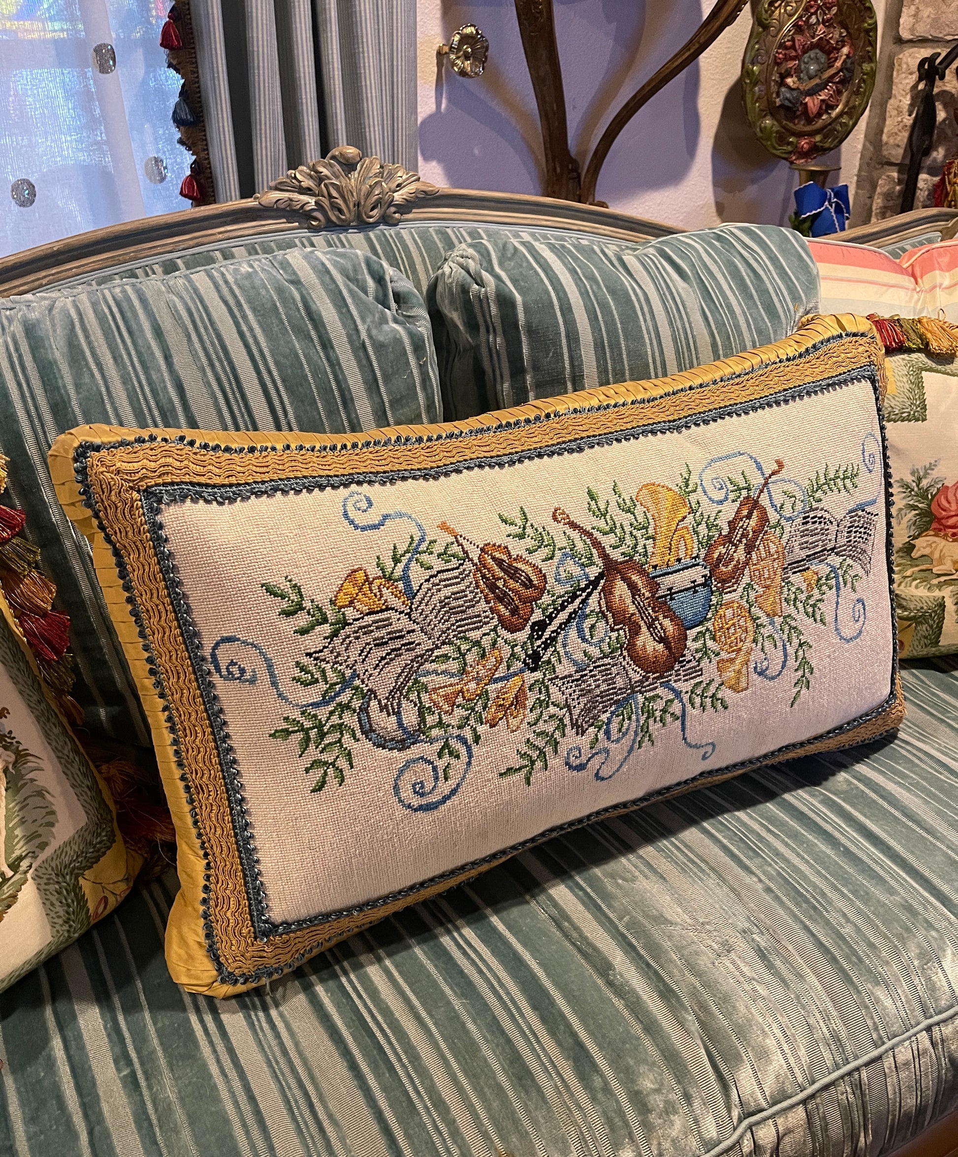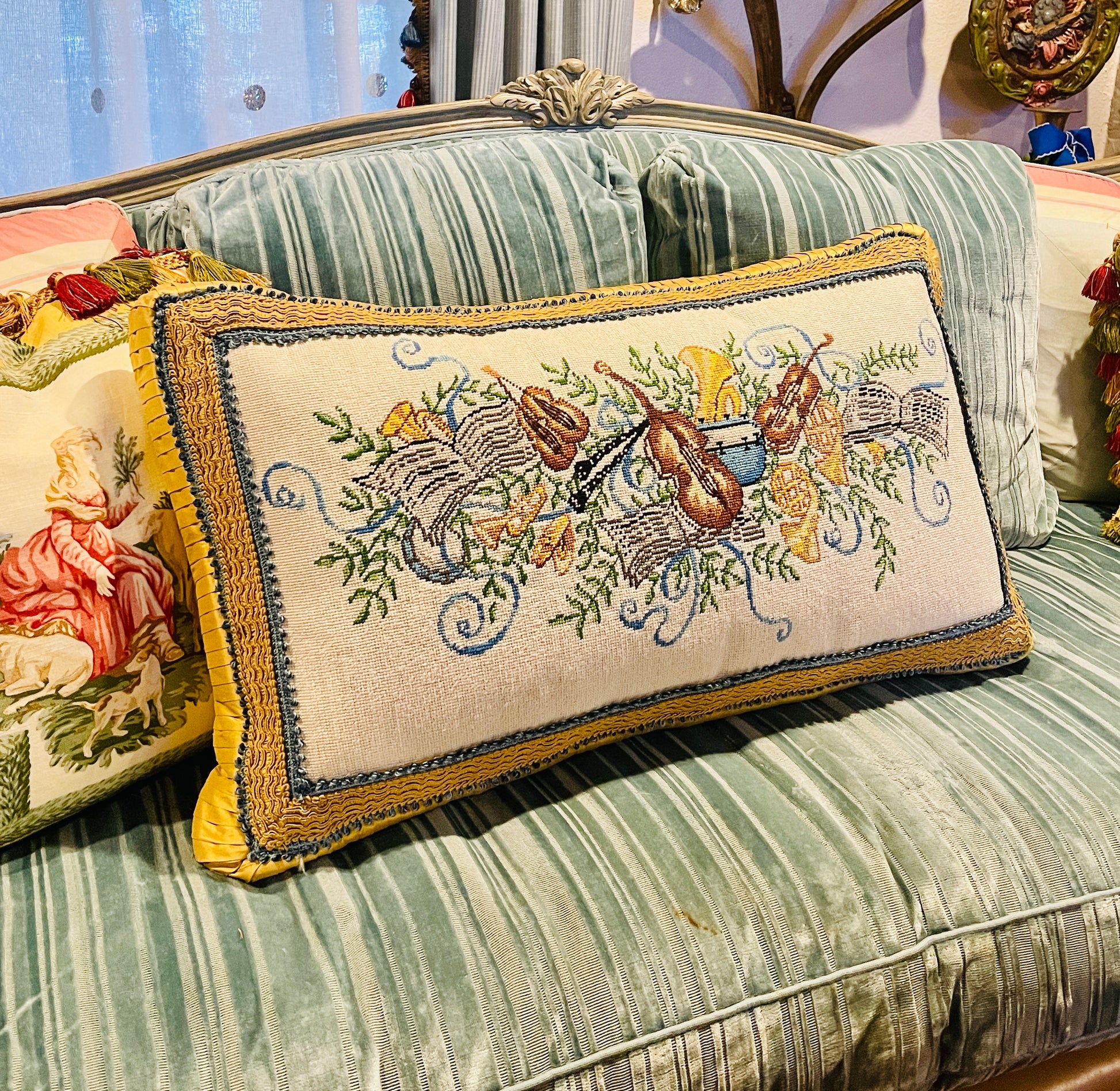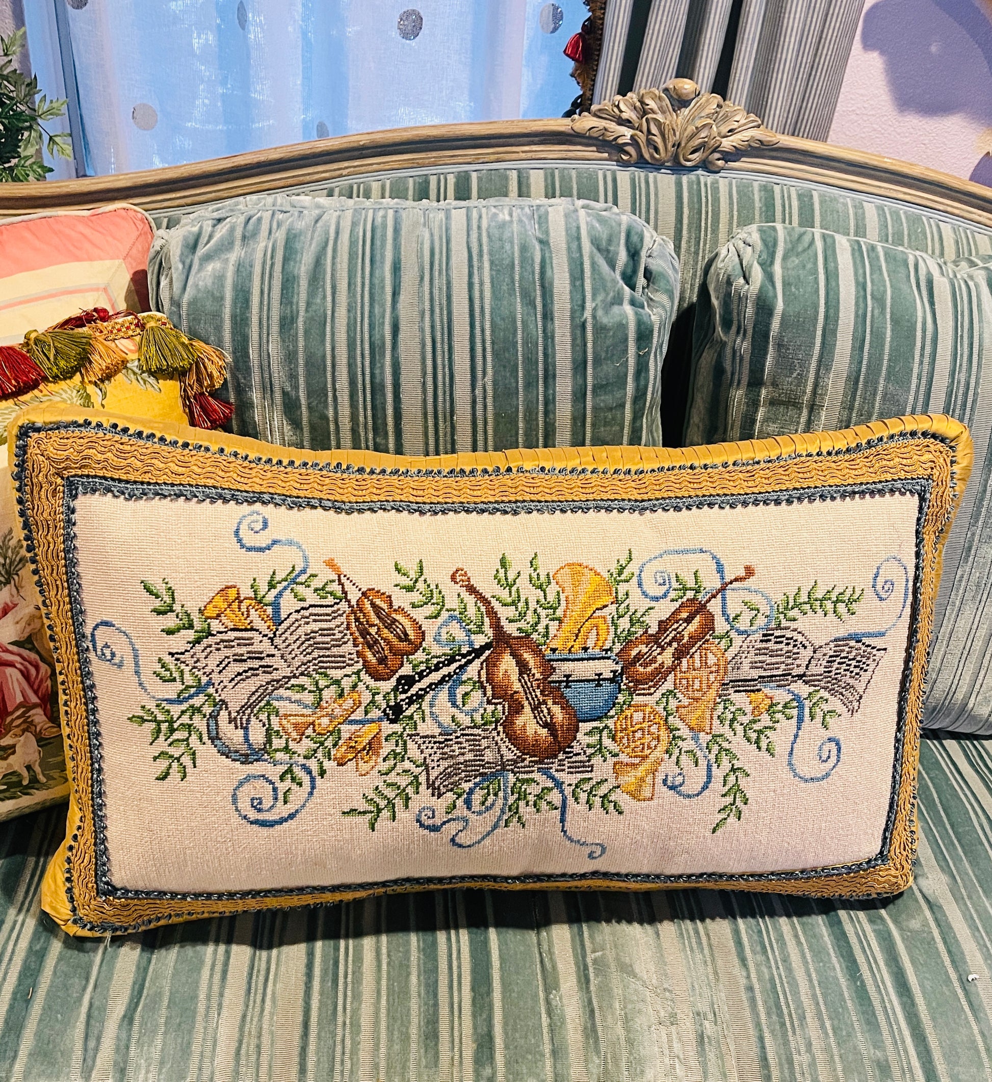 Vintage Needlepoint Pillow featuring musical instruments and sheet music. Beautifully trimmed in blue and gold fanciful trim with Gold shantung silk backing. This piece is the nicest vintage needlepoint I’ve had. The stitch, finishing work, and materials are superb.