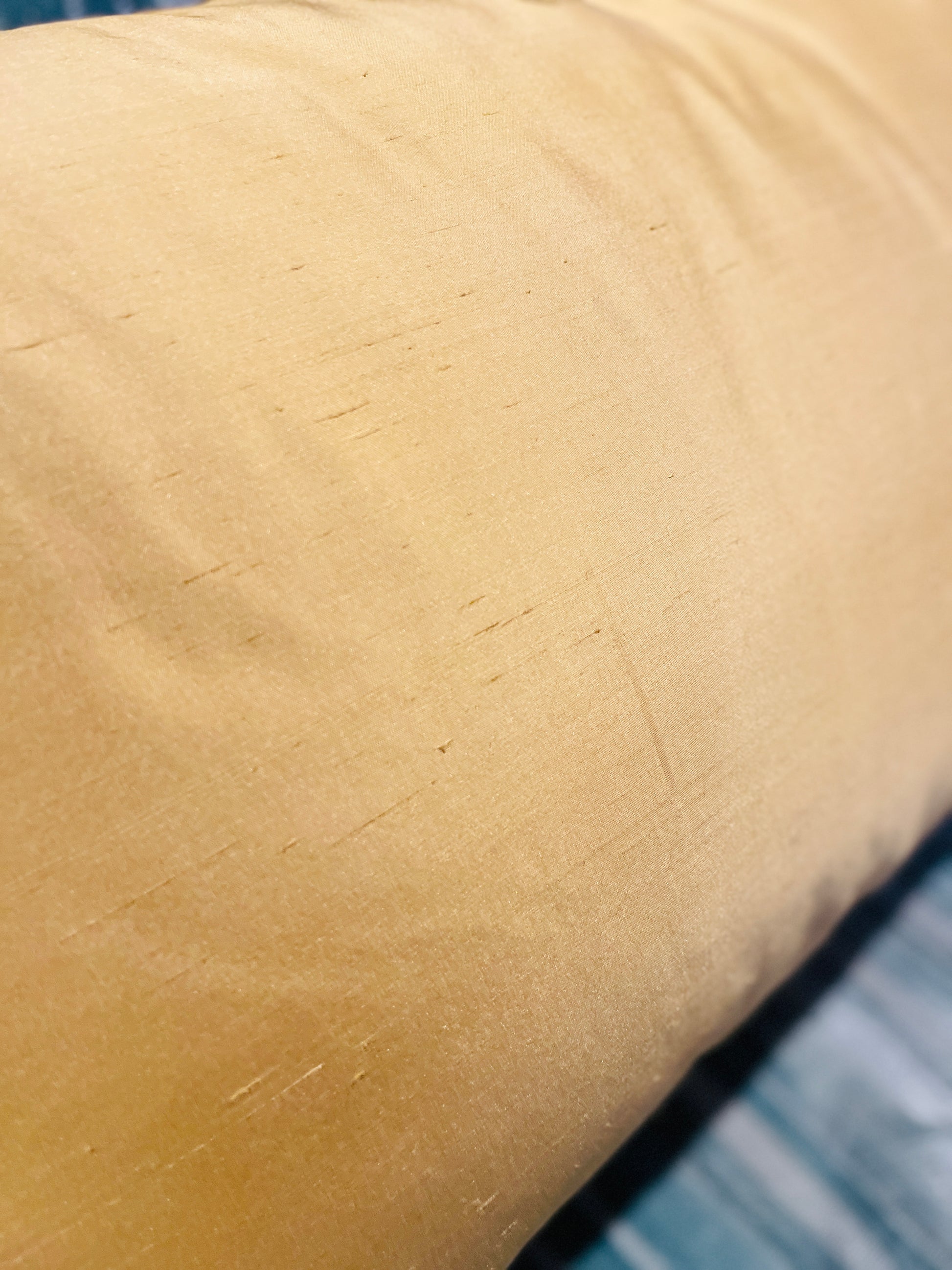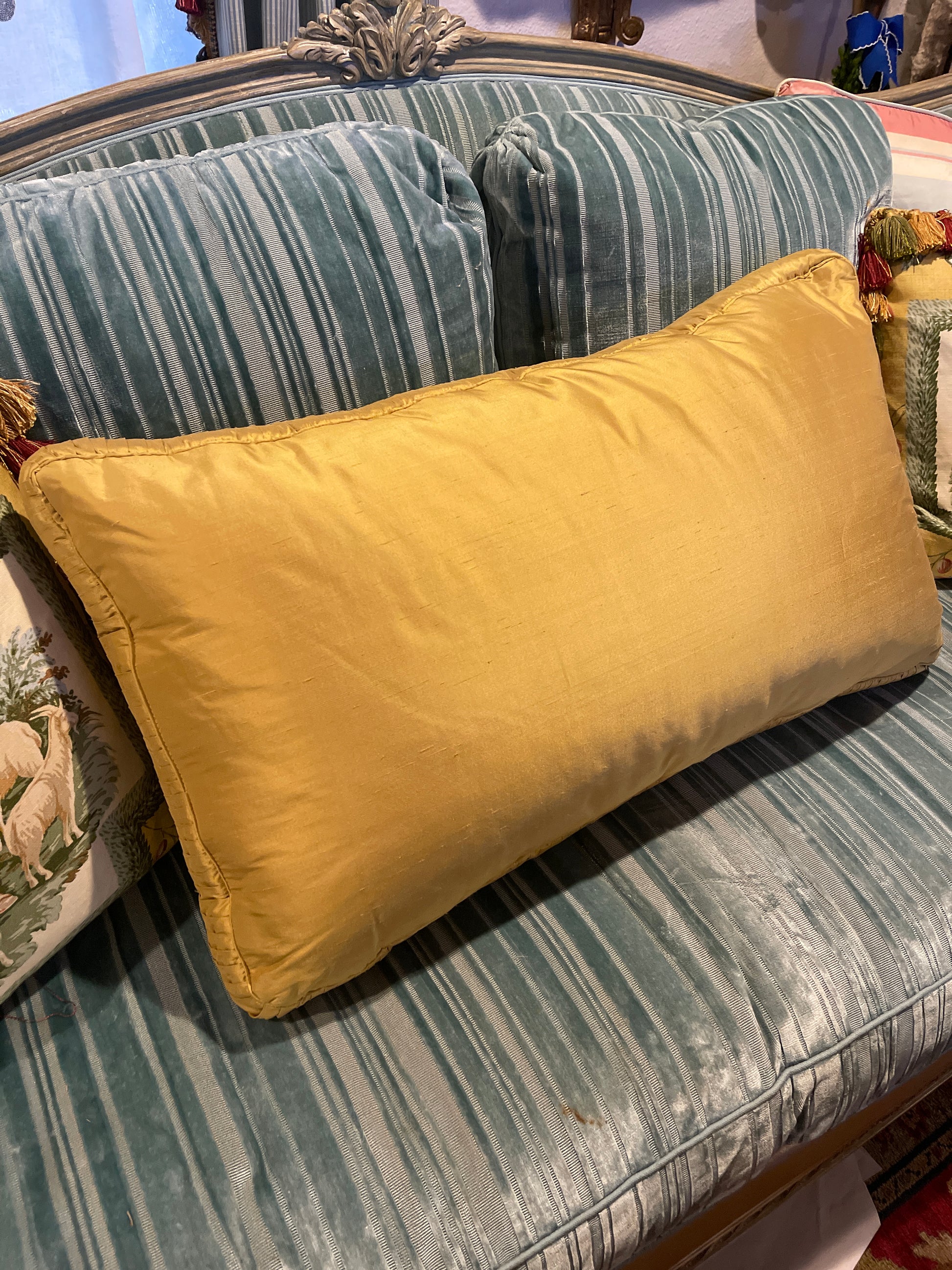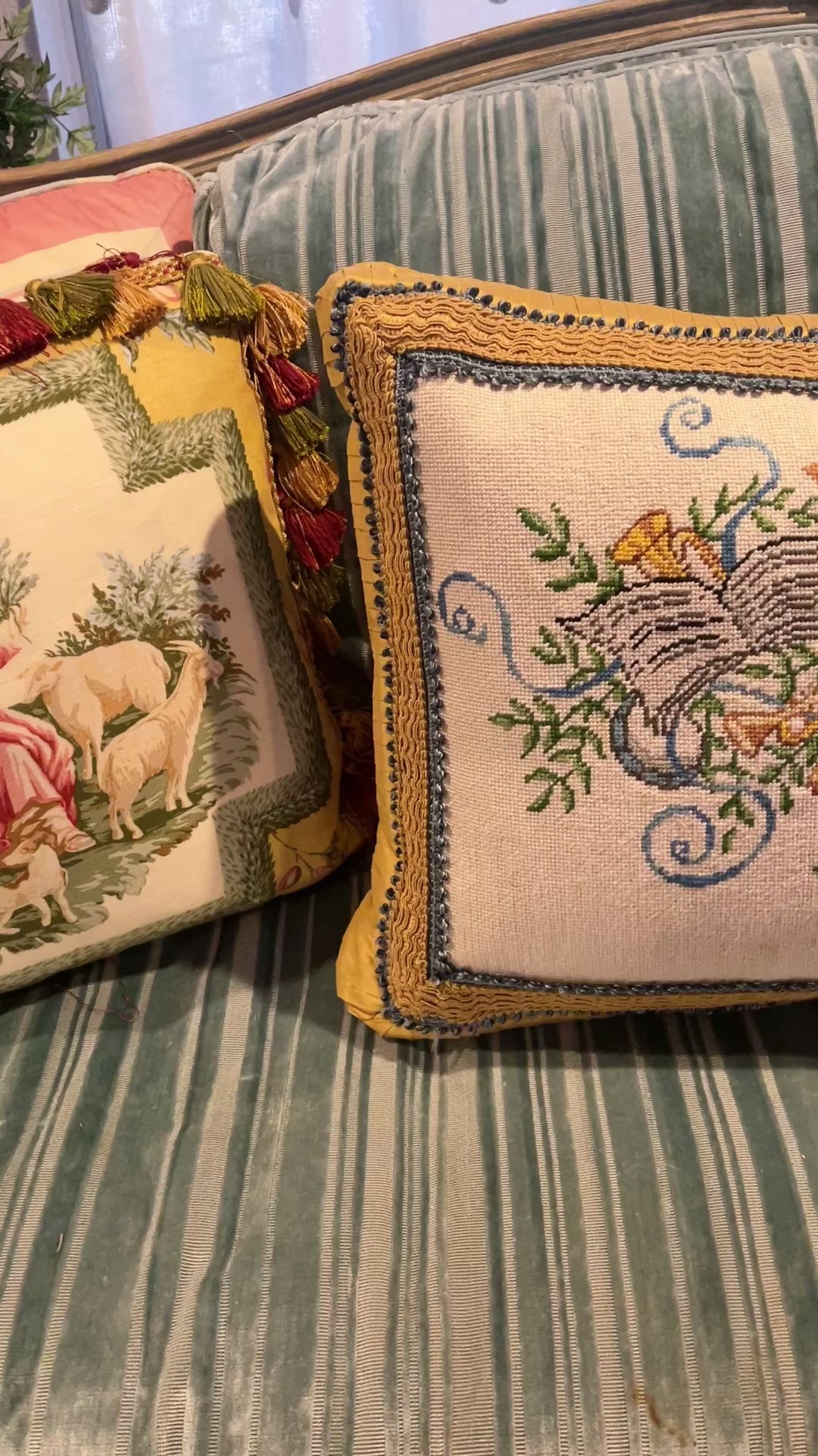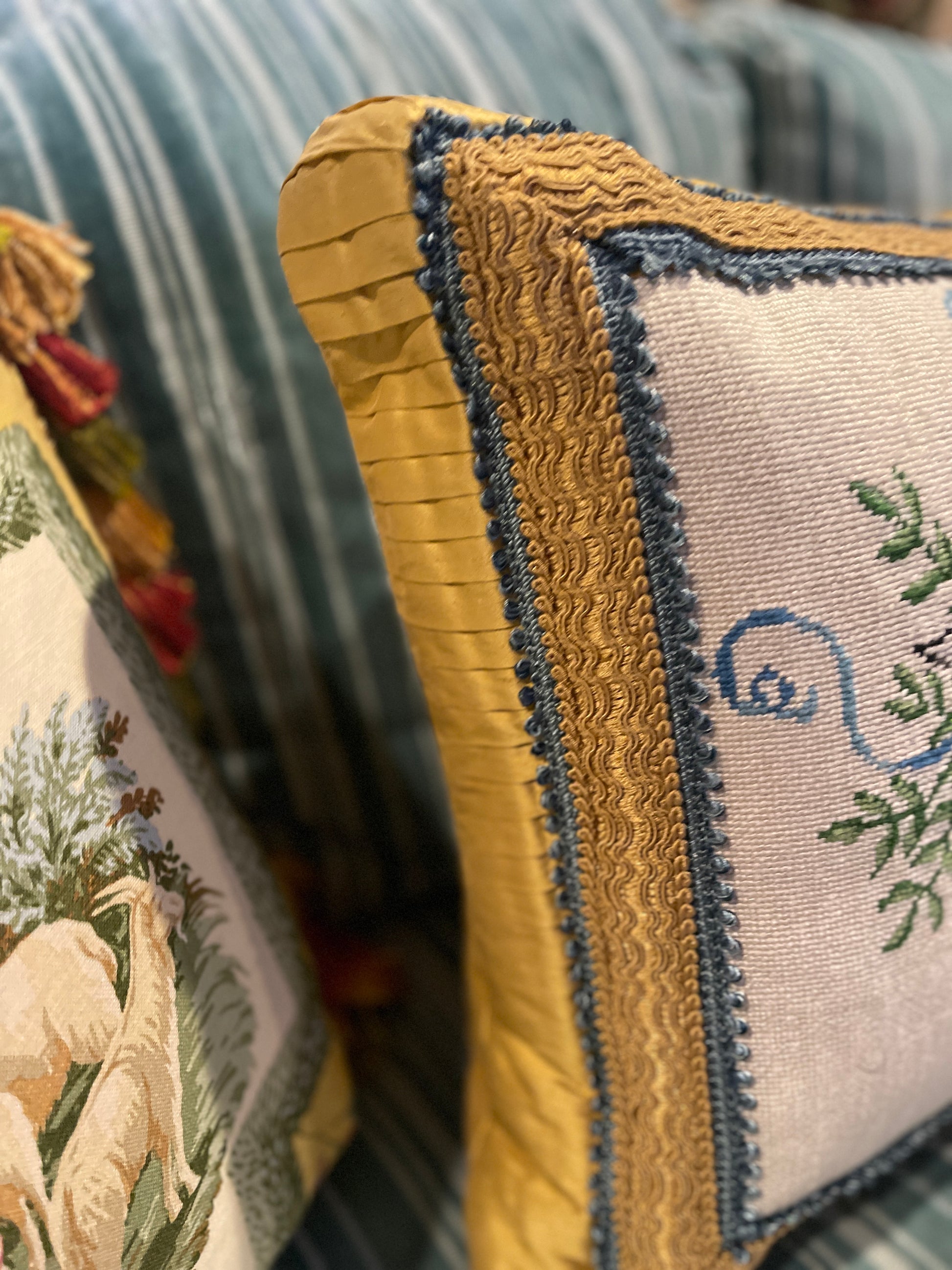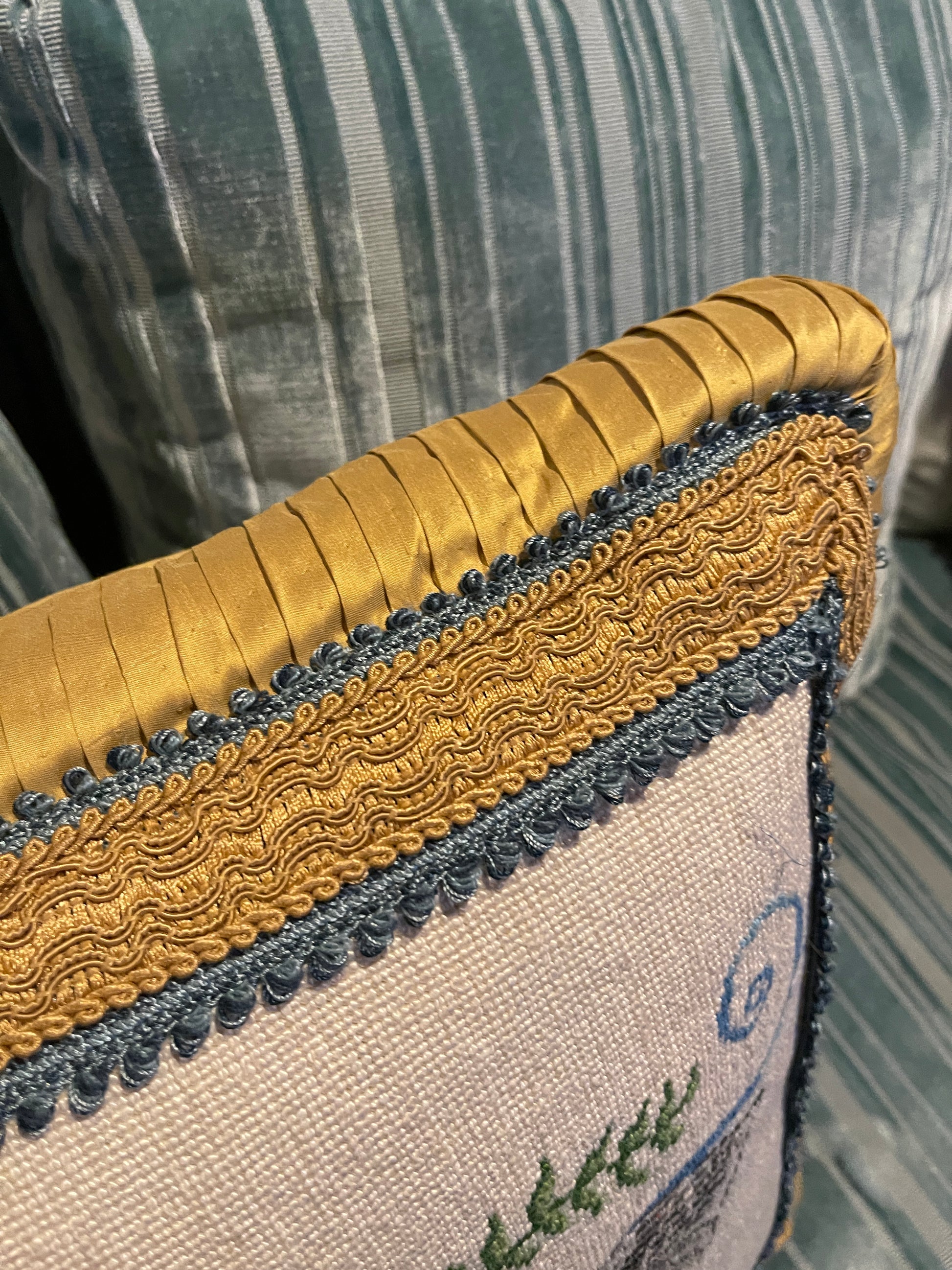 Vintage Needlepoint Pillow featuring musical instruments and sheet music. Beautifully trimmed in blue and gold fanciful trim with Gold shantung silk backing. This piece is the nicest vintage needlepoint I’ve had. The stitch, finishing work, and materials are superb.