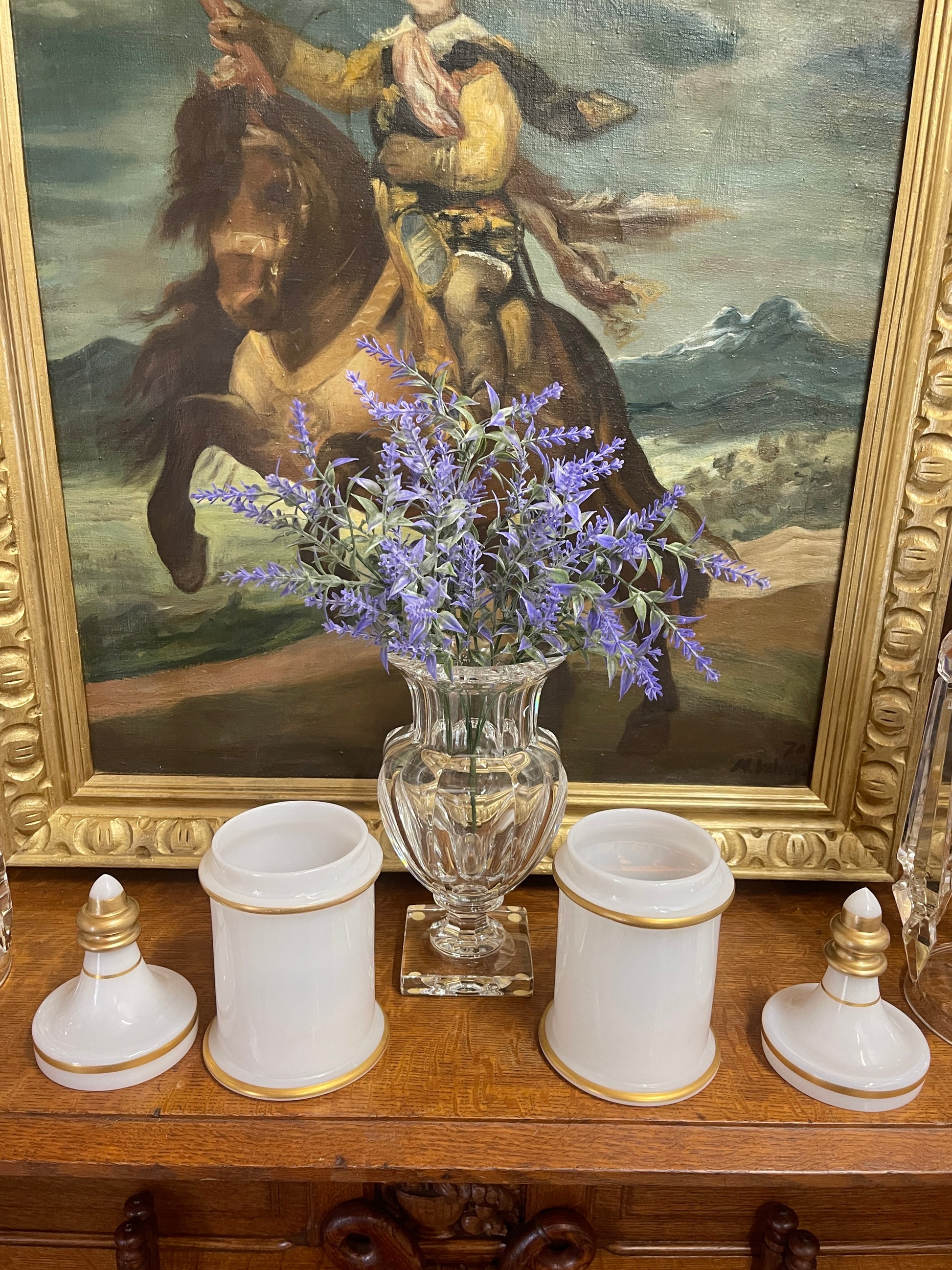 Vintage French Opaline Apothecary Jar, White with Gold Accents, Two Available