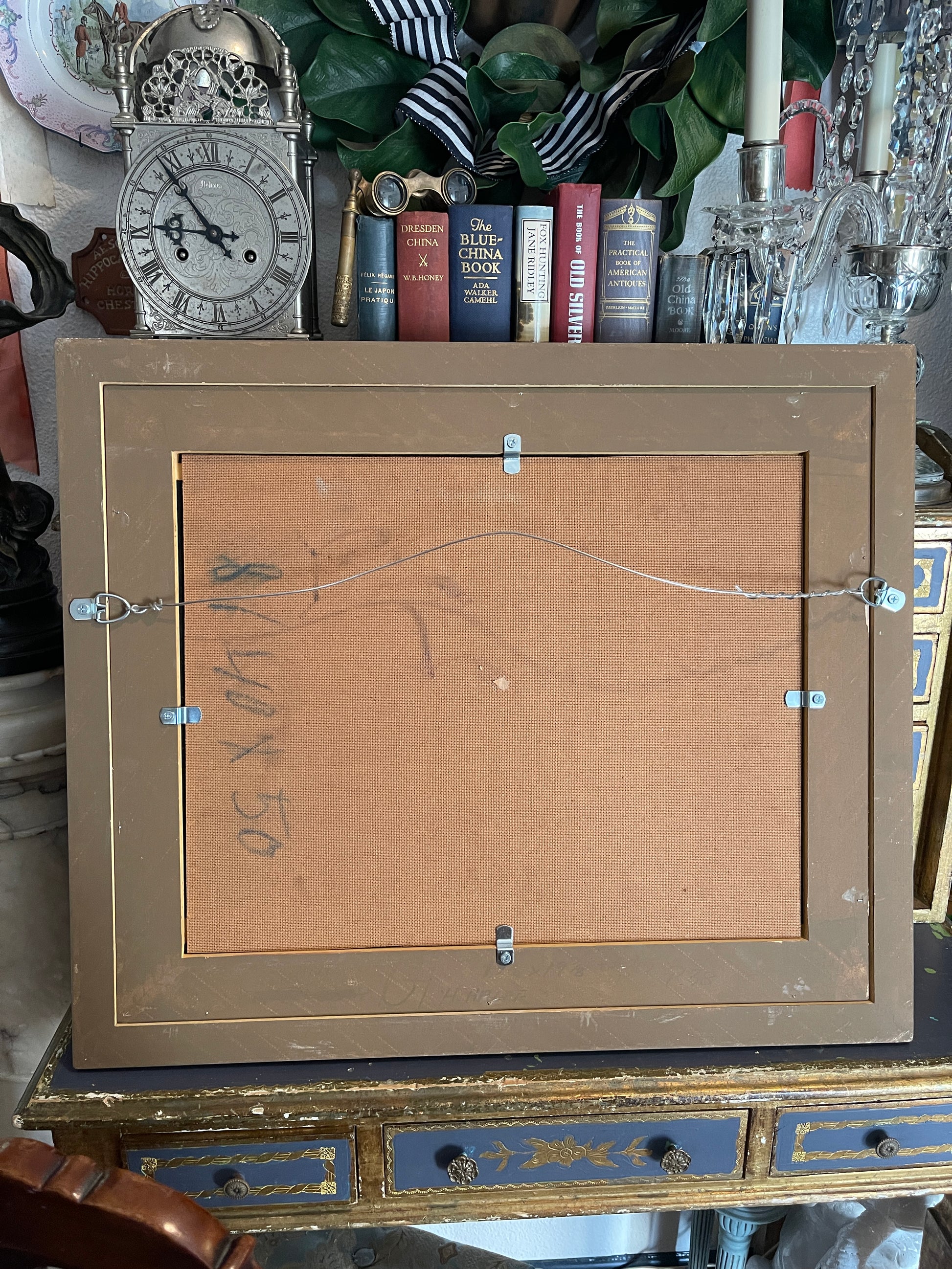 Estate art is one of my favorite things! Nestled in the European countryside we catch a glimpse of this charming bastide with two figures, possibly a mother and child, walking along a tree lined cobblestone road.