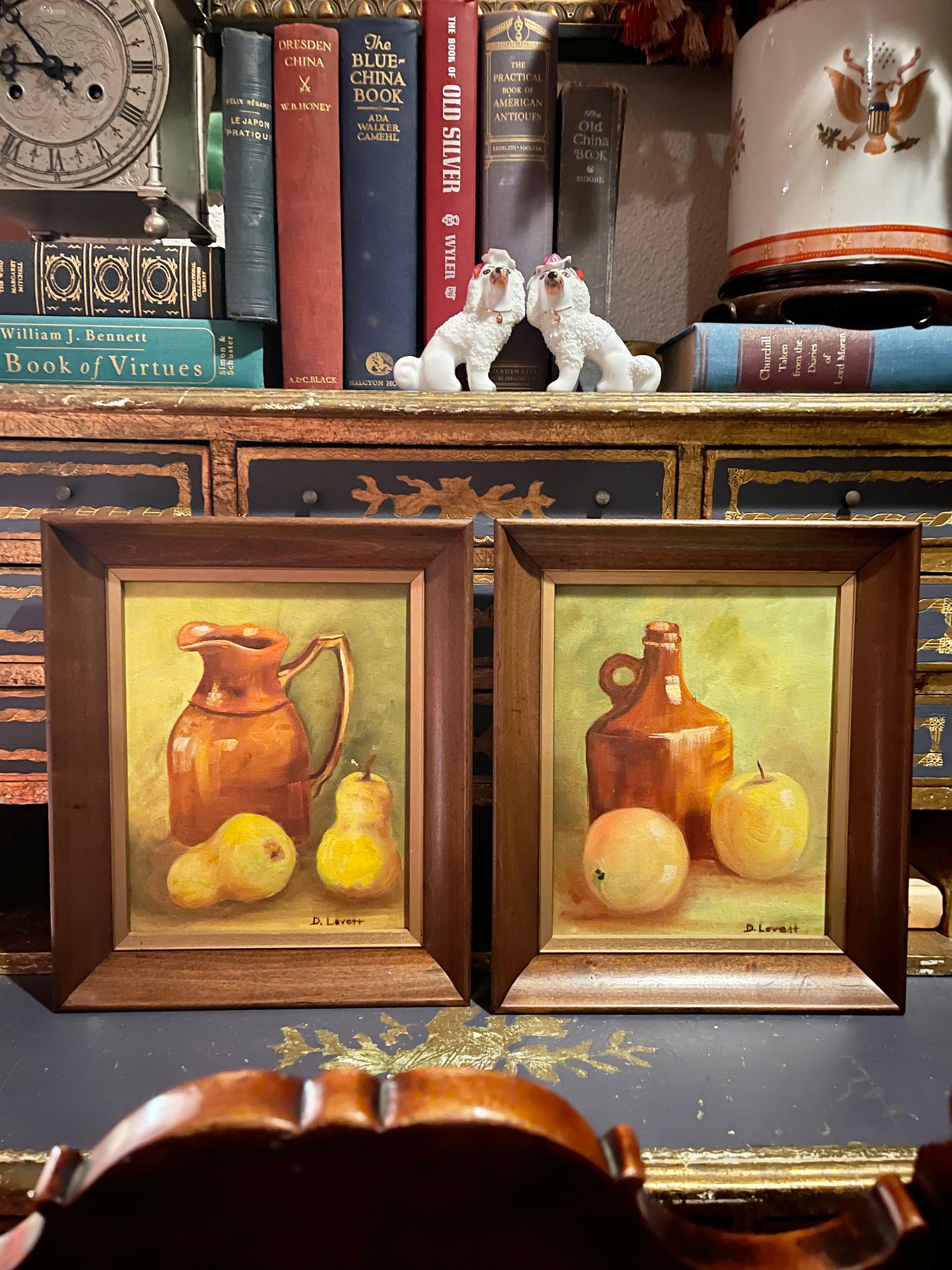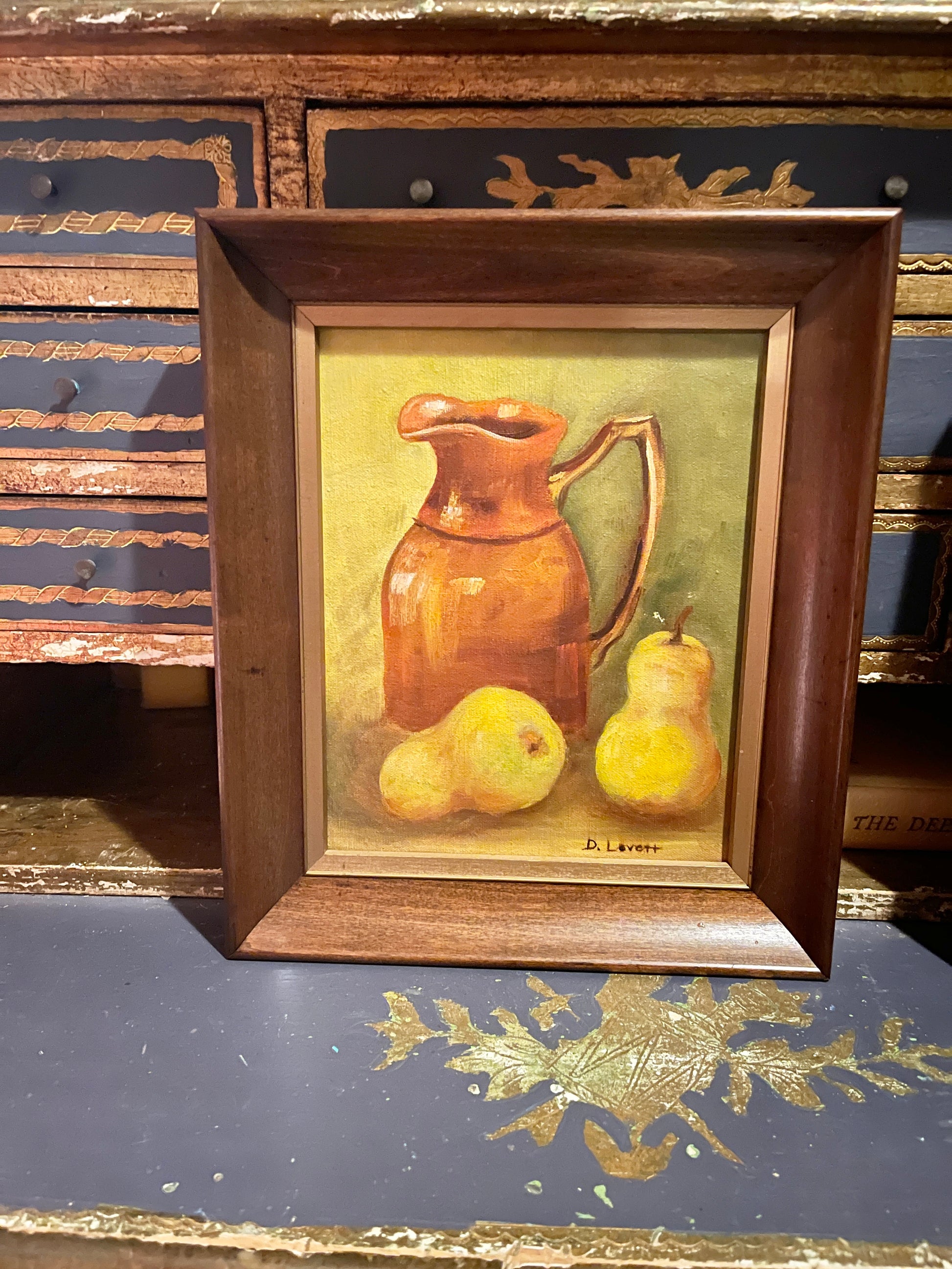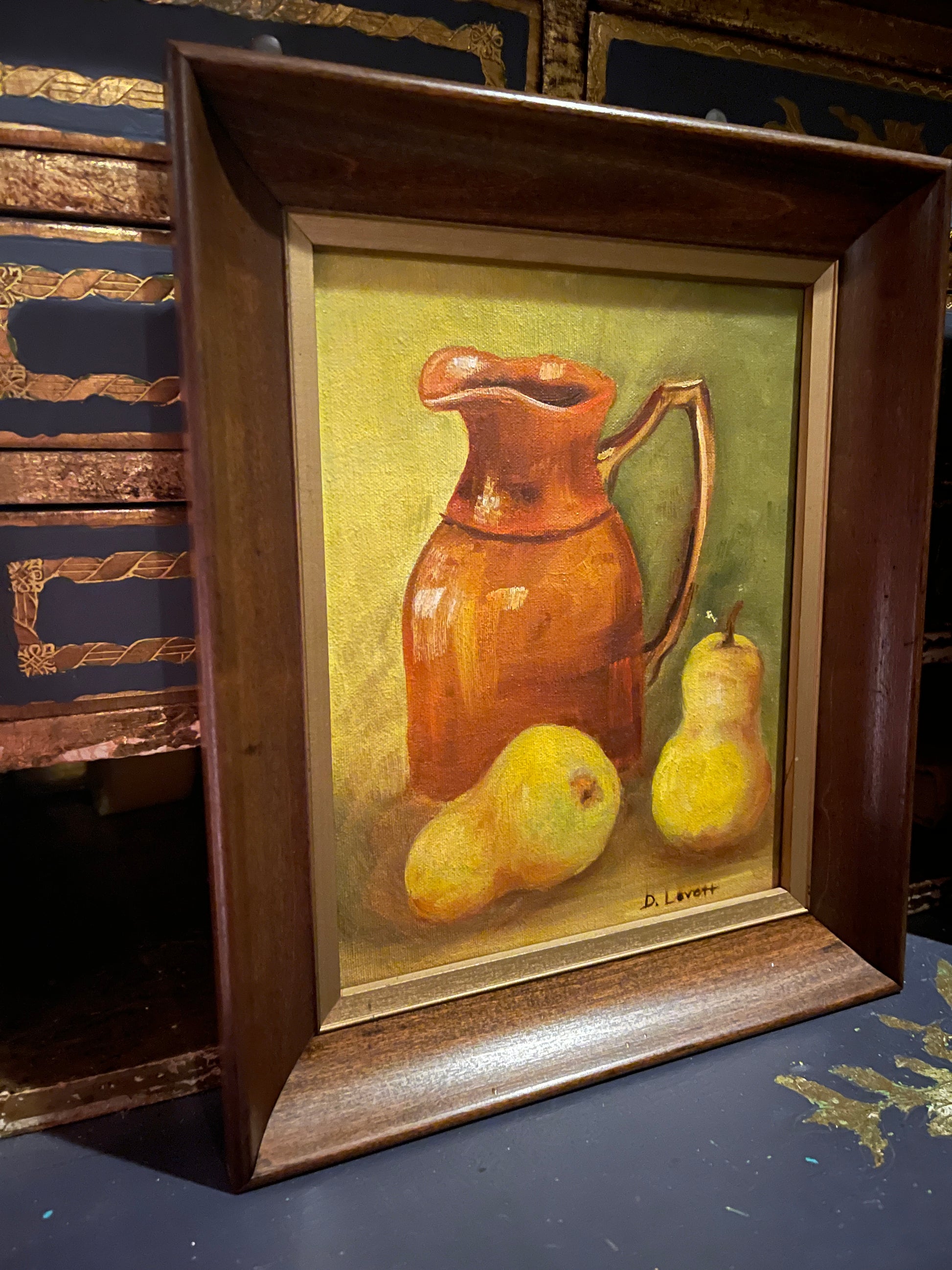 This vintage still life features a copper pitcher and pears painted on canvas and framed in solid wood with gold matting. I love the contrast of the yellowy greens pears combined with the richness of the copper pitcher. It’s pure cottage charm!