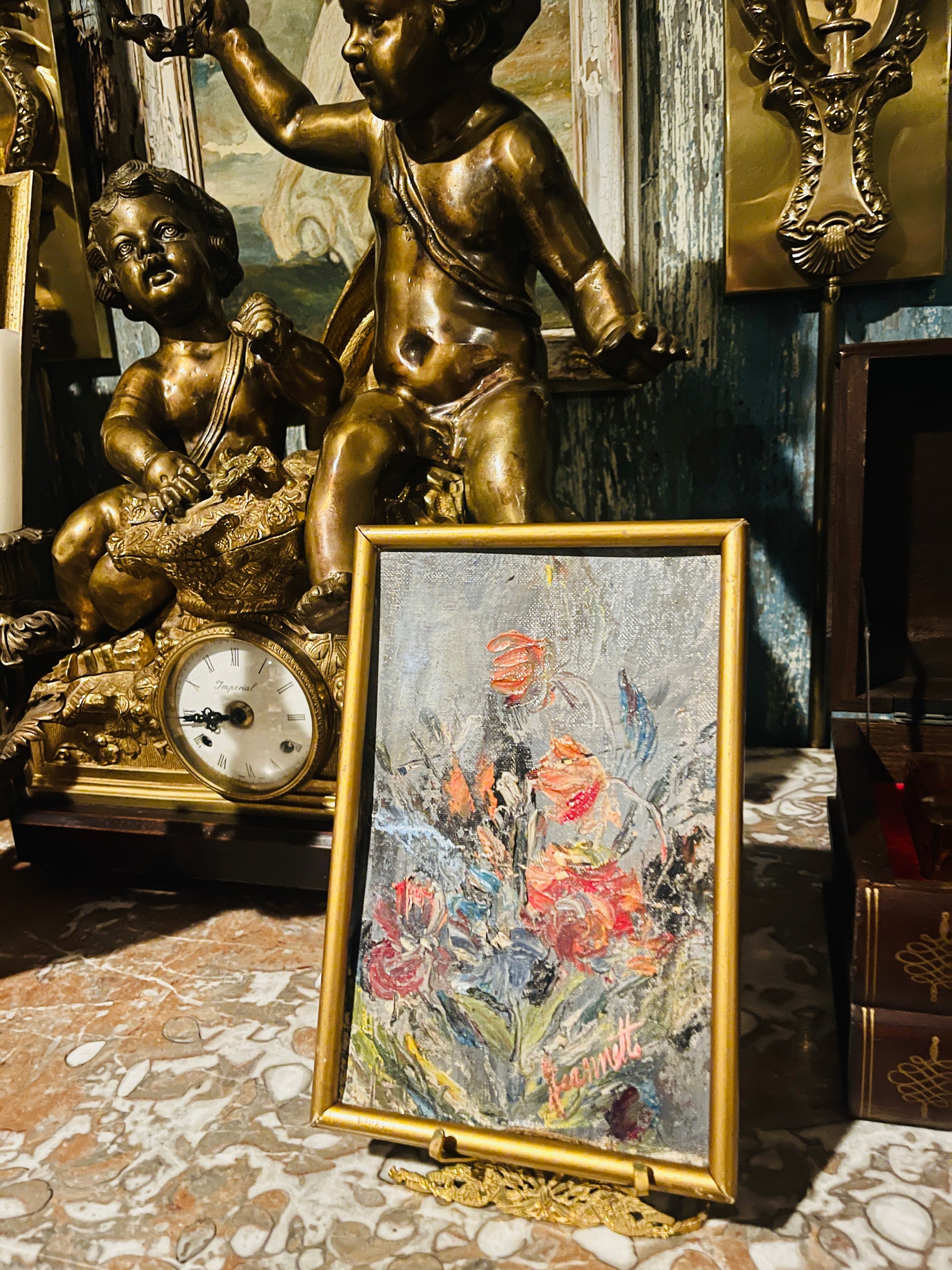 Framed in its original giltwood frame, the painting stands elegantly on a brass easel, perfect for displaying atop a vanity, entry console, or bookshelf vignette. The scale and color palette make it an ideal accent for grandmillennial, French country, or romantic cottage interiors, adding just the right touch of age and artistry.
