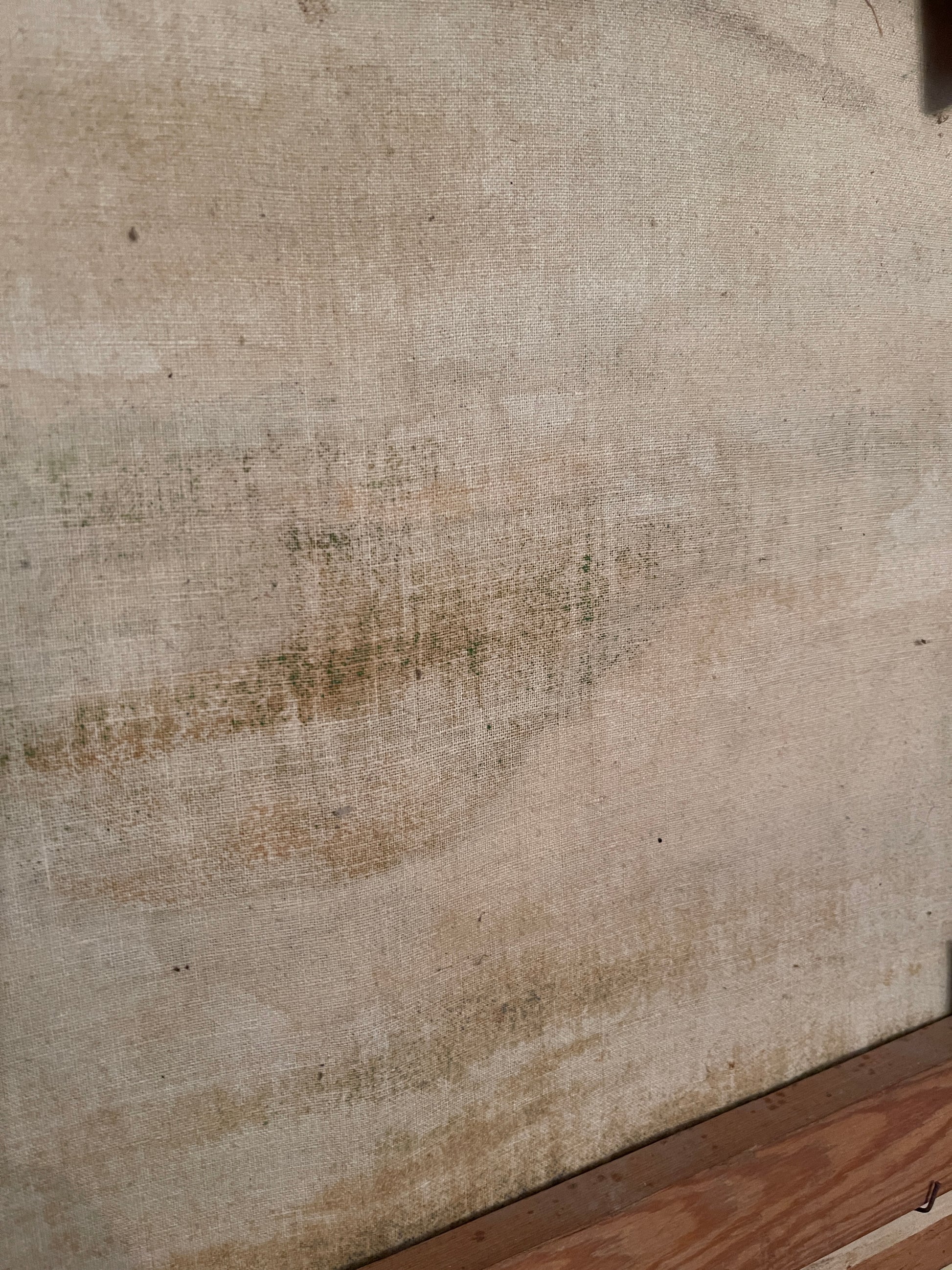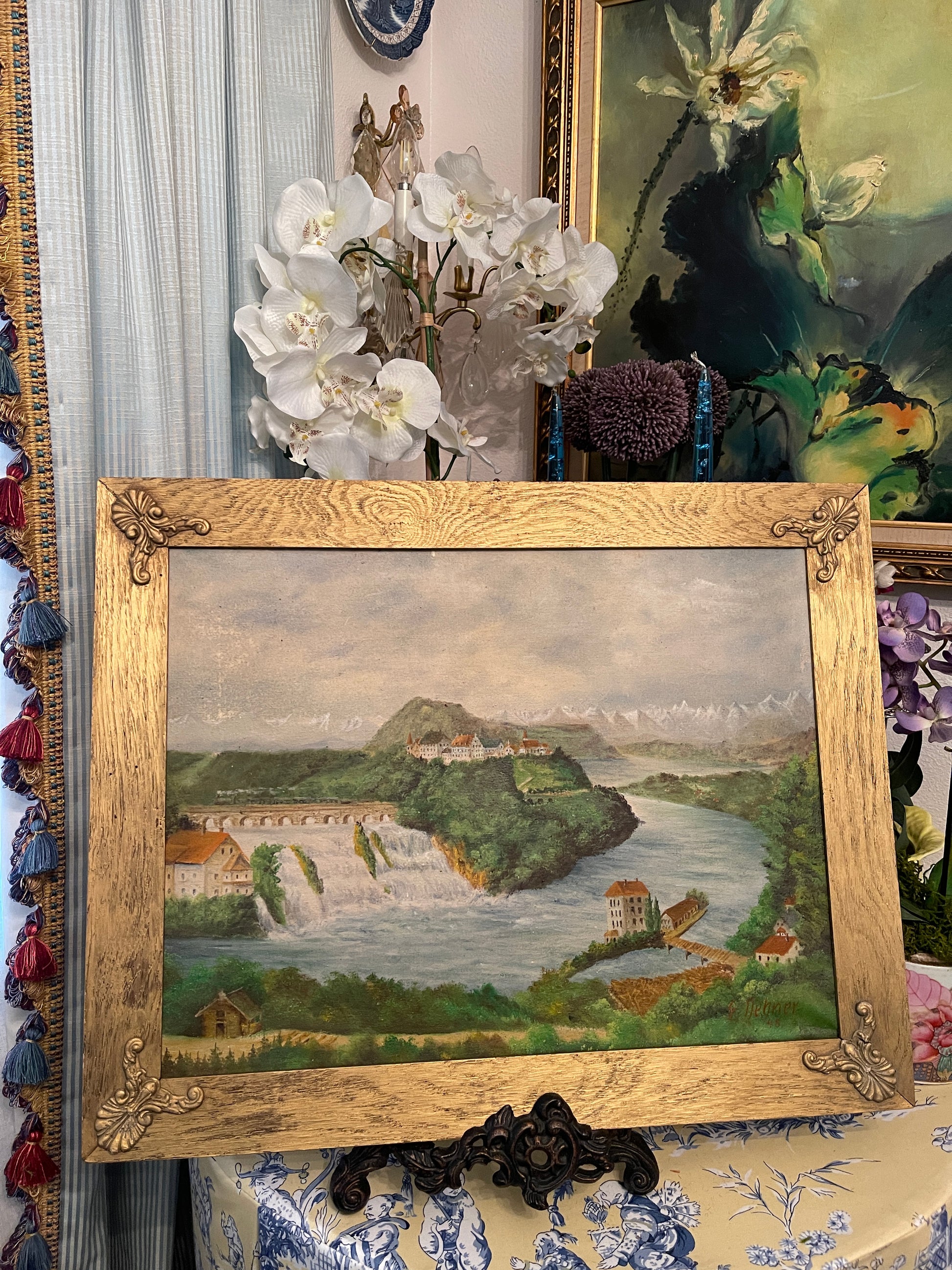 Beautiful antique original art signed E. Dehner and dated, acrylic on linen stretched into a pretty wooden frame. This fantastic pair that stopped me in my tracks came from a lovely estate in an older, established part of Austin. This duo depicts the Rhine River, which runs through the Swiss Alps. I find both paintings reminiscent of The Sound of Music with their soft blues and greens, the depth in the water and the clouds, and the detail in the landscape and the structures.