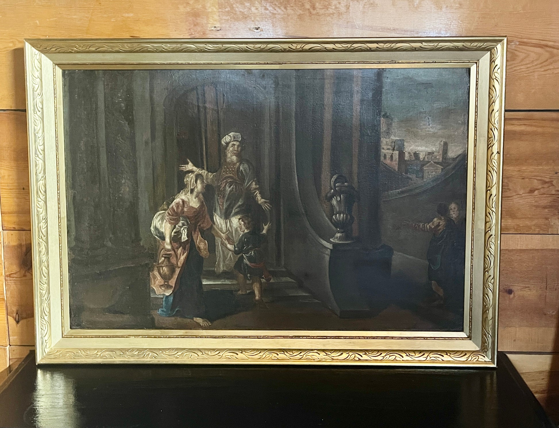 A captivating antique oil on canvas in the Old Master style, depicting the biblical scene of the young Christ among the Elders in the Temple, as recounted in the Gospel of Luke (2:41–52). Painted in the late 18th to early 19th century, this work captures the moment Mary and Joseph find the twelve-year-old Christ engaged in profound discussion with the learned elders, who marvel at His wisdom.