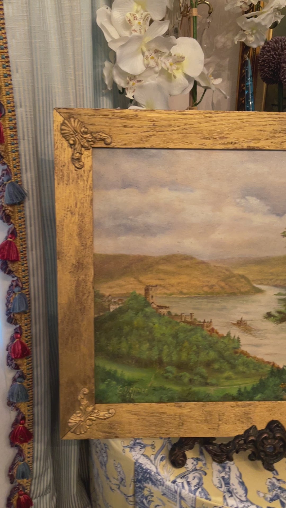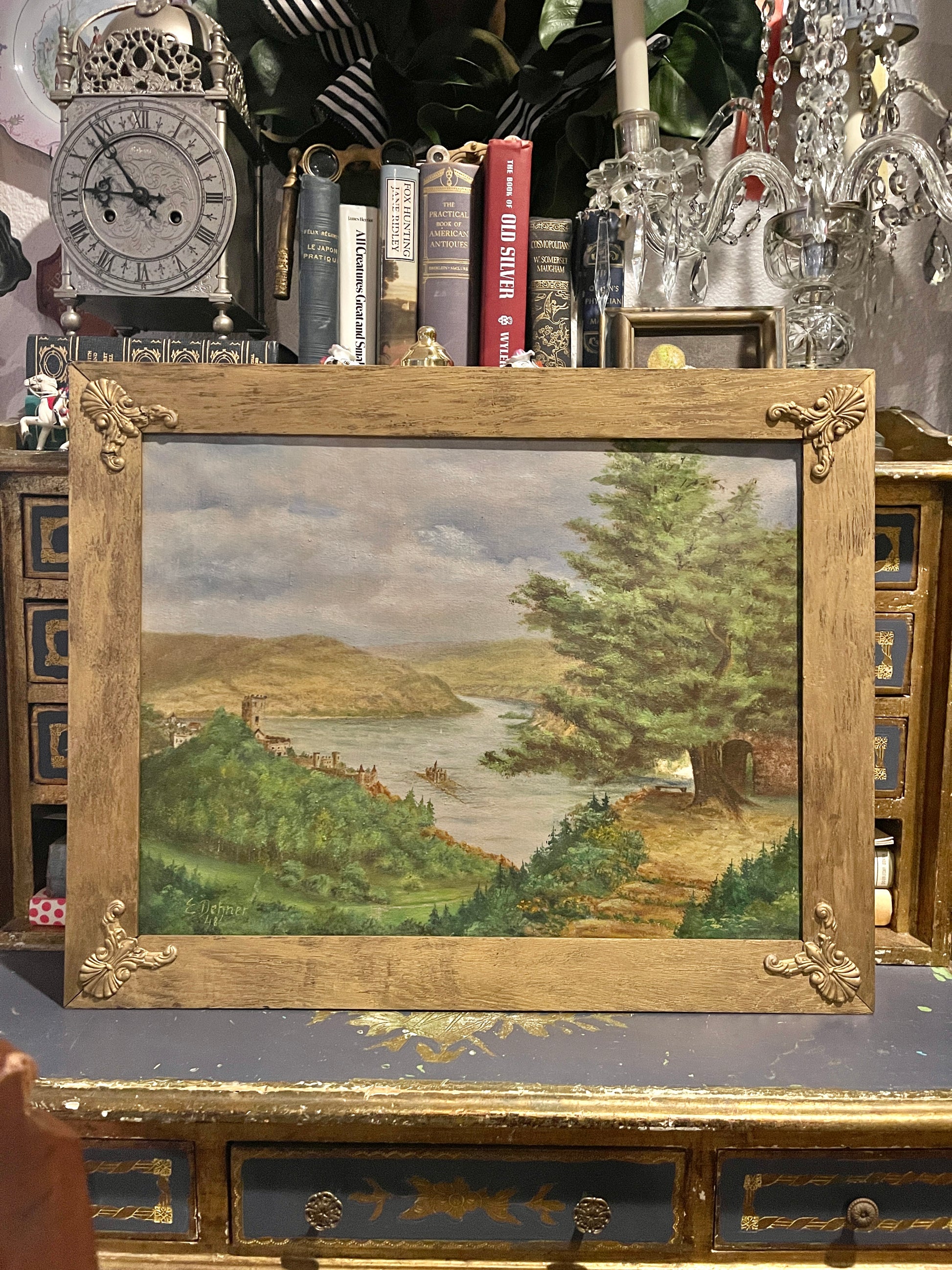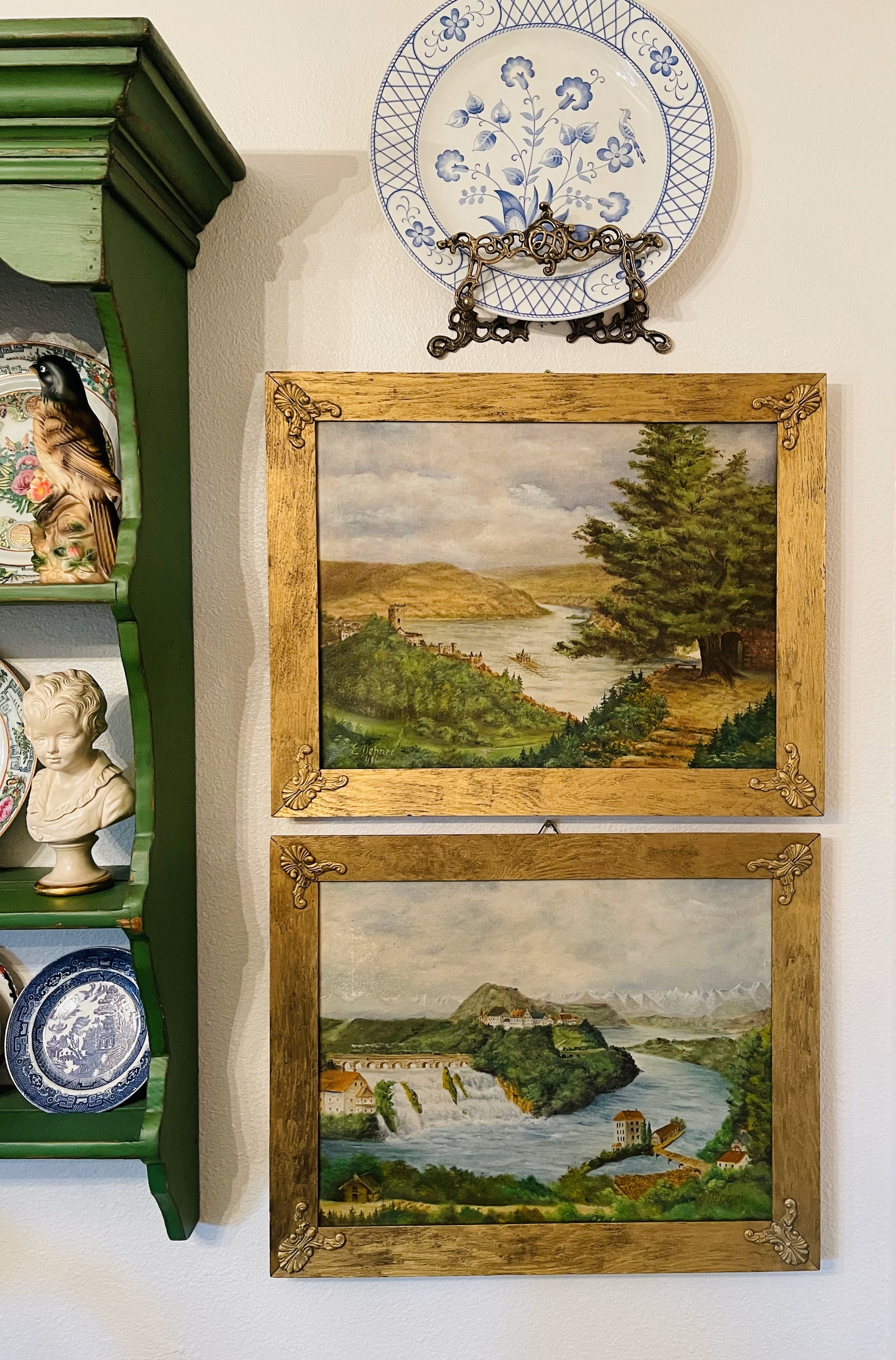 Beautiful antique original art signed E. Dehner and dated, acrylic on linen stretched into a pretty wooden frame. This fantastic pair stopped me in my tracks at a lovely estate in an older, established part of Austin. This duo depicts the Rhine River, which runs through the Swiss Alps. I find both paintings reminiscent of The Sound of Music with their soft blues and greens, the depth in the water and the clouds, and the detail in the landscape.