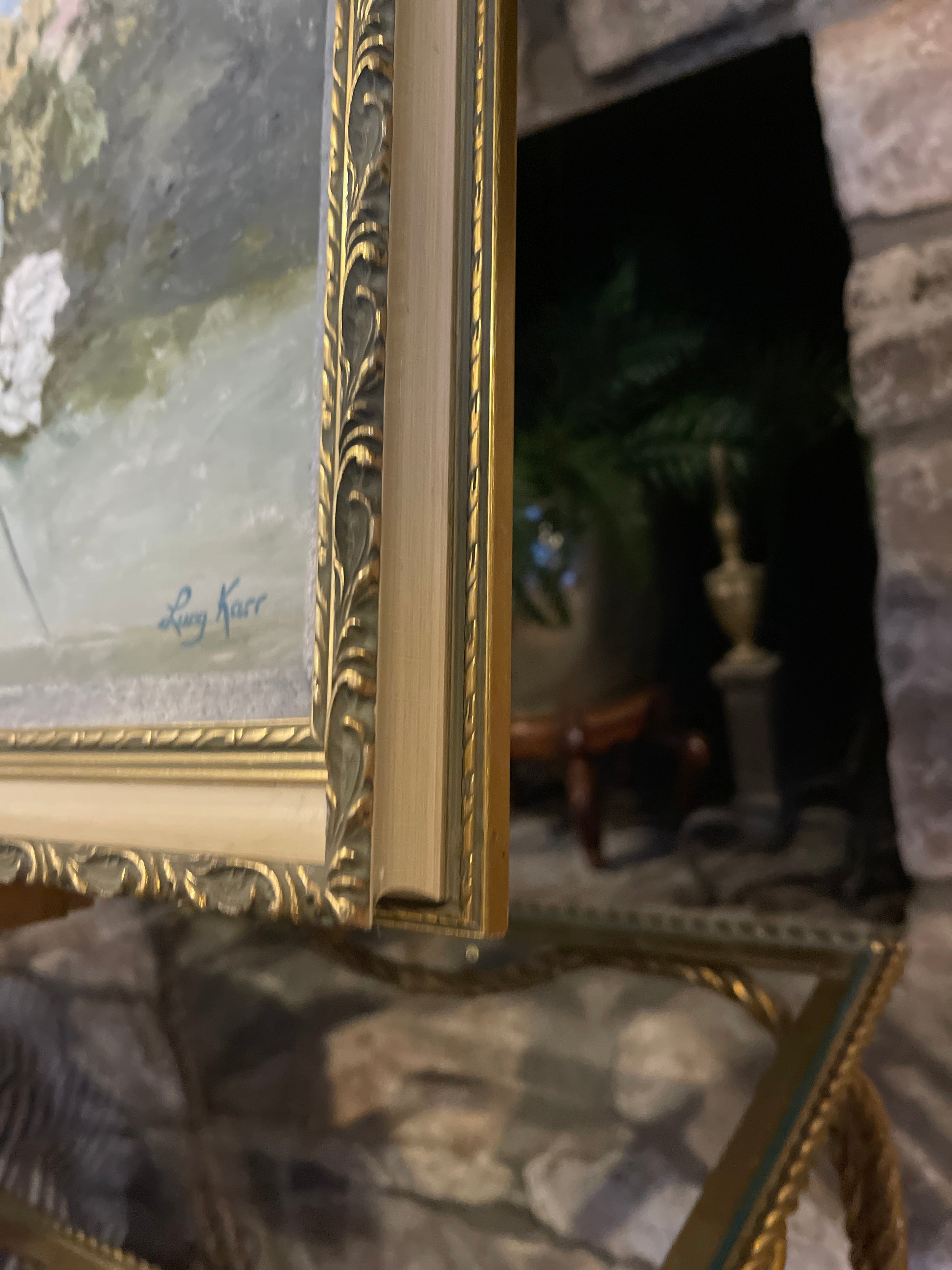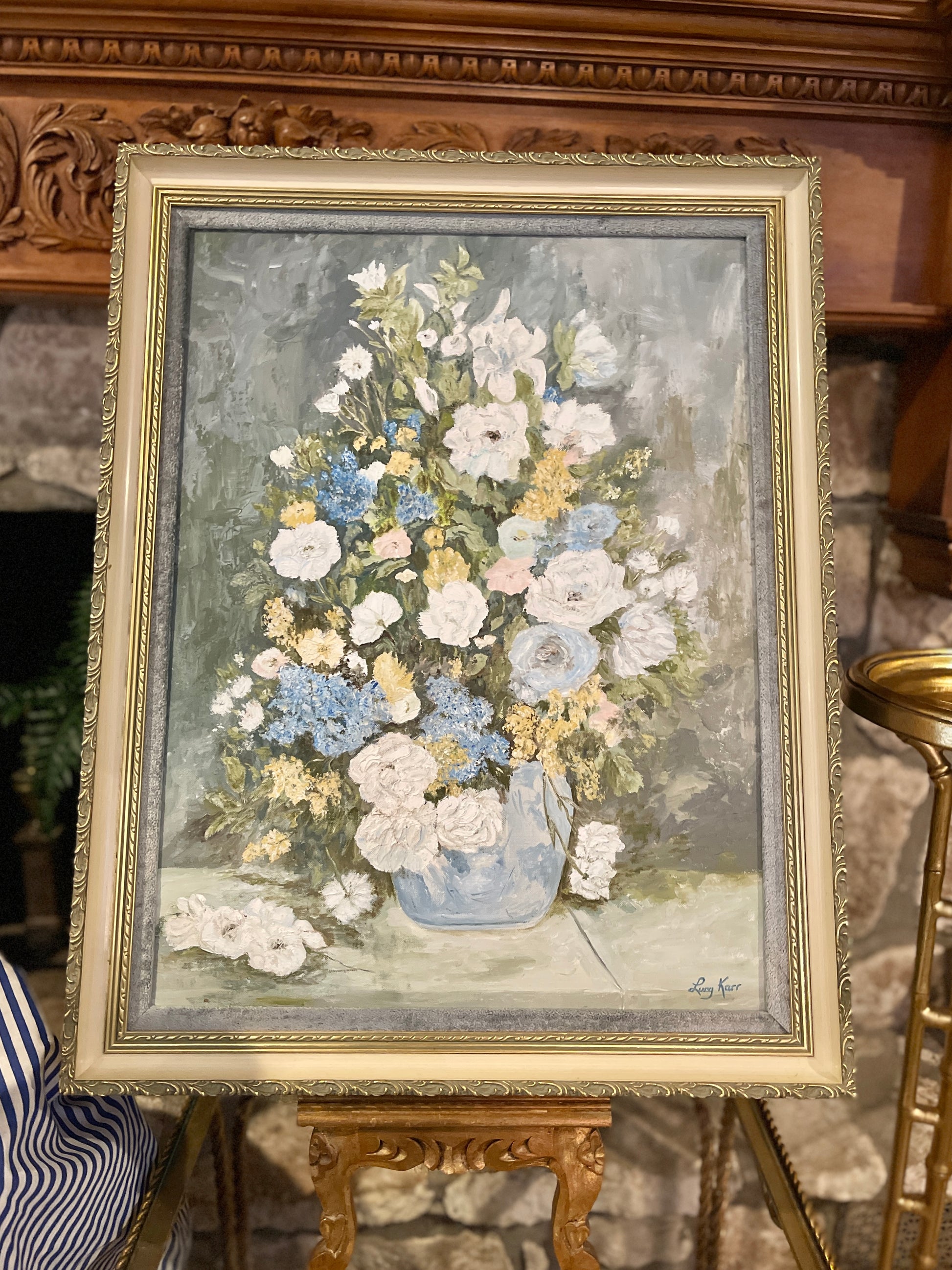 Estate Art is one of my favorite things to offer…this original painting of a bountiful bouquet of flowers in shades of pink, blue, white, and yellow is so dreamy. It has an almost abstract quality to it. It’s enveloped in a cream and gold frame with a unique blue velour matting which I love. Talk about extra! It’s Acrylic on canvas. Artist signed in the lower right corner.