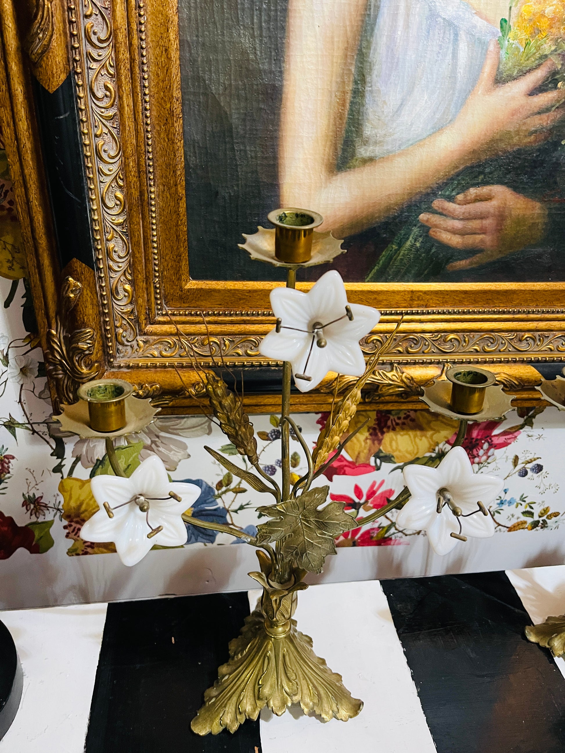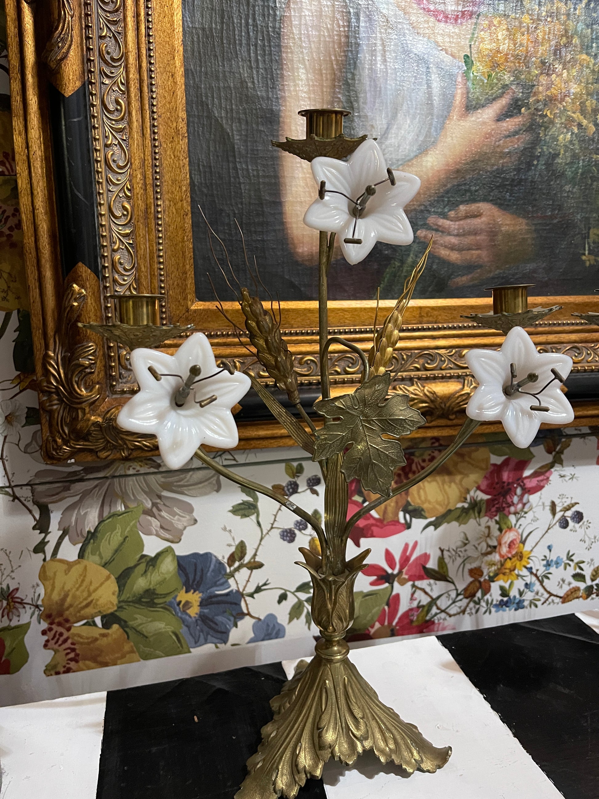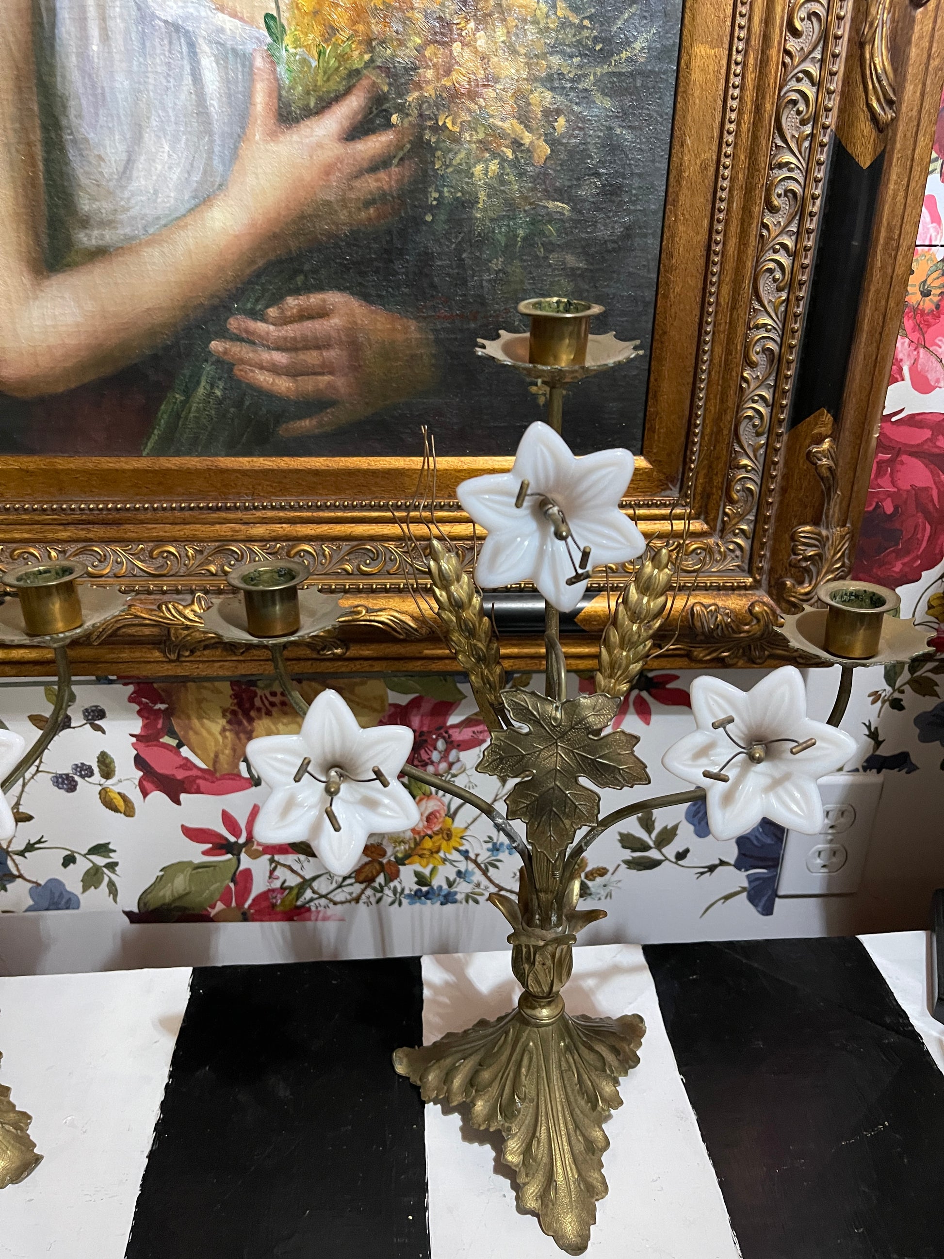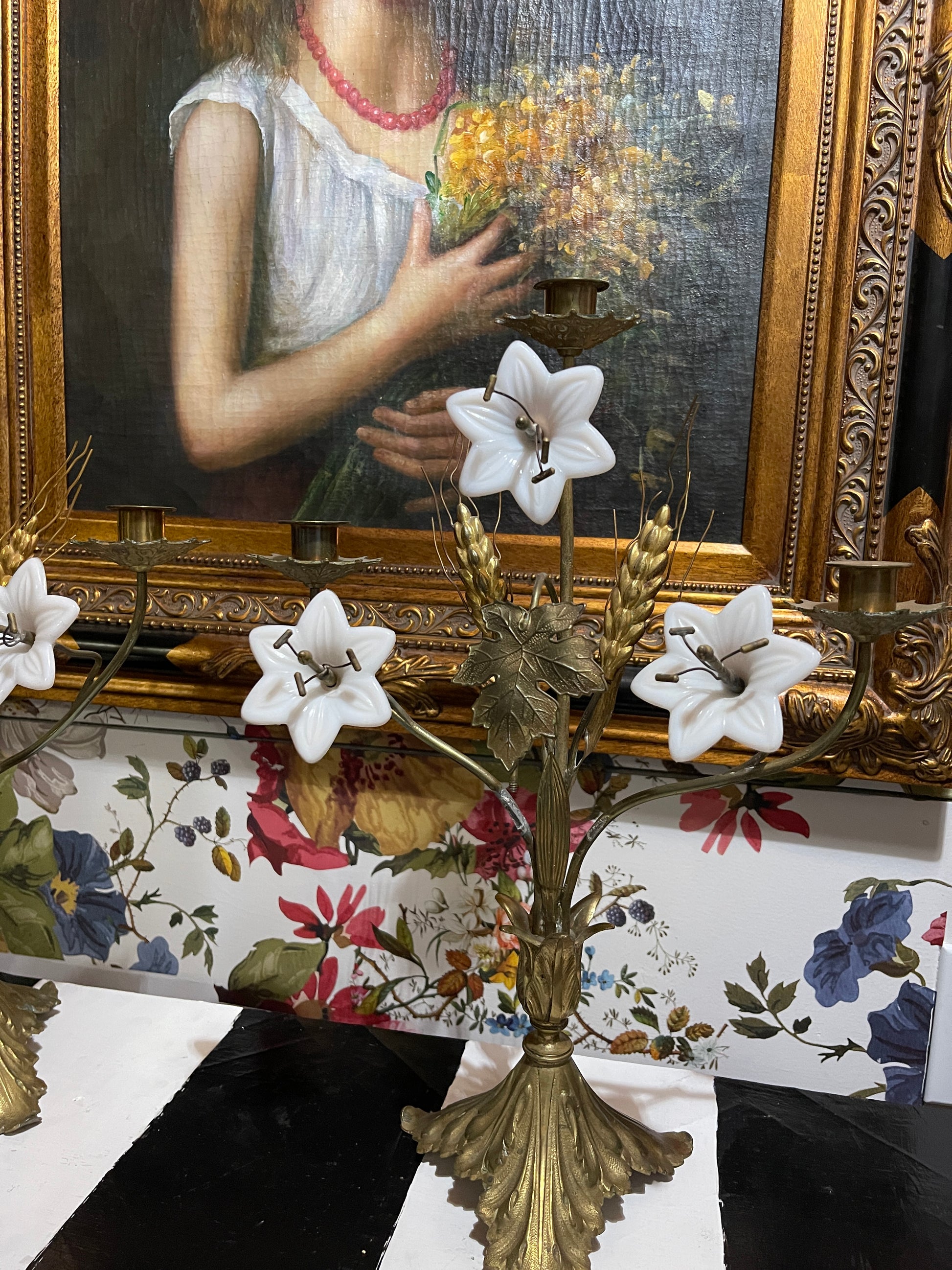 Pair of Antique French Brass Altar Candelabras with Milk Glass Lilies & Wheat Sheaves – Ecclesiastical Candle Holders