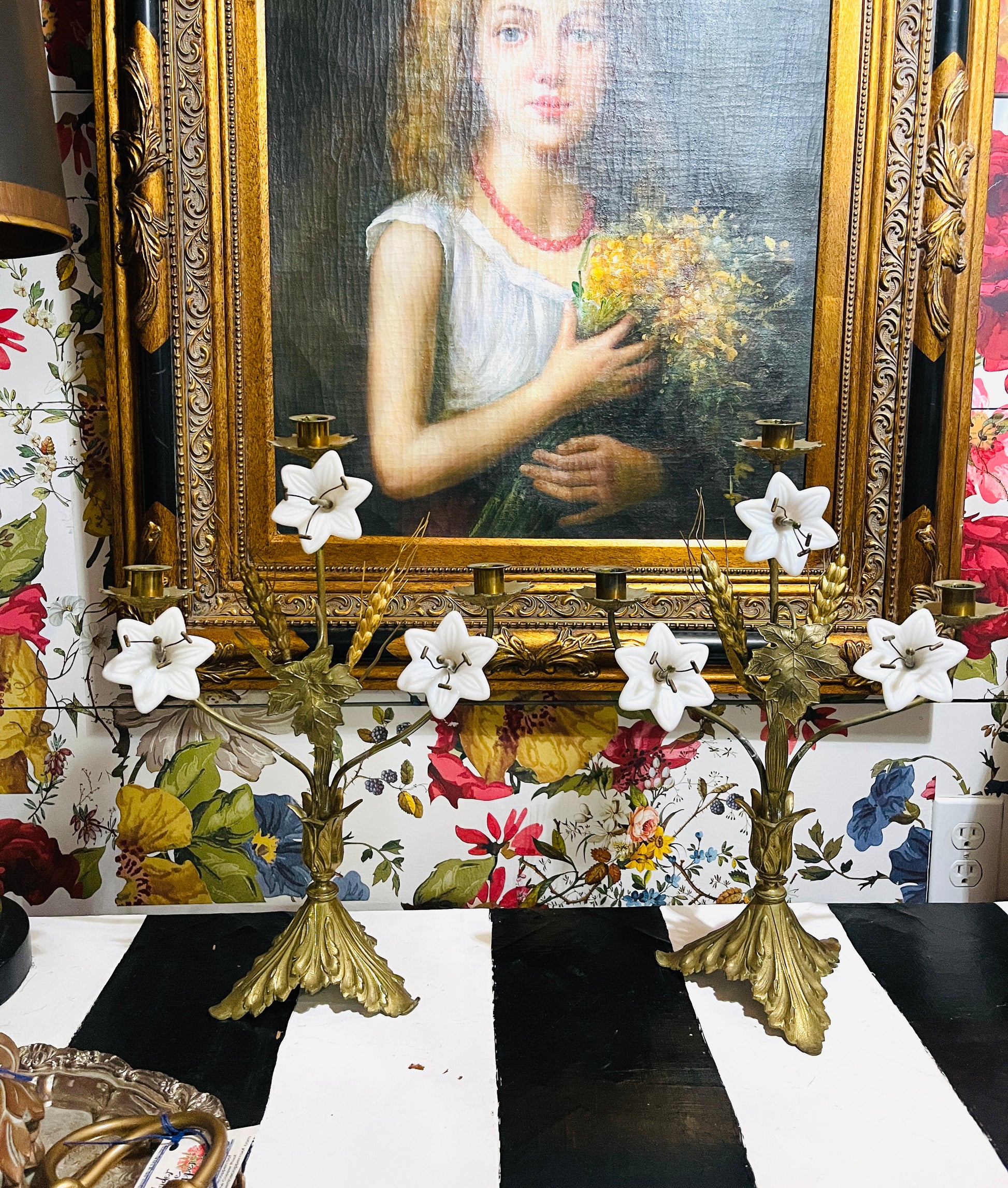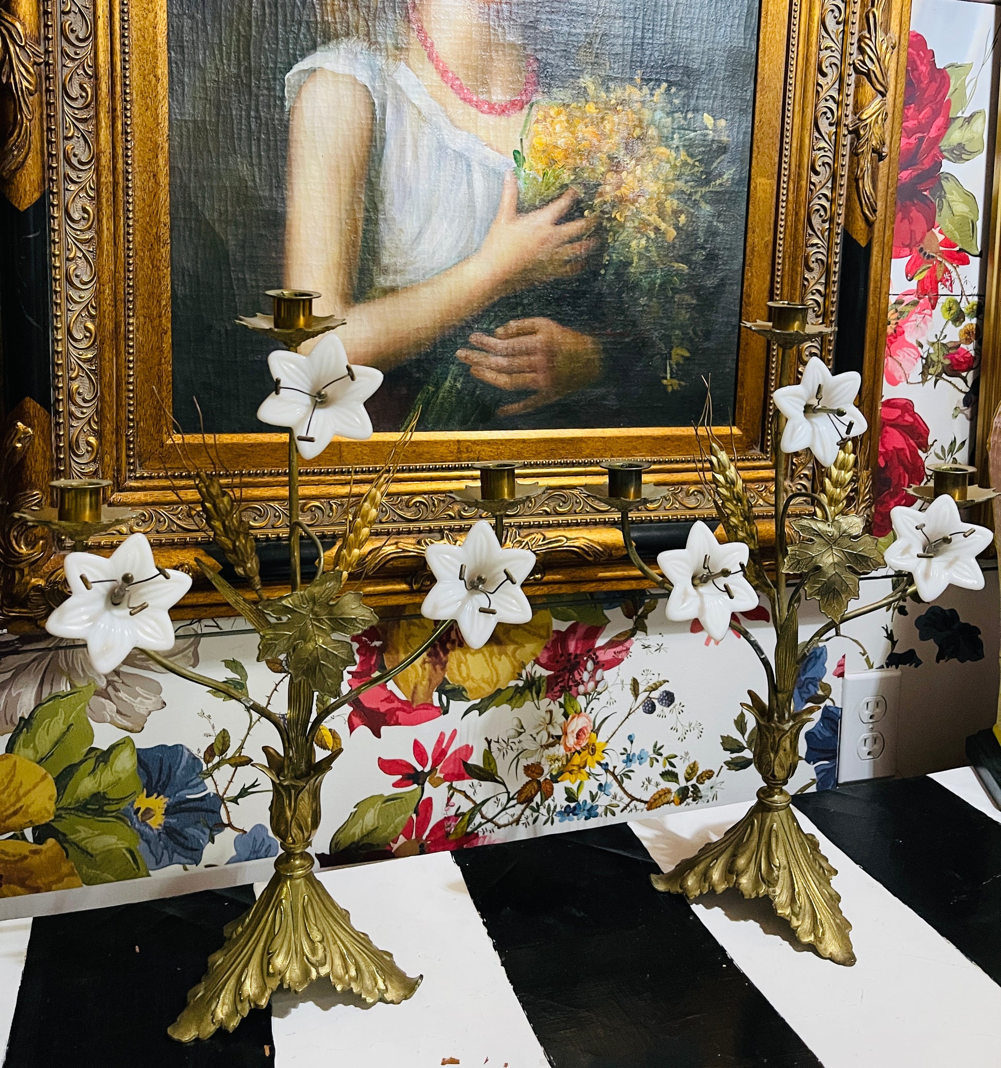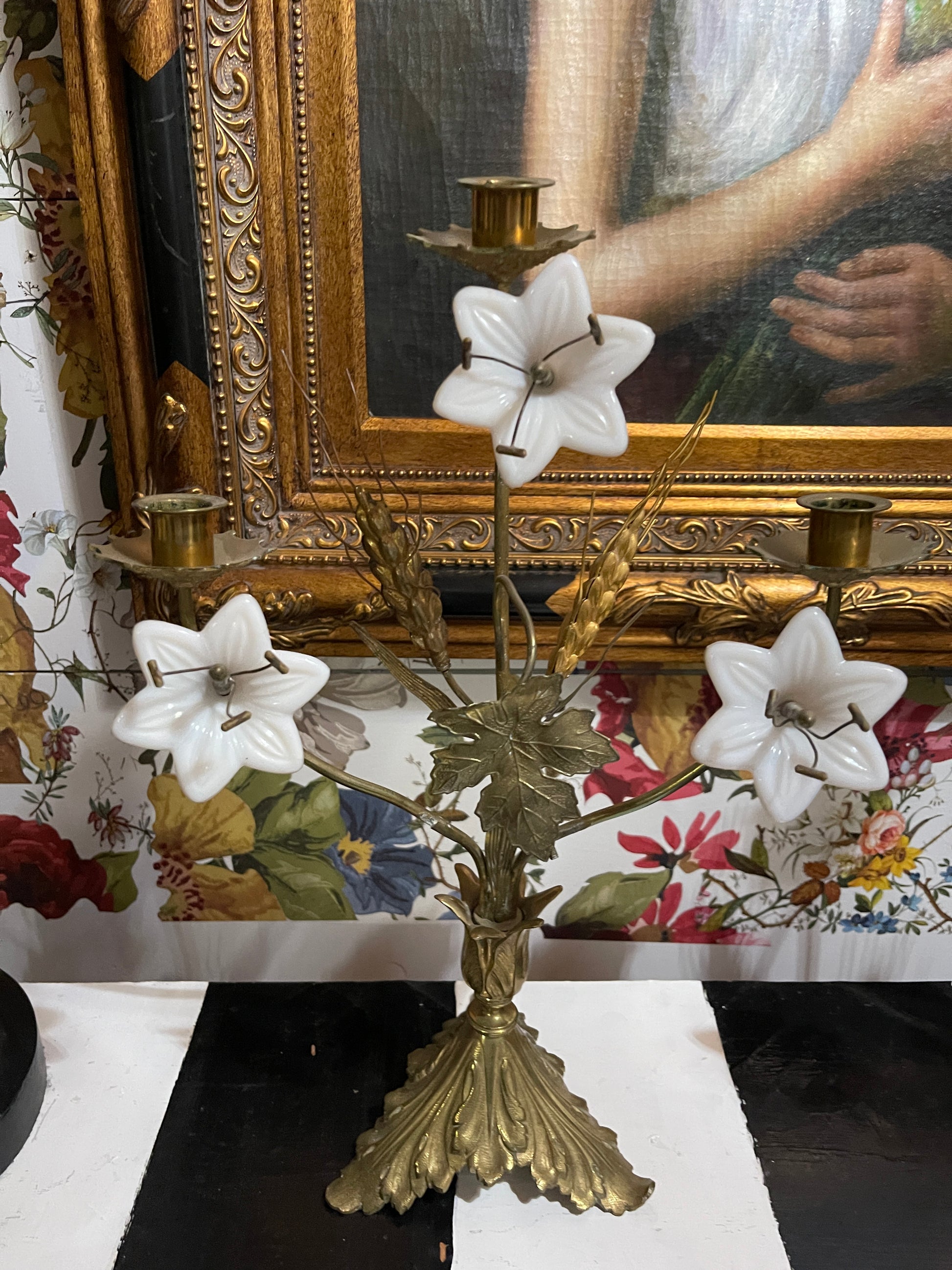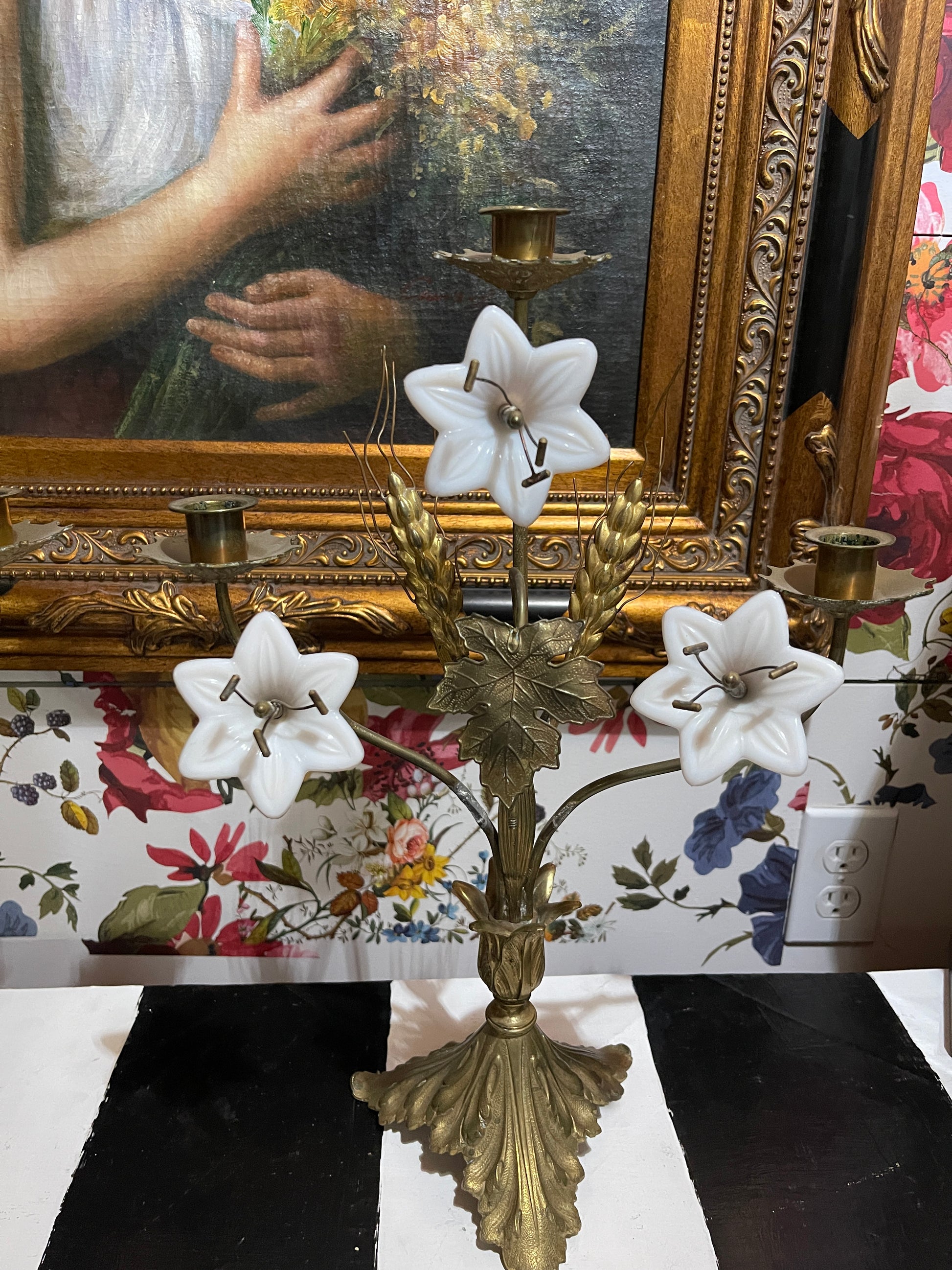 Pair of Antique French Brass Altar Candelabras with Milk Glass Lilies & Wheat Sheaves – Ecclesiastical Candle Holders