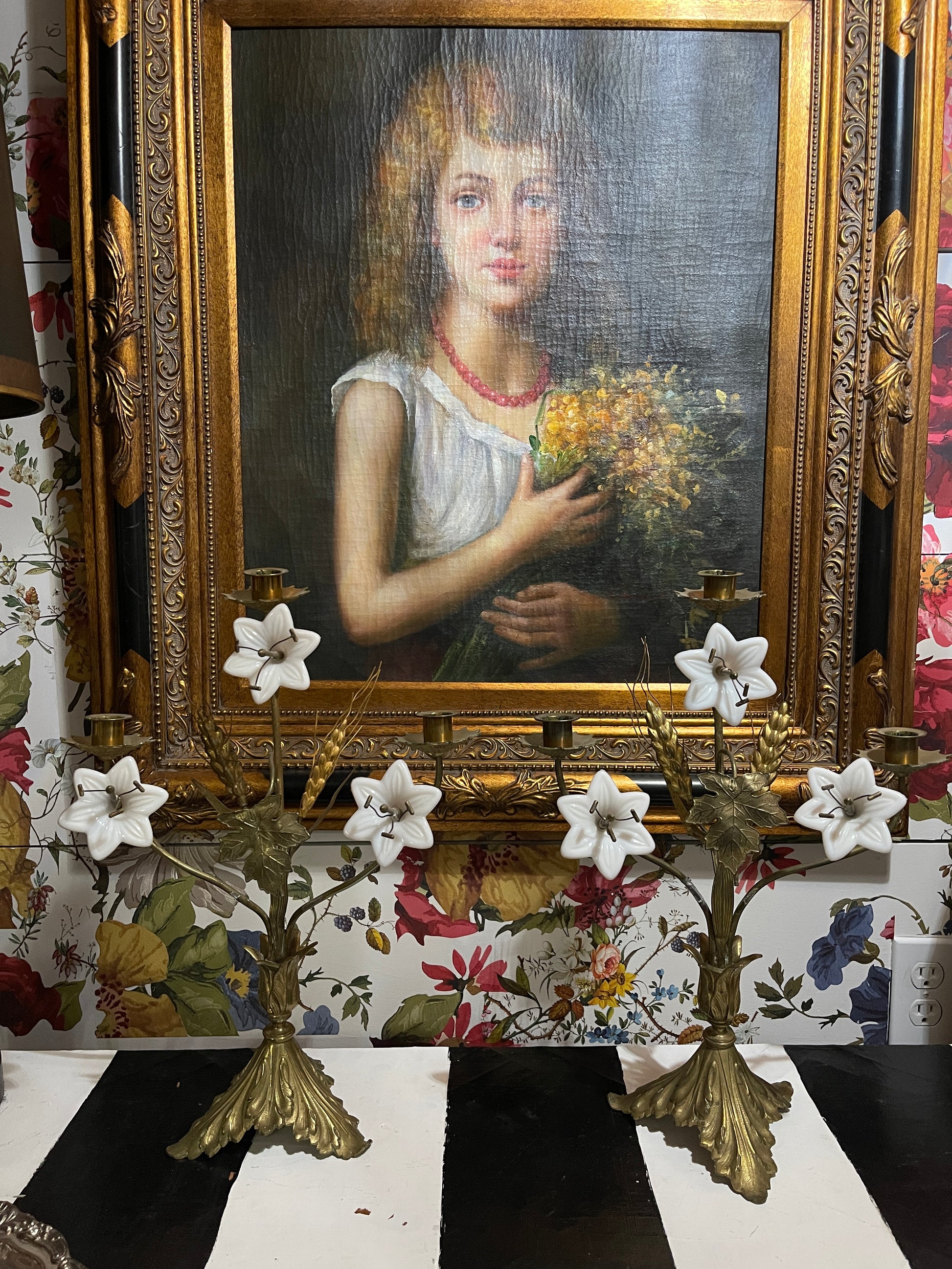 A heavenly pair of antique French altar candelabras, each crafted from ornate gilt brass and adorned with radiant milk glass lily blossoms and symbolic wheat sheaves. Rich in religious meaning and visual poetry, this rare set was likely used on a church altar or within a private chapel.