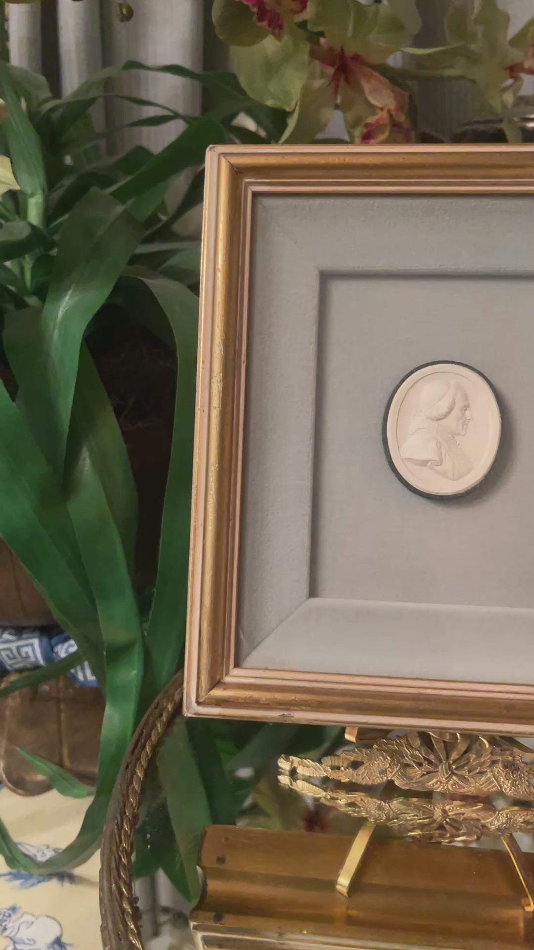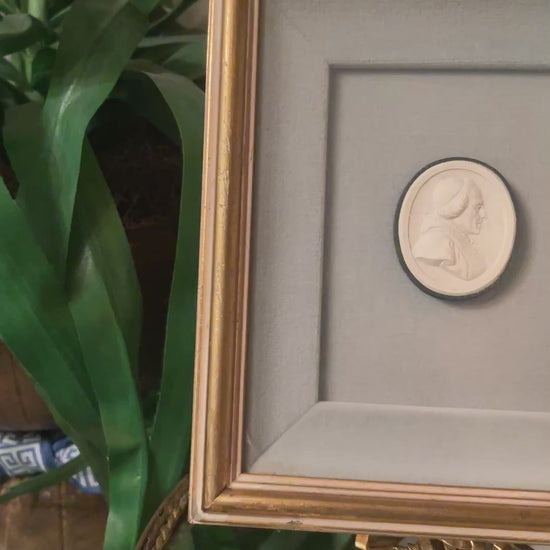 Add a touch of Old World refinement to your walls with this exquisite pair of framed classical intaglios. Each delicate plaster relief portrait is elegantly set against French Blue silk matting, a color long associated with French royal interiors, lending softness and sophistication to the presentation.