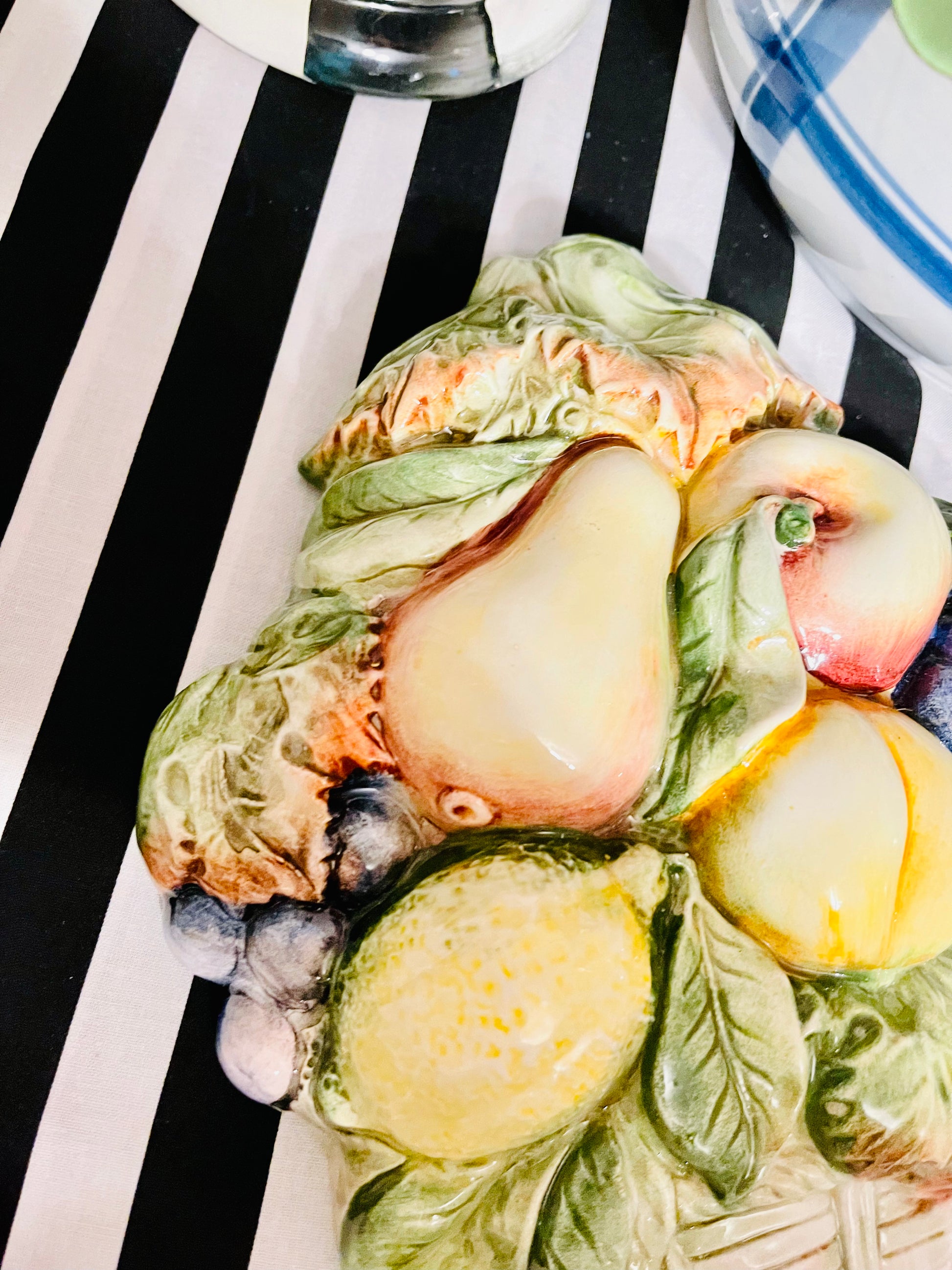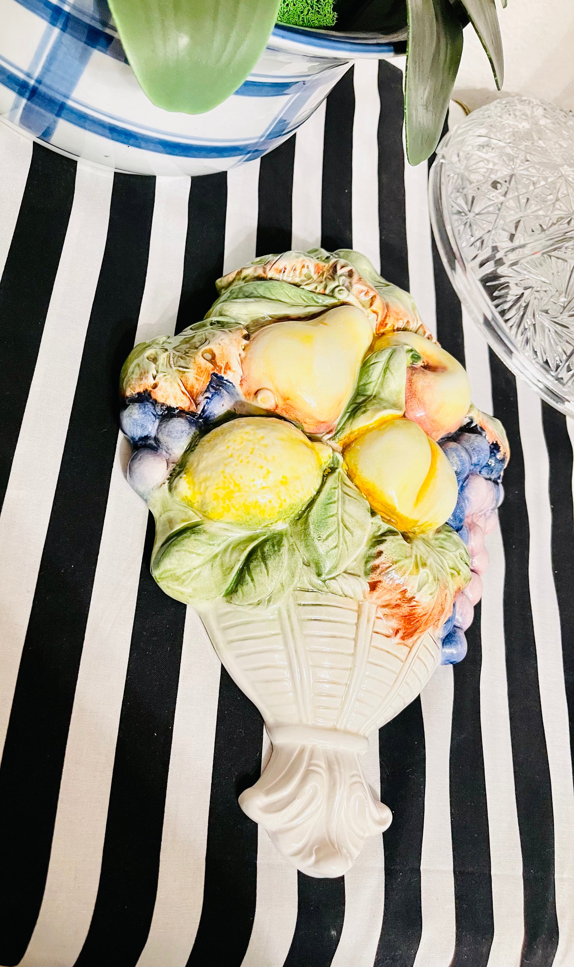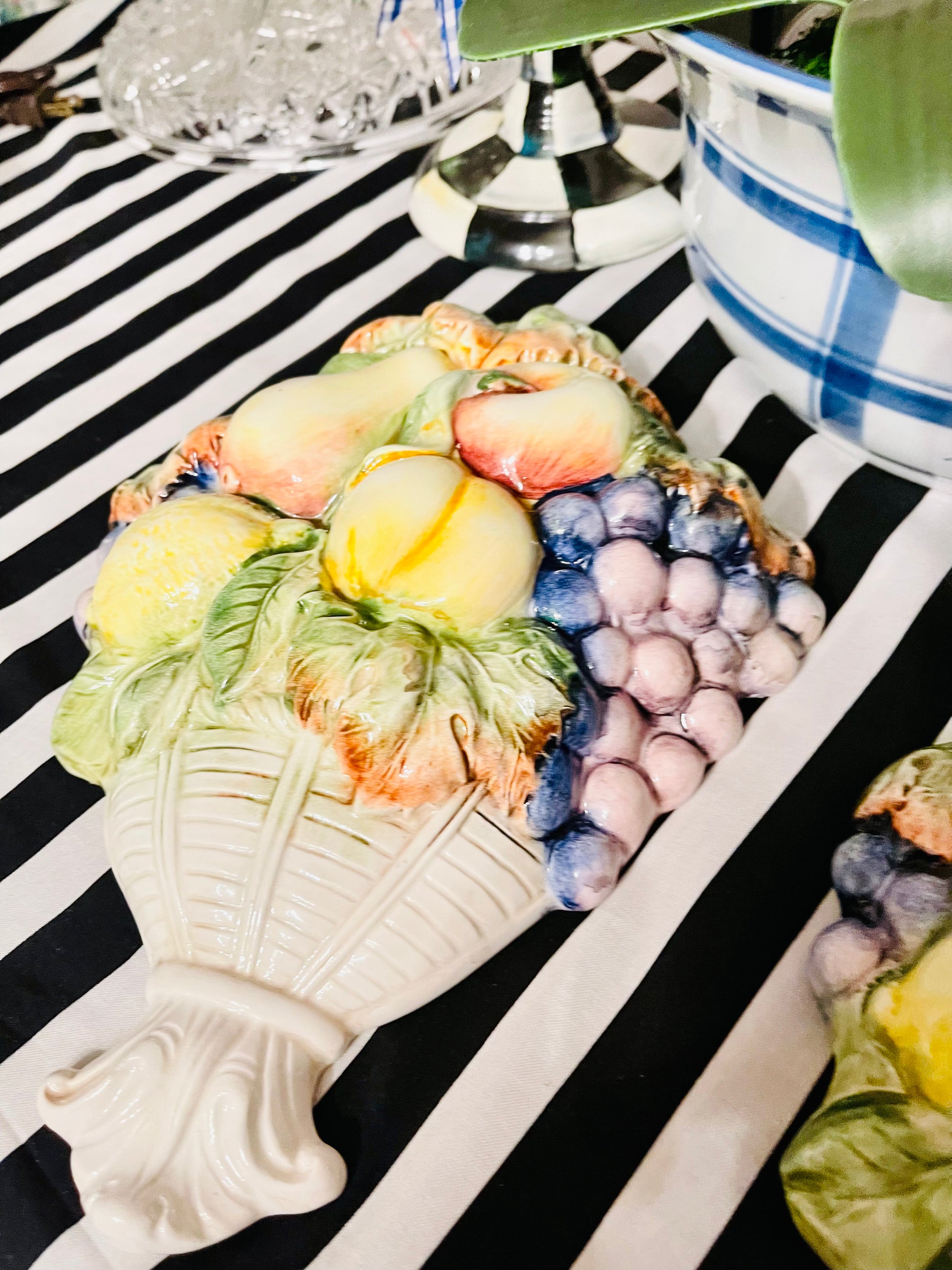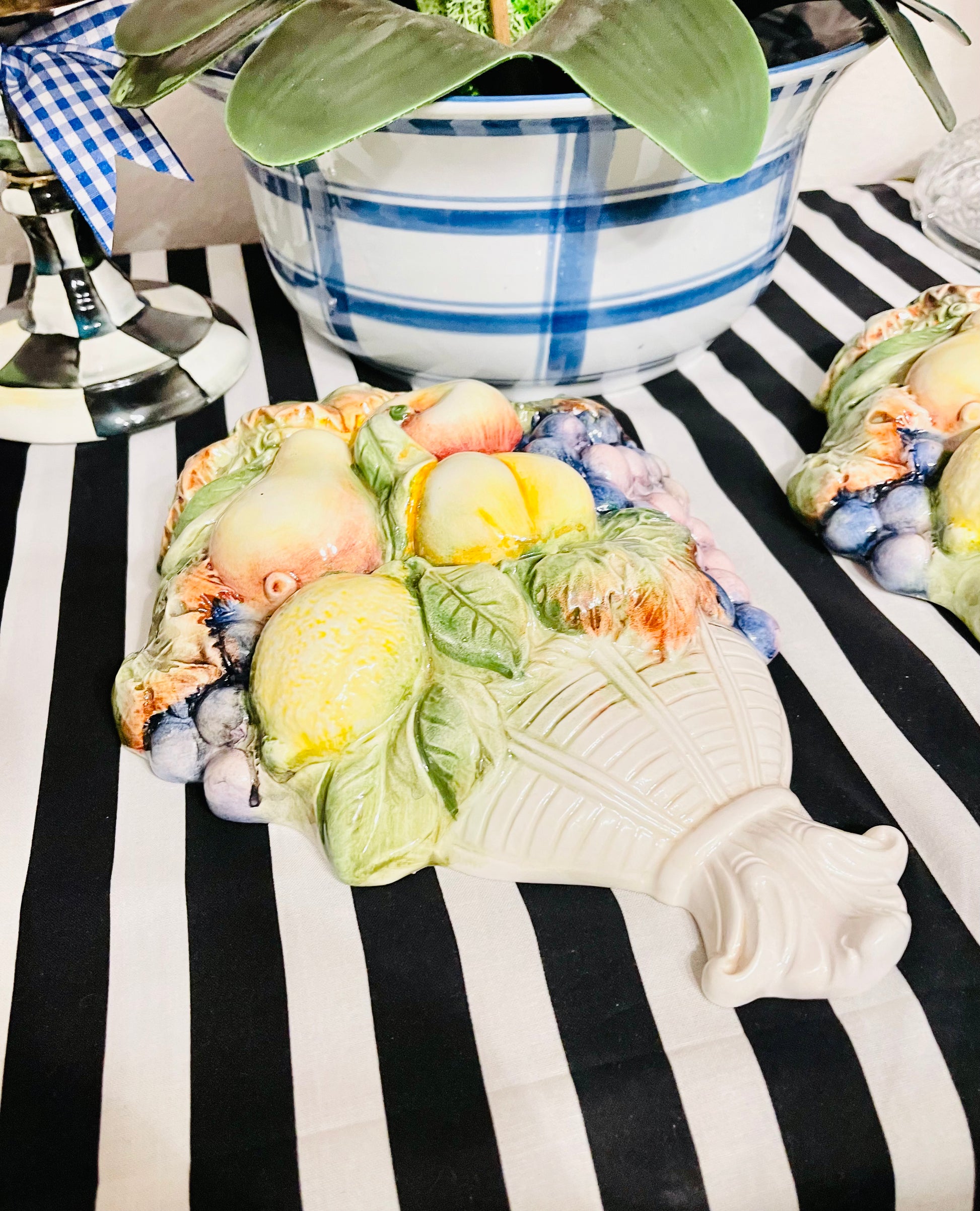 These Italian topiary wall hangings are soooo good... hand painted in soft hues, the fruit, including pears, lemons, apples, and grapes, is stacked high in beautifully realistic basket weave urns.
