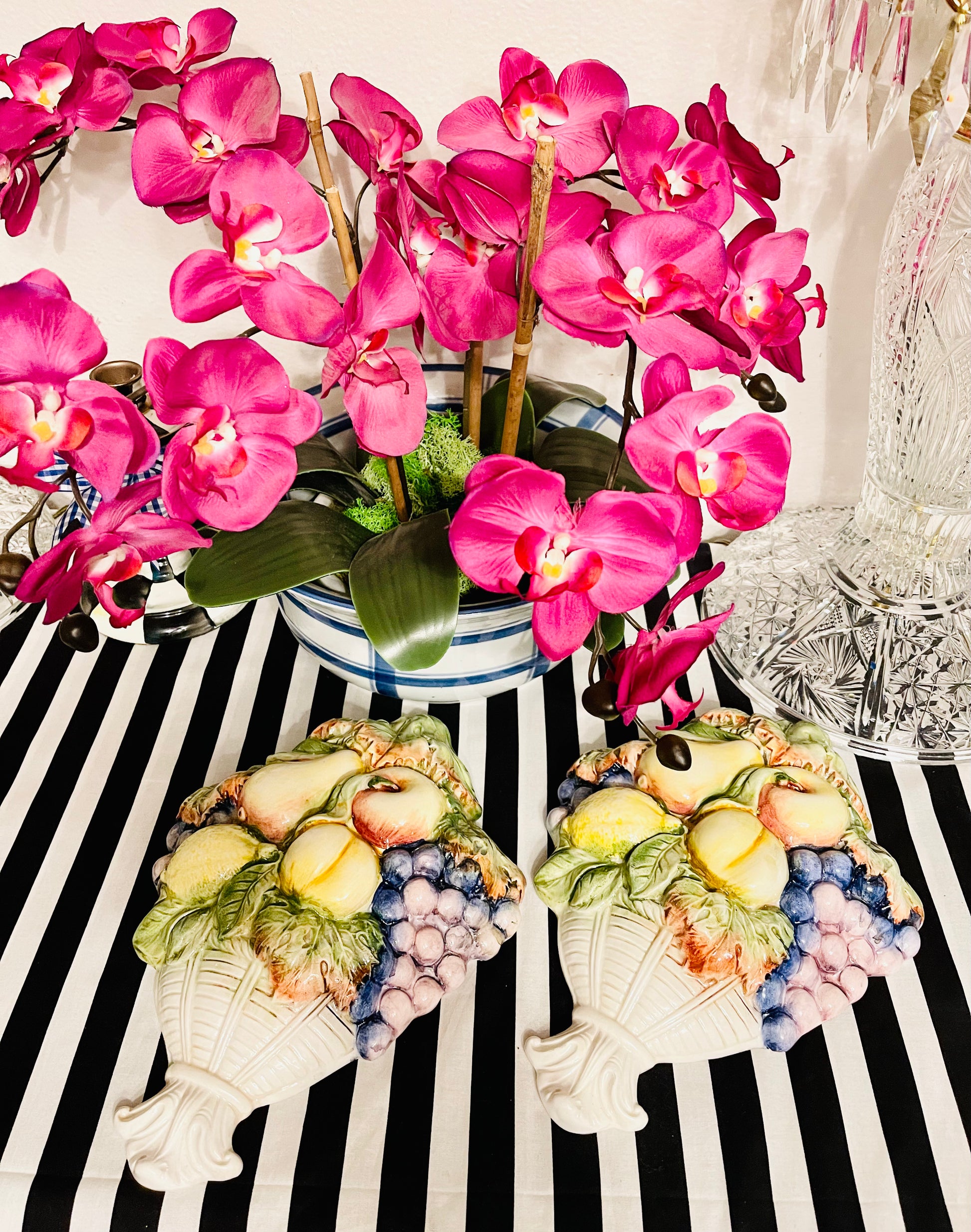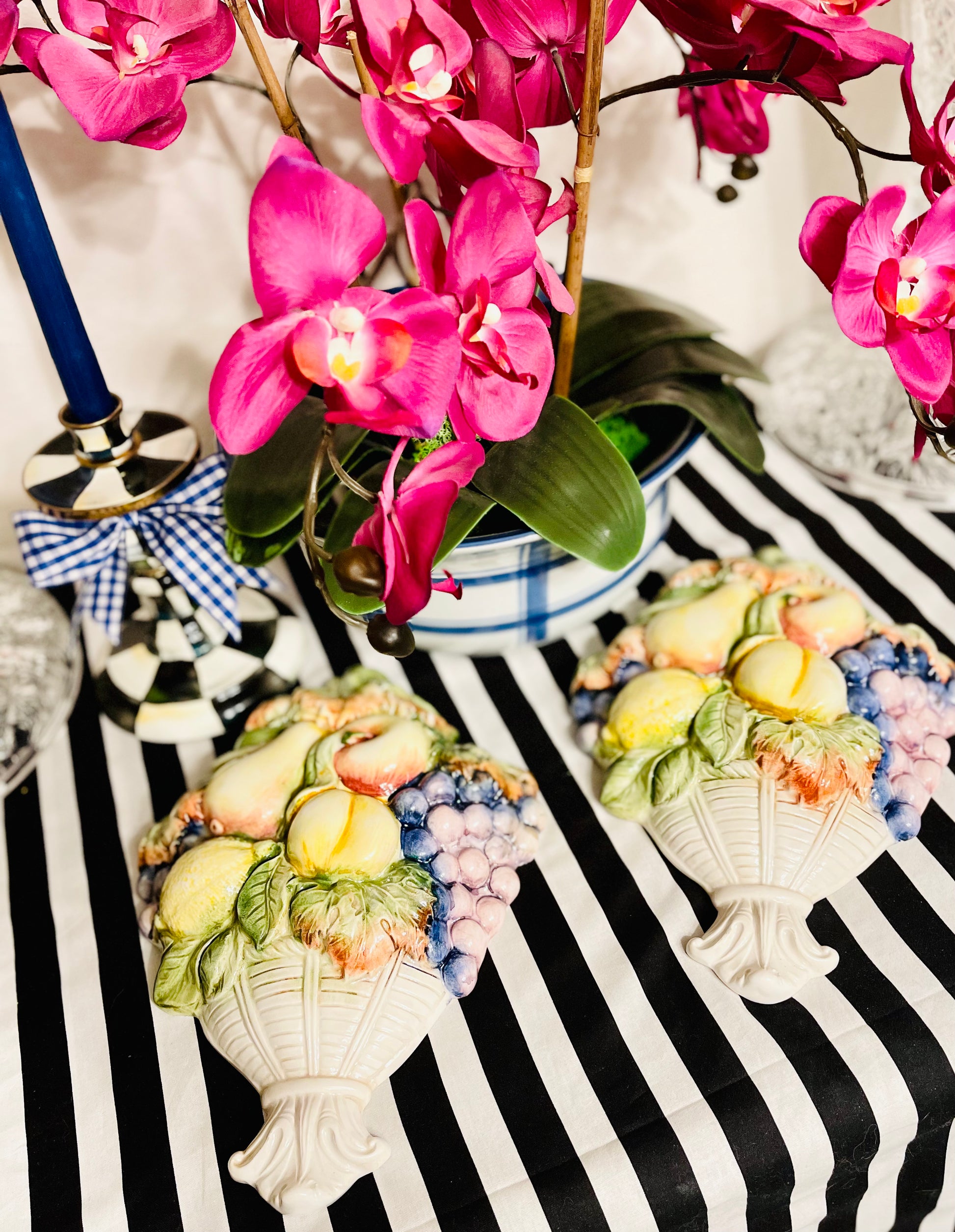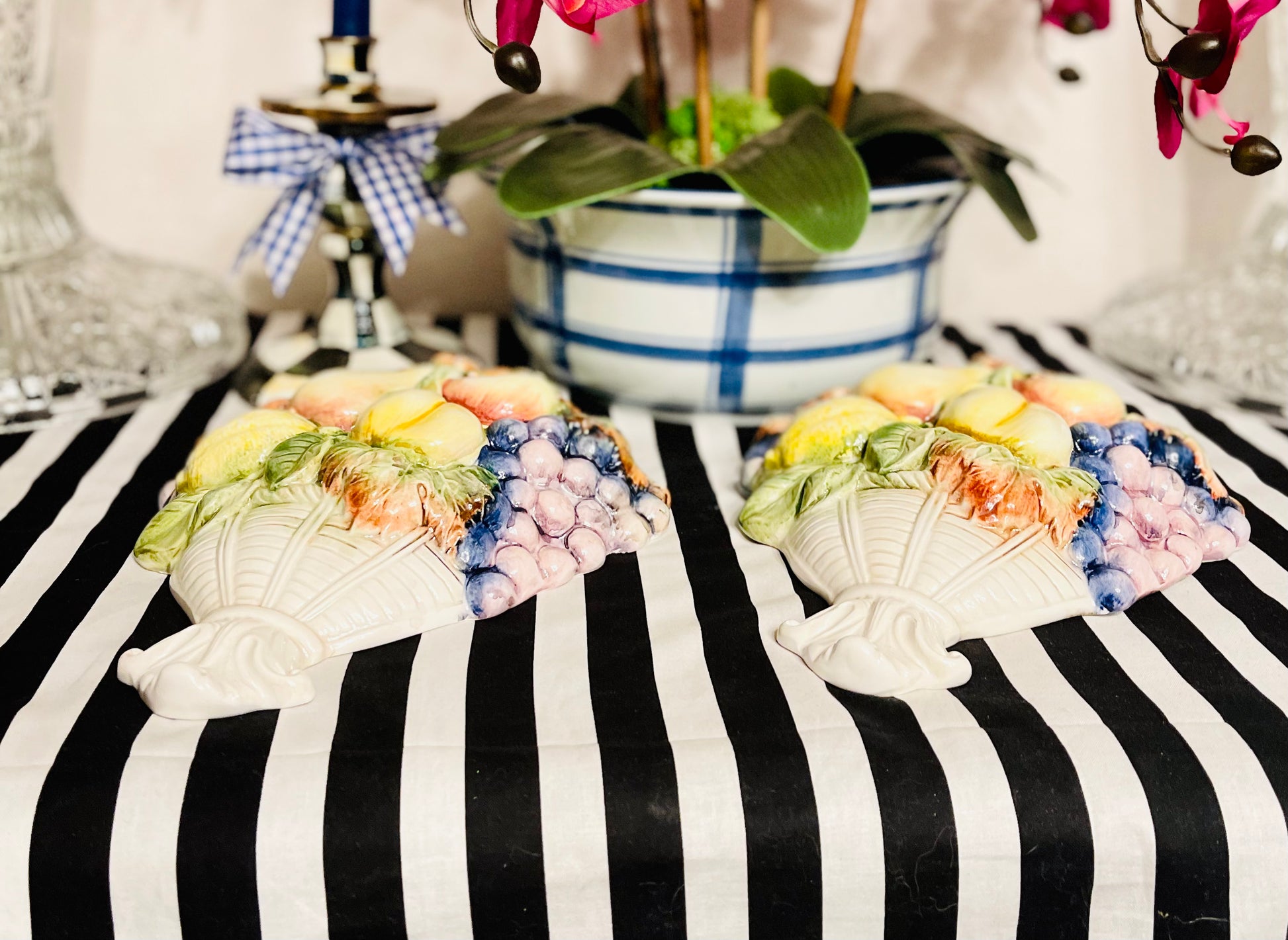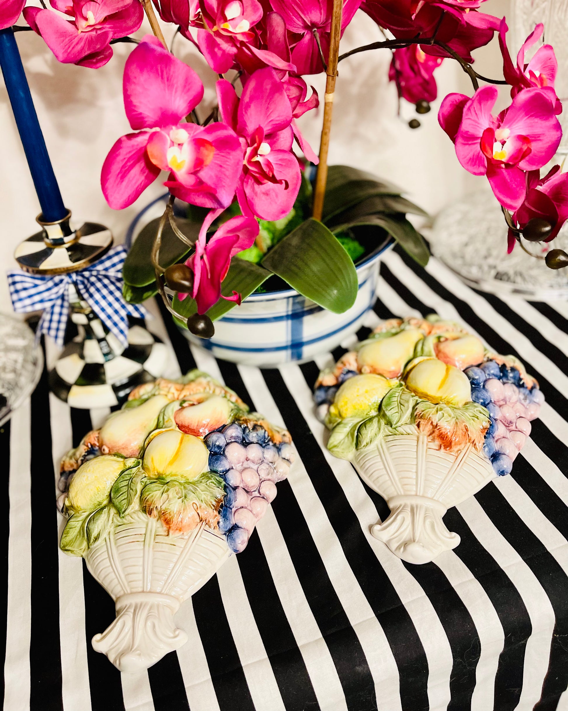 These Italian topiary wall hangings are soooo good... hand painted in soft hues, the fruit, including pears, lemons, apples, and grapes, is stacked high in beautifully realistic basket weave urns.