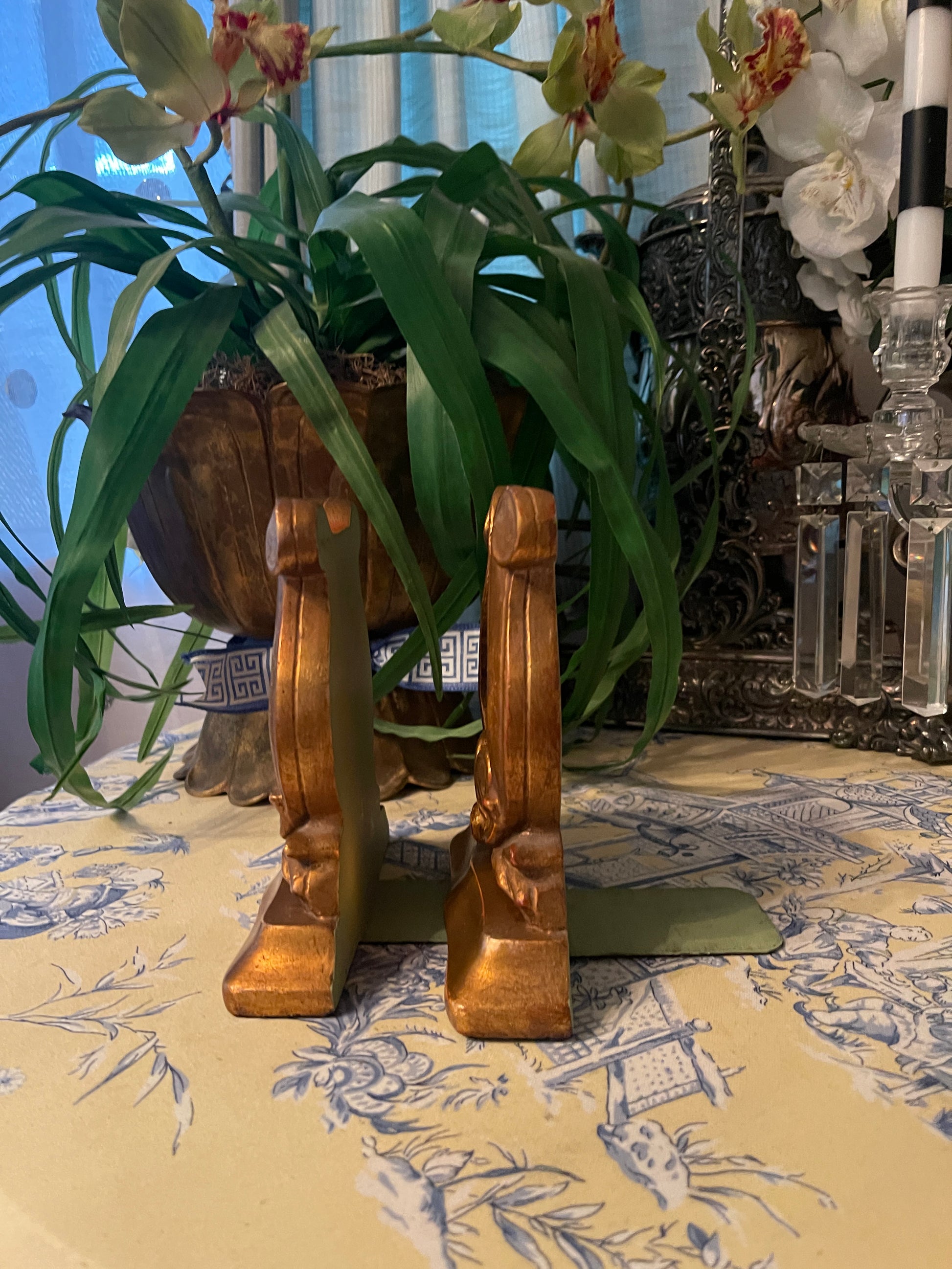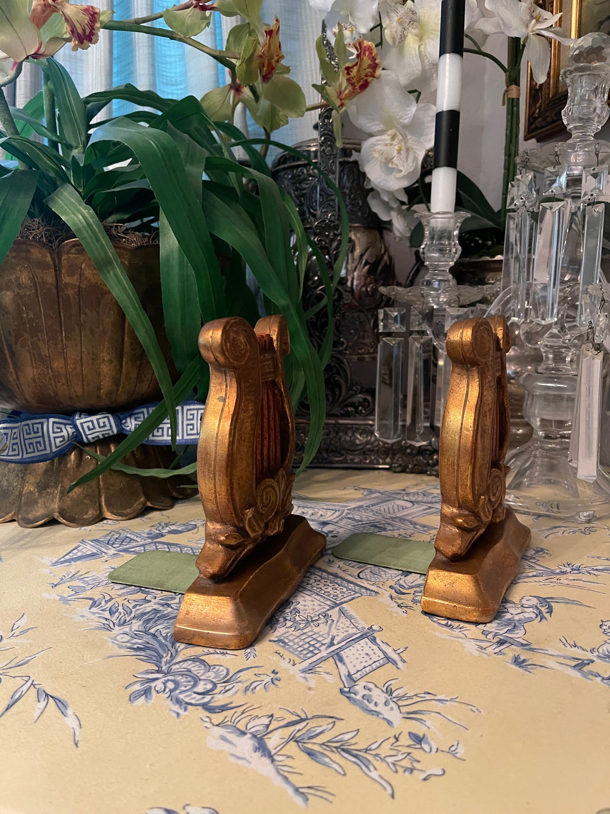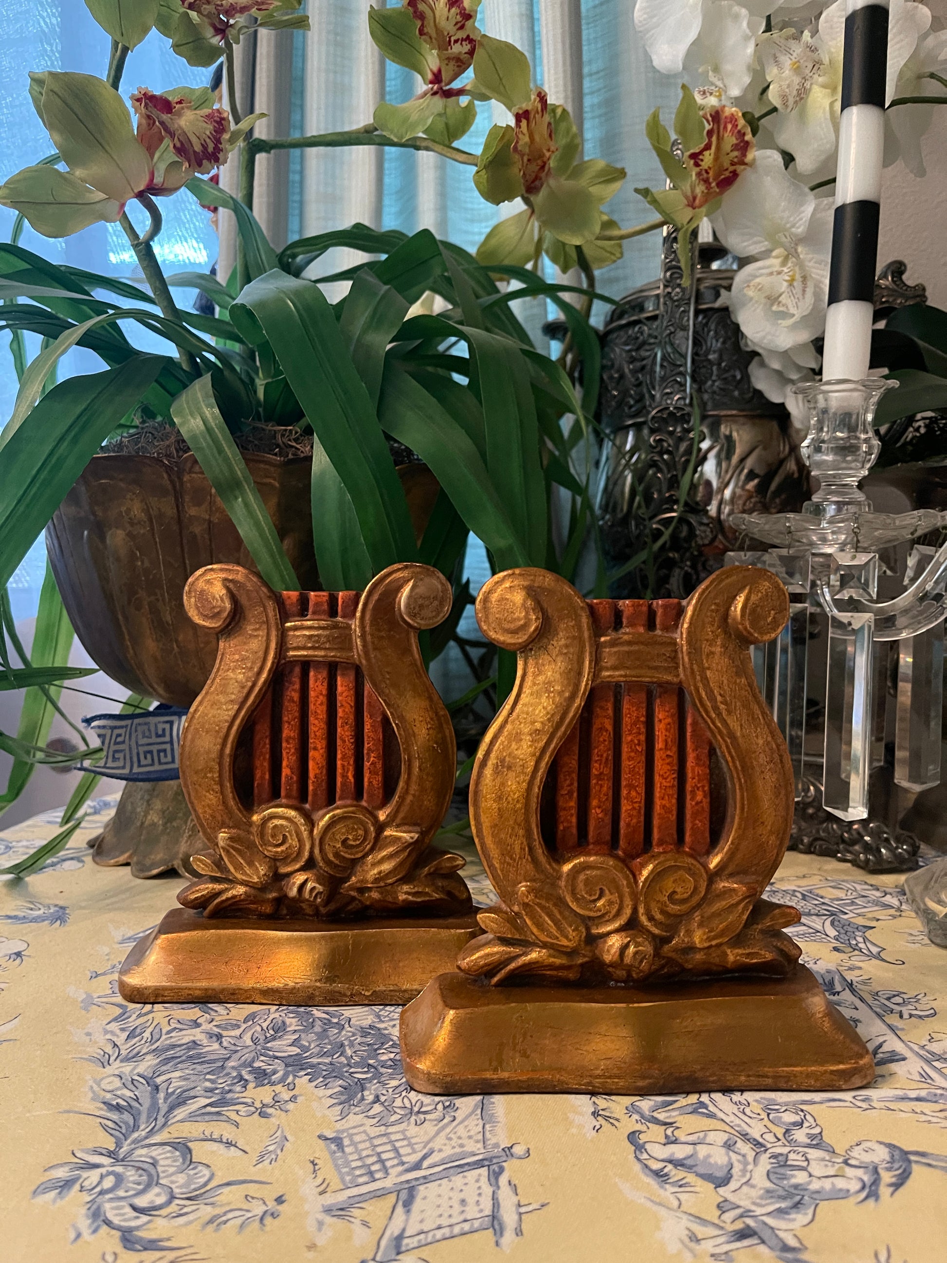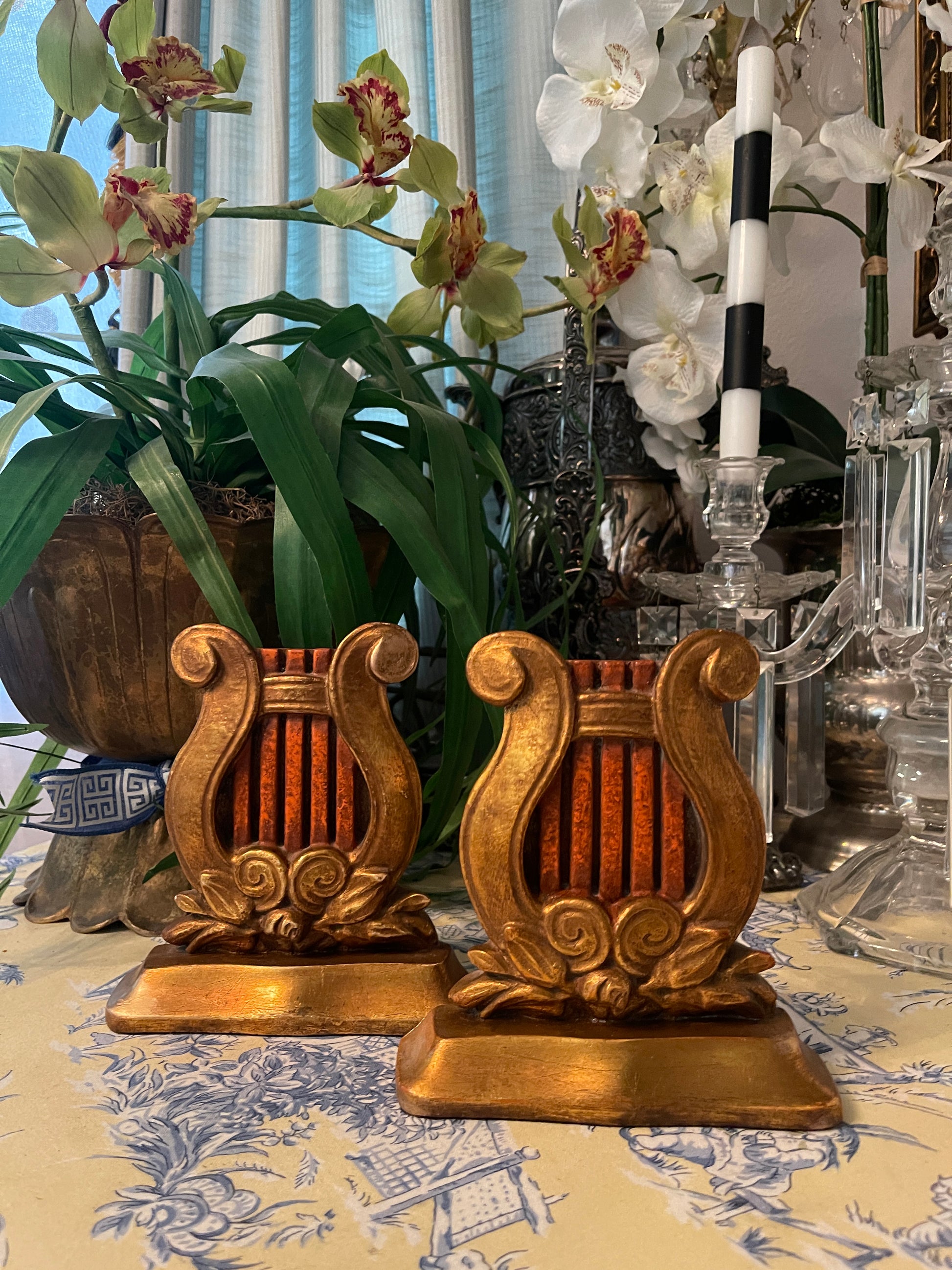 Pair of Vintage Borghese Gilt Lyre Bookends – Italian Hollywood Regency with Classical Flair