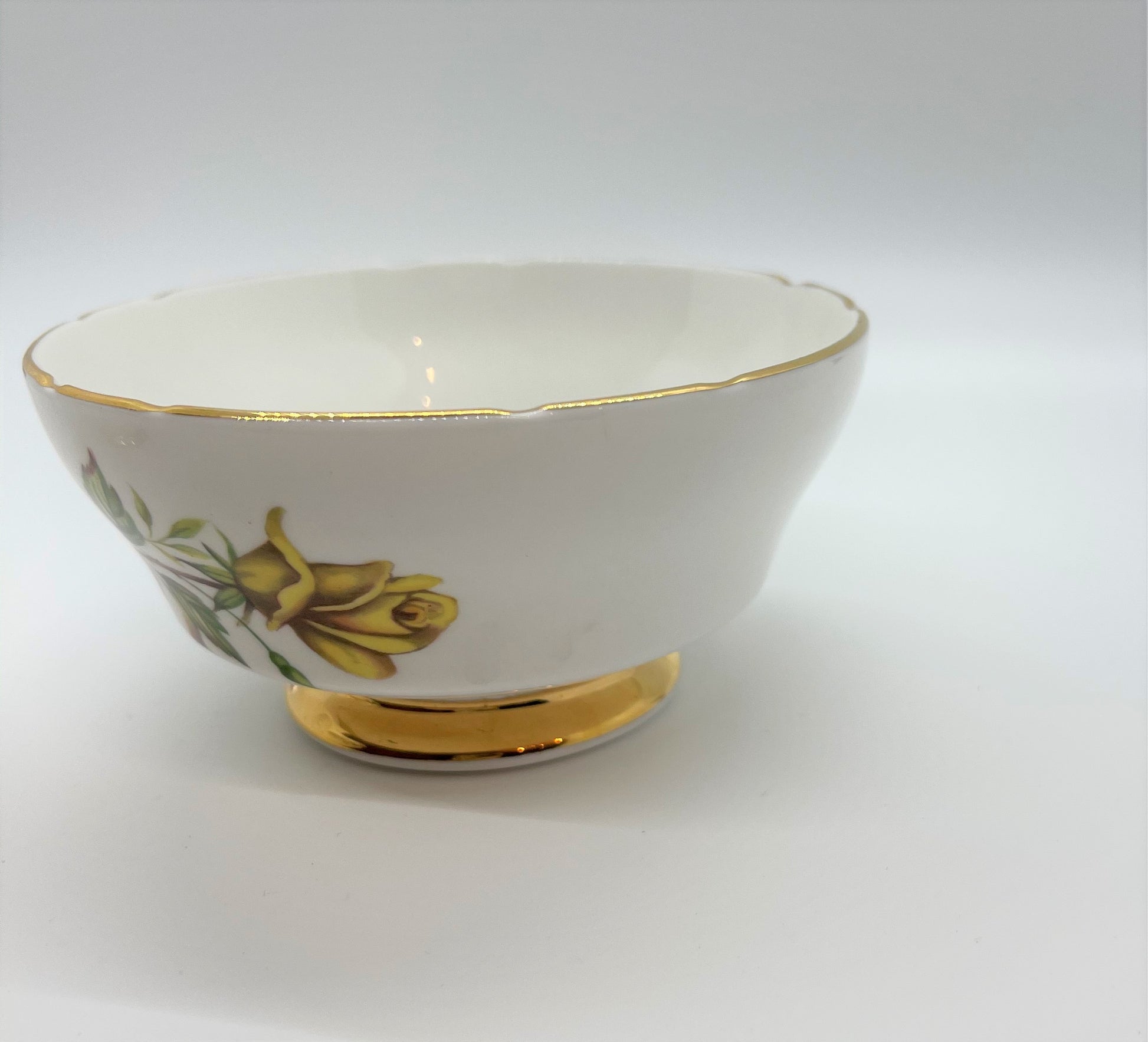 My Texas heart skipped a beat when I found this English Bone China set... It features a yellow rose and comes from a very old part of Austin. It's beautifully hand painted and trimmed in gold with so many lovely details. Both pieces are marked, By appointment to her Majesty The Queen China Potters Paragon Fine Bone China England Reg'd.