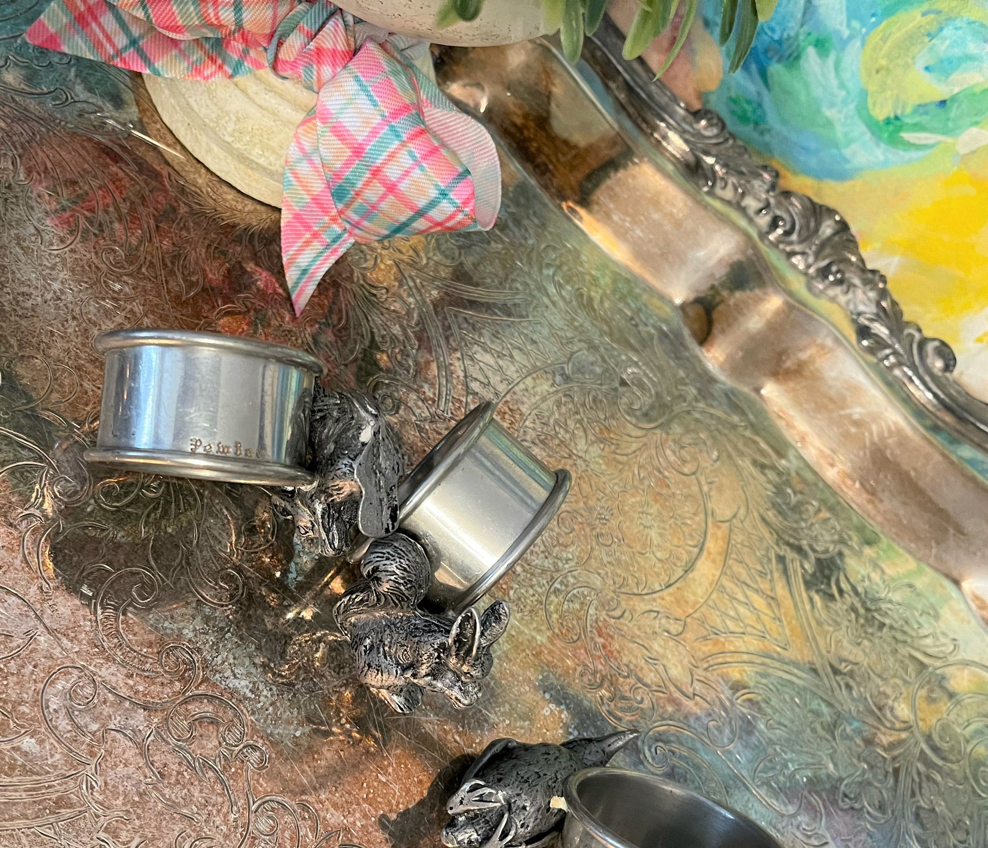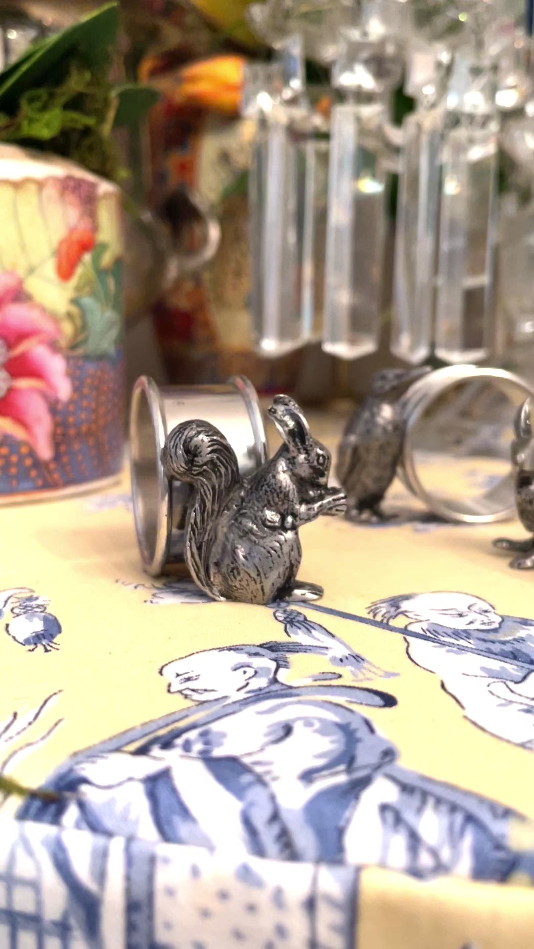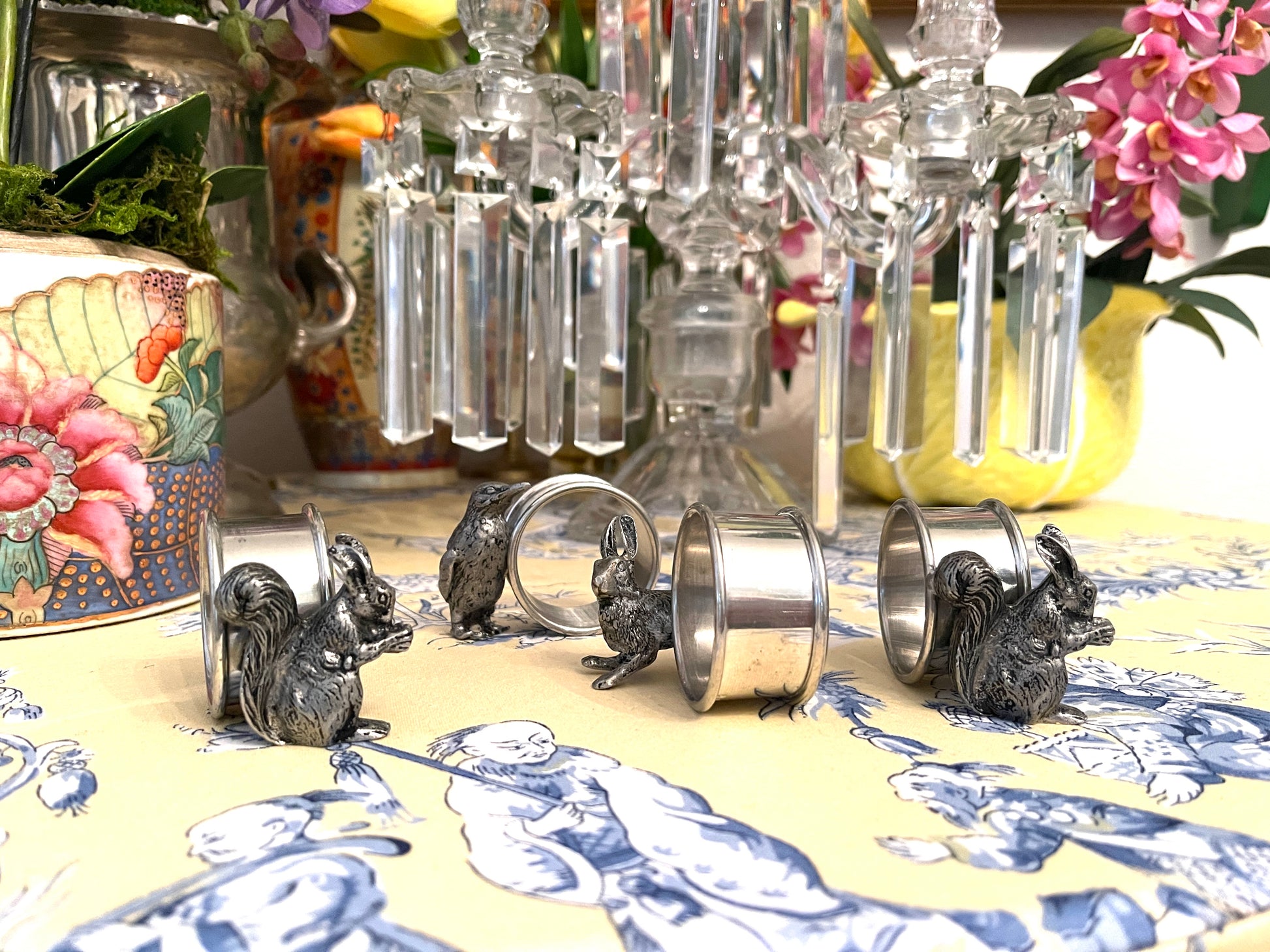 Vintage Pewter Napkin Rings, Set of 4, Squirrels, Rabbit, Penguin