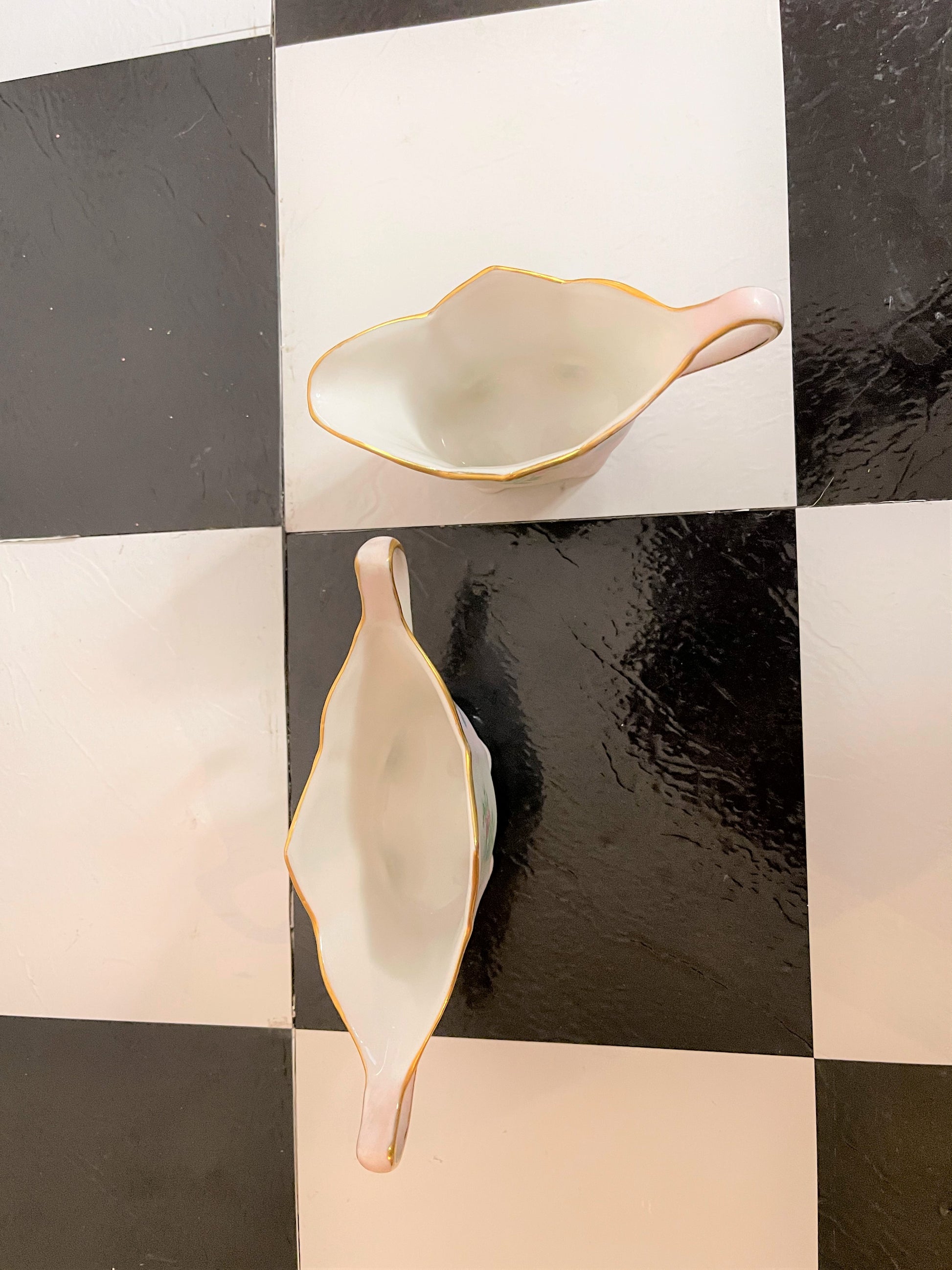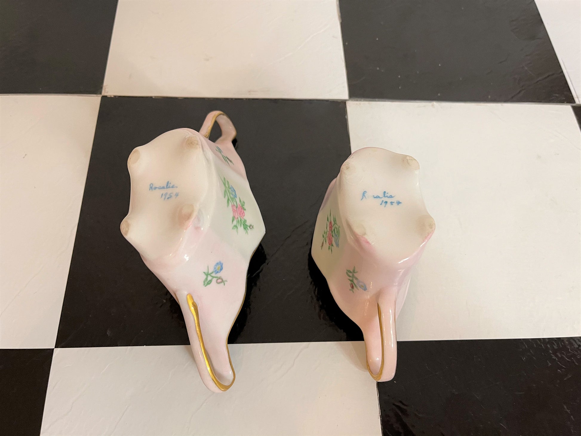 Darling Pink and White Cream and Sugar Set. Hand painted in pink and white with floral bouquets and trimmed in gold. Each piece is signed and dated: Rosalie 1954. They are in fantastic condition and will be such a charming addition to any tablescape or Sunday Brunch. They are truly FAB!!
