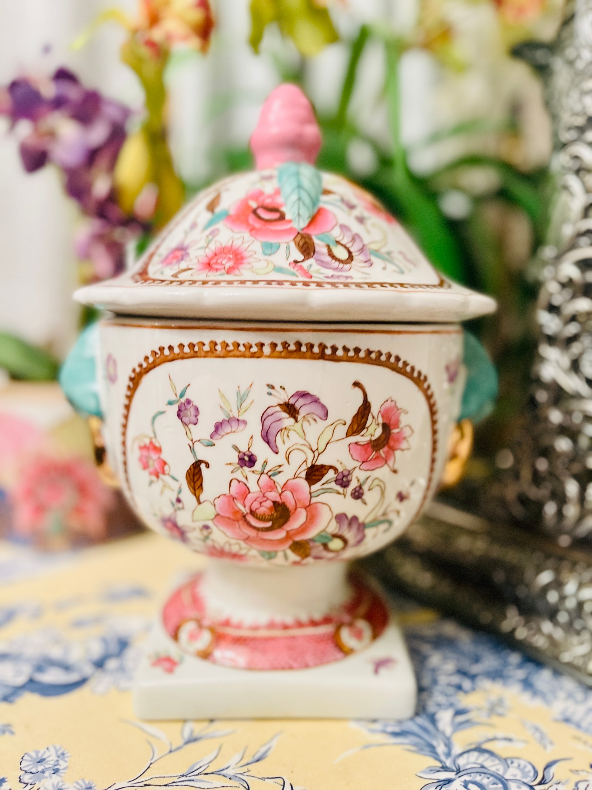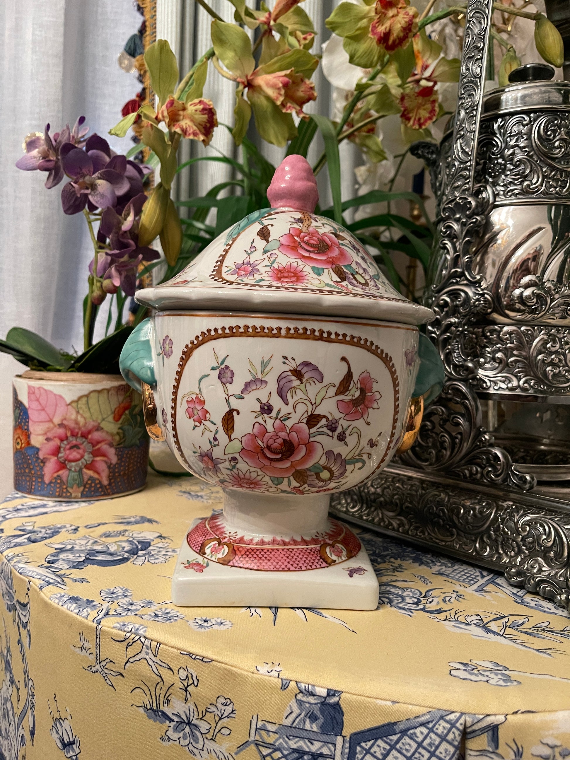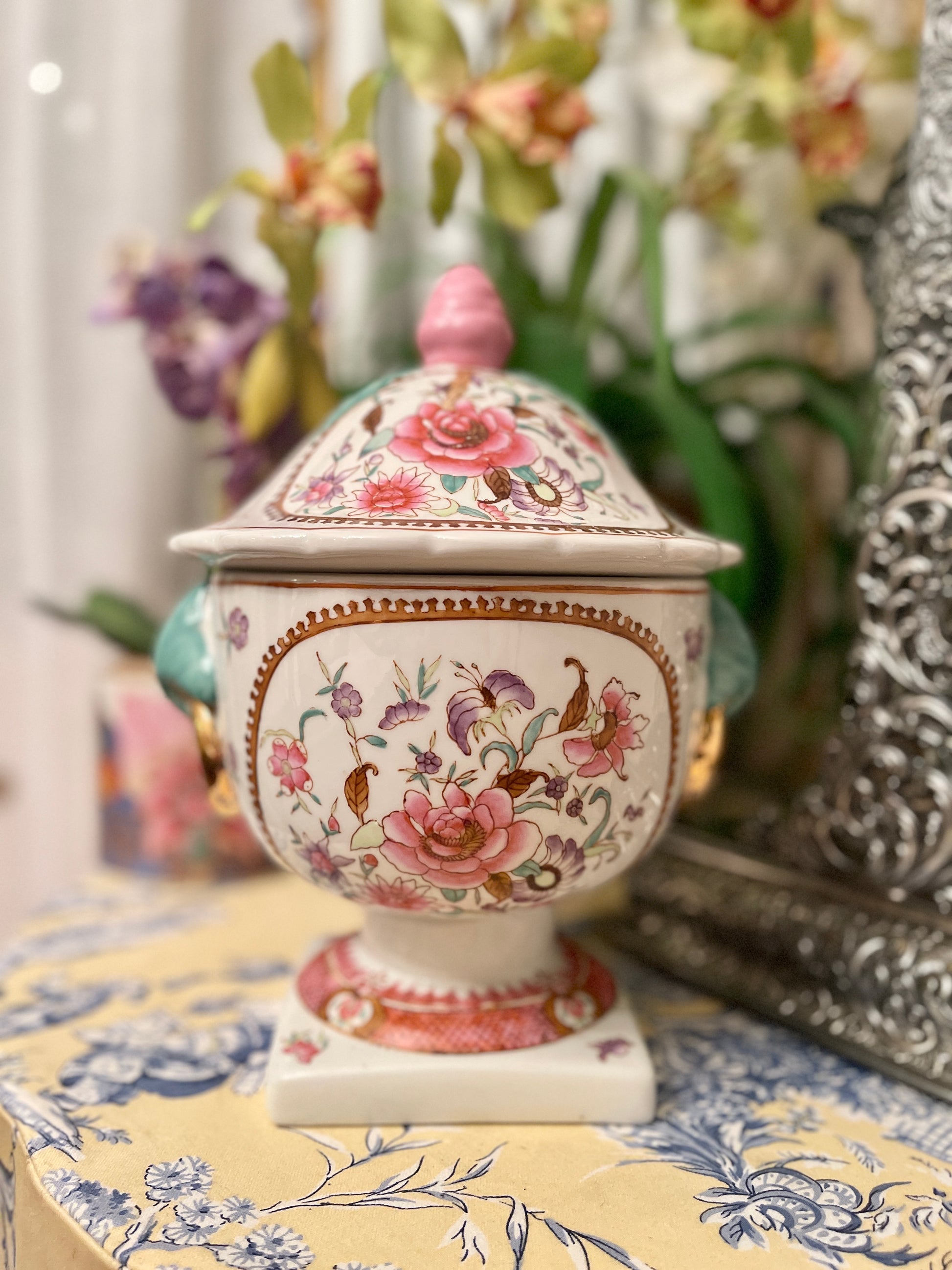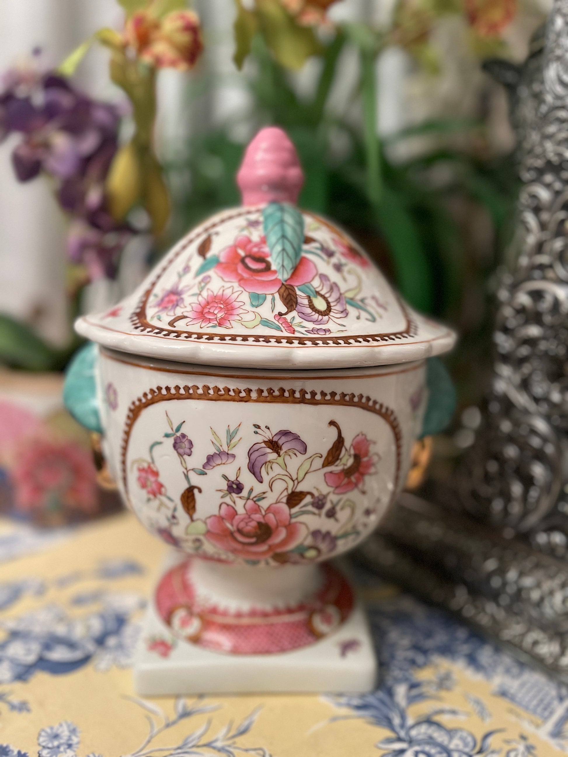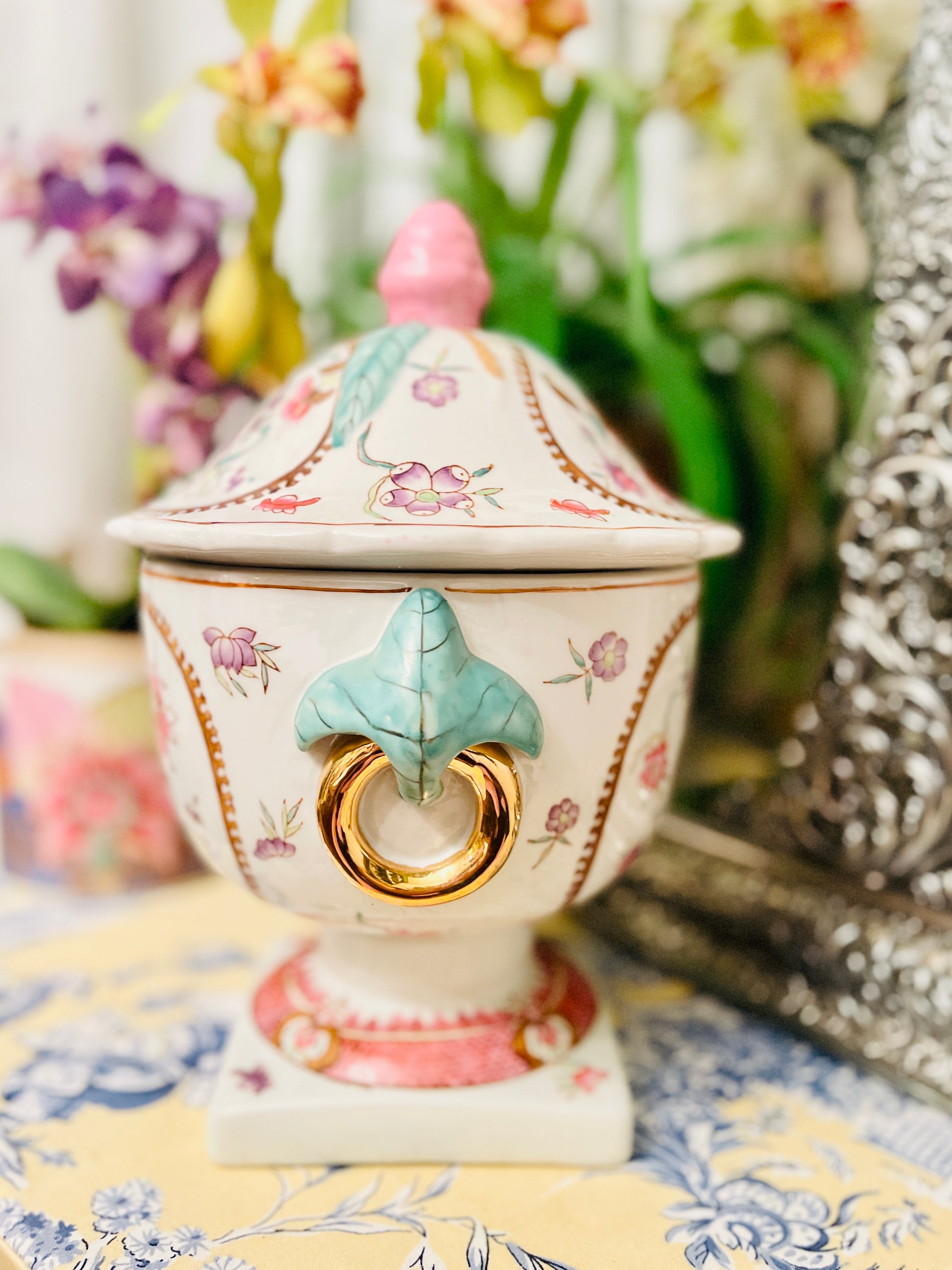 Vintage Chinoiserie hand painted lidded pedestal compote dish embellished with botanicals in the glorious colorway of pink, green, and lavender, with a touches of brown to ground it all. I love the gold ring embellishments.
