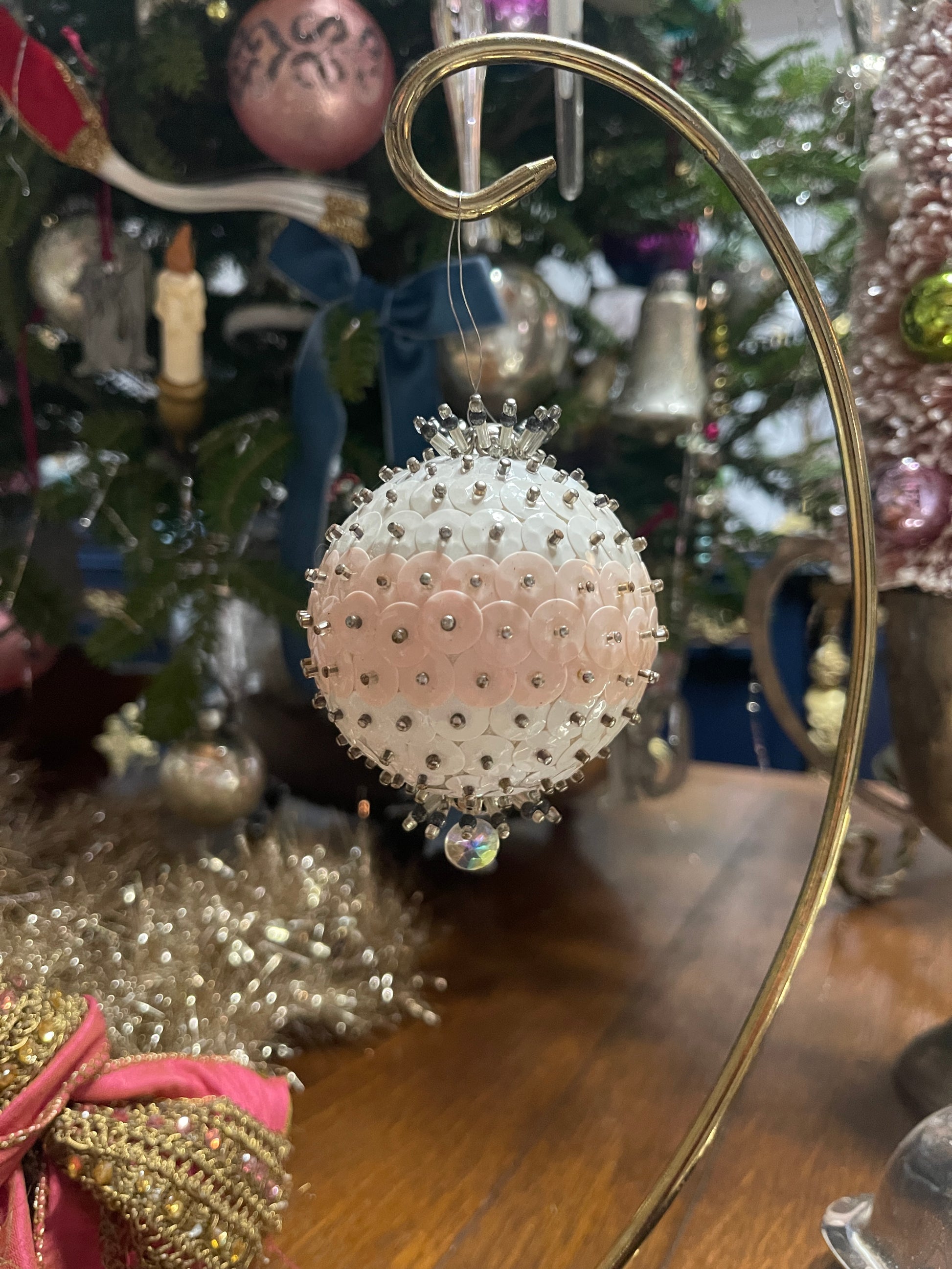 Step into a storybook Christmas with these exquisite vintage push pin ornaments, all sourced from the same posh estate nestled deep in the rolling hills of the Texas Hill Country. These handmade treasures shimmer with old-fashioned glamour…Each tells its own tale of holiday parties past: grand Southern gatherings beneath crystal chandeliers, silver trays of petit fours, and Bing Crosby crooning softly in the background.
