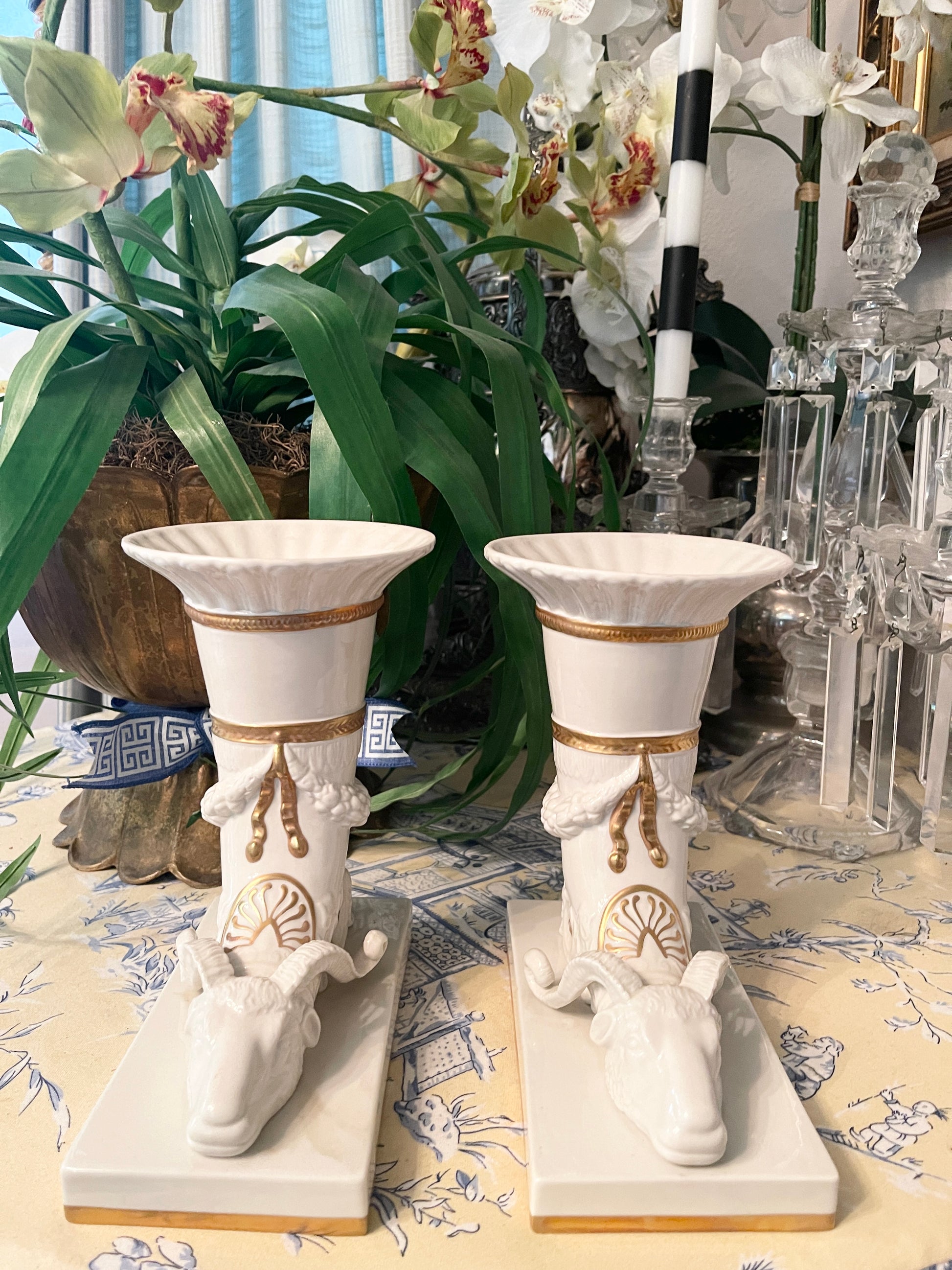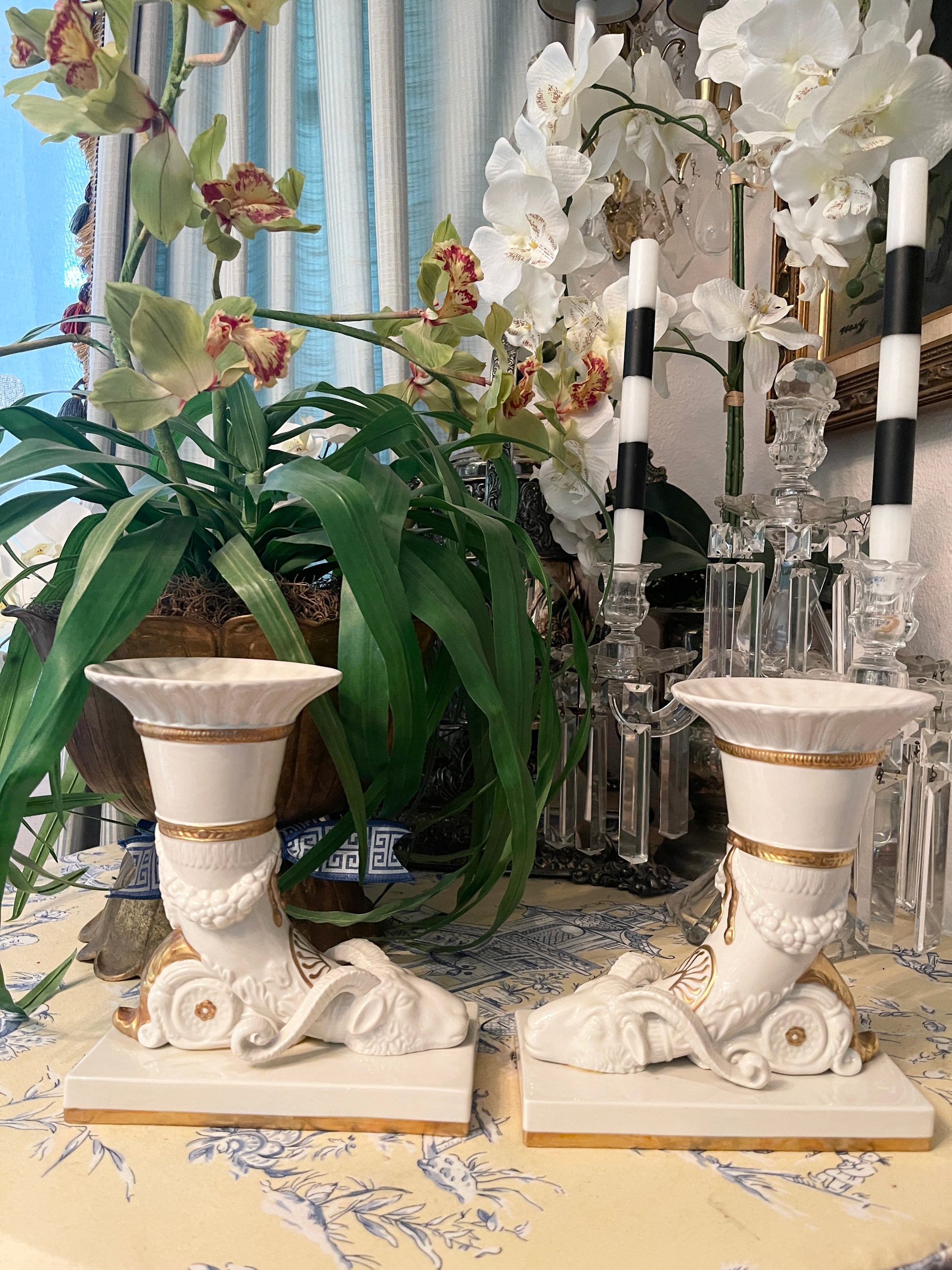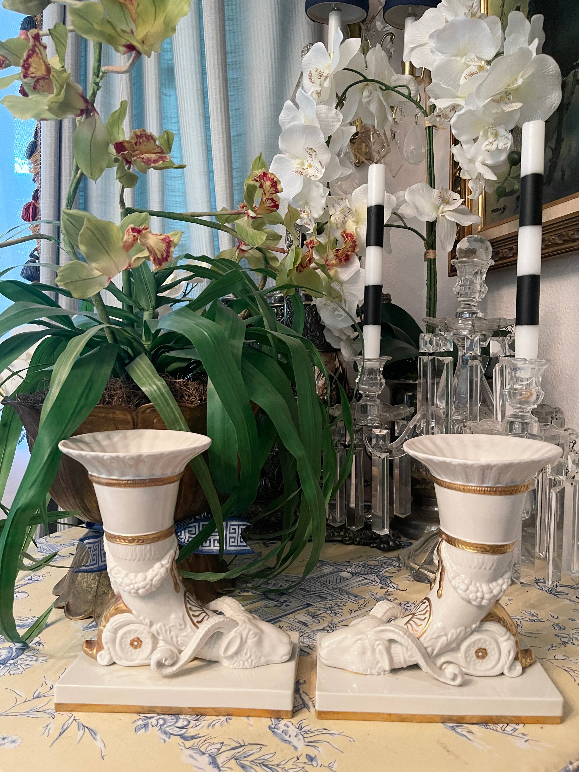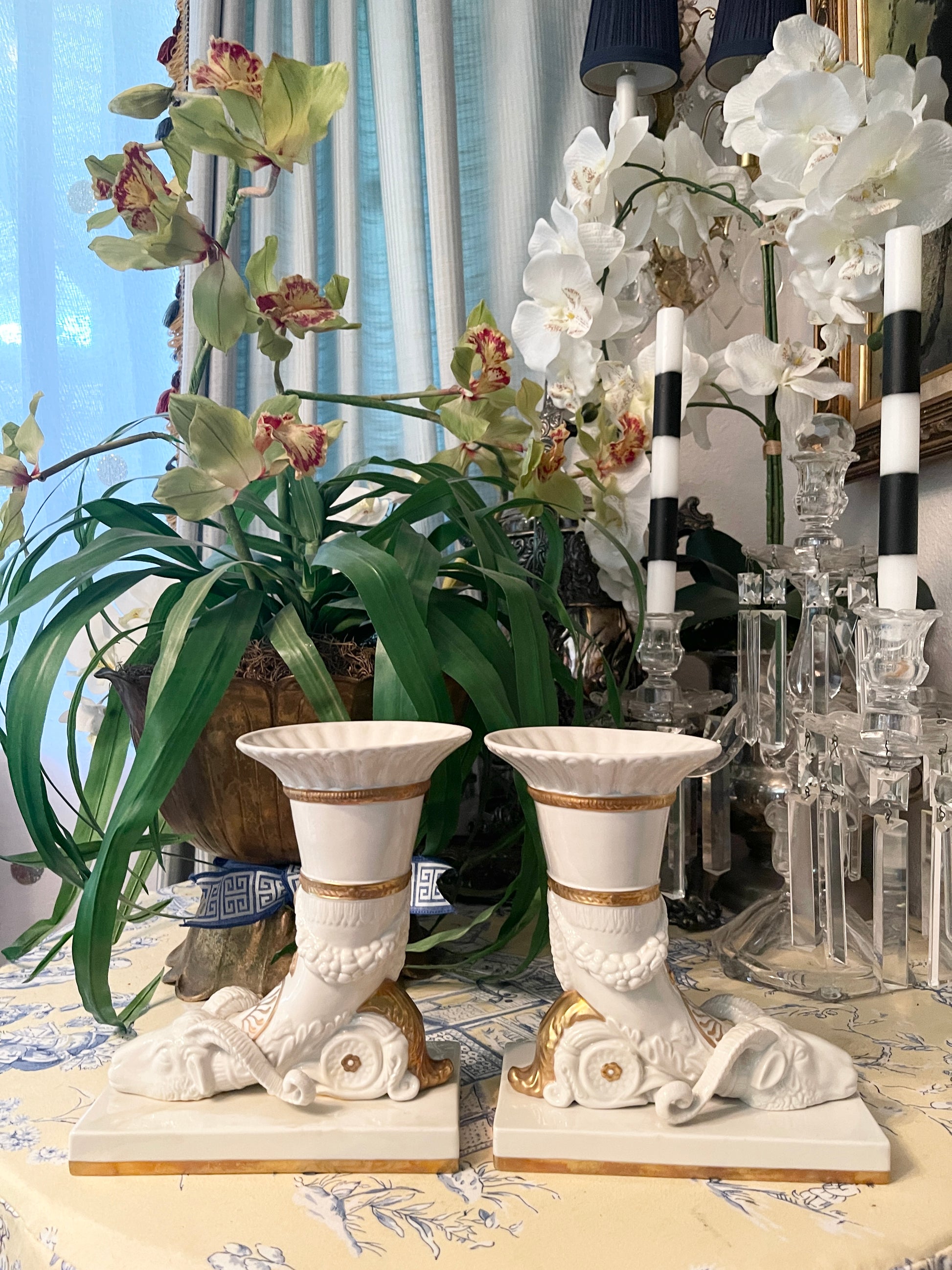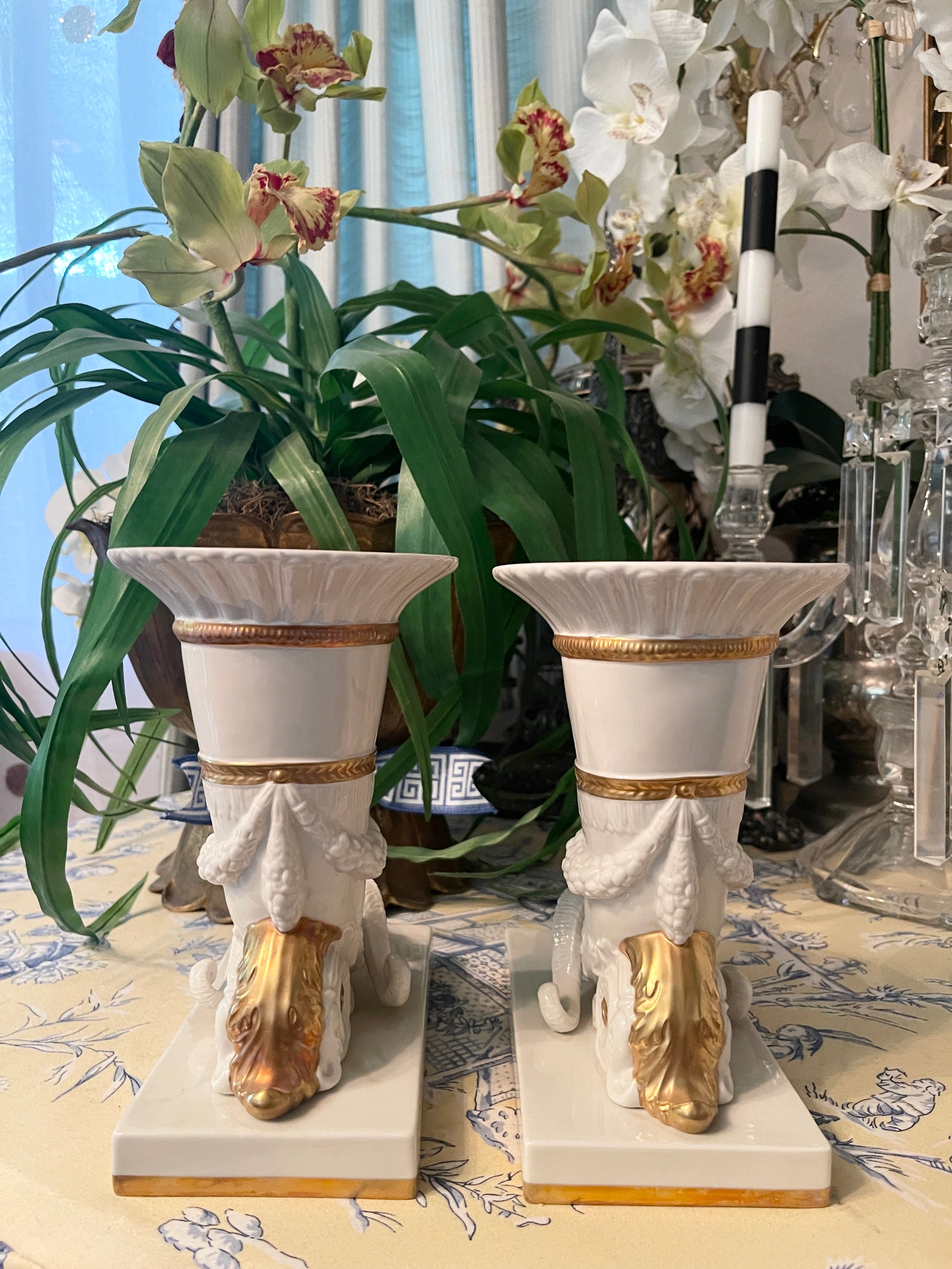 A stunning neoclassical statement, this exquisite pair of Italian parcel-gilt porcelain rhyton vases is a masterful nod to ancient Greco-Roman form and 19th-century revivalist luxury. Each vase is sculpted in the shape of a cornucopia or rhyton—a ceremonial drinking horn—gracefully emerging from the head of a stylized ram, complete with curling horns, classical scrollwork, and rich gold detailing.