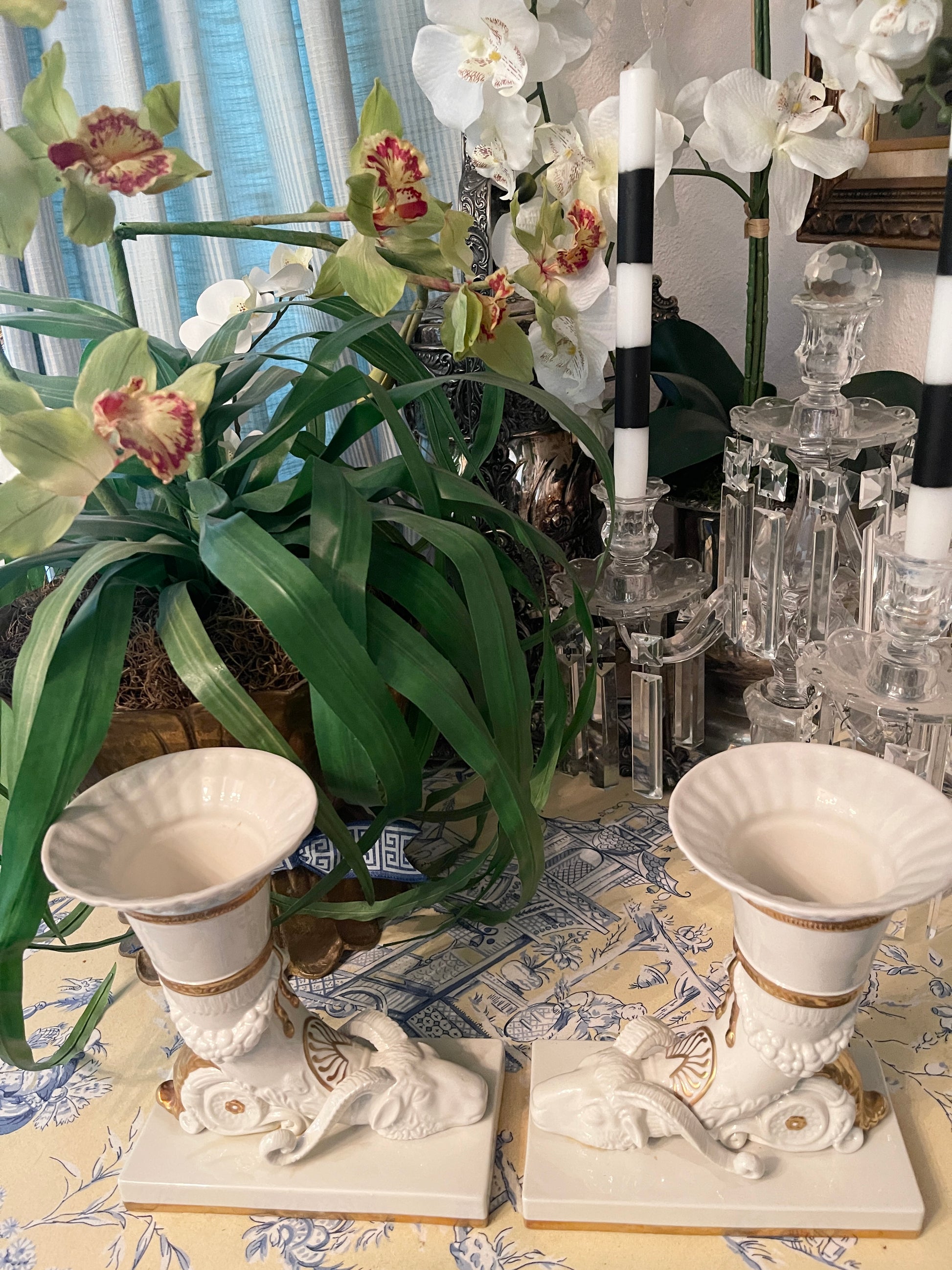 Delicately glazed in creamy white porcelain and accented with gilded laurel swags and bands, the vases rest atop squared bases rimmed in gold, offering an elevated presentation perfect for flanking a mantel, anchoring a bookshelf, or adorning a collector’s cabinet. The dramatic silhouette, detailed relief work, and high-contrast gold embellishment make these pieces a sophisticated addition to any grandmillennial, neoclassical, or European-inspired interior.