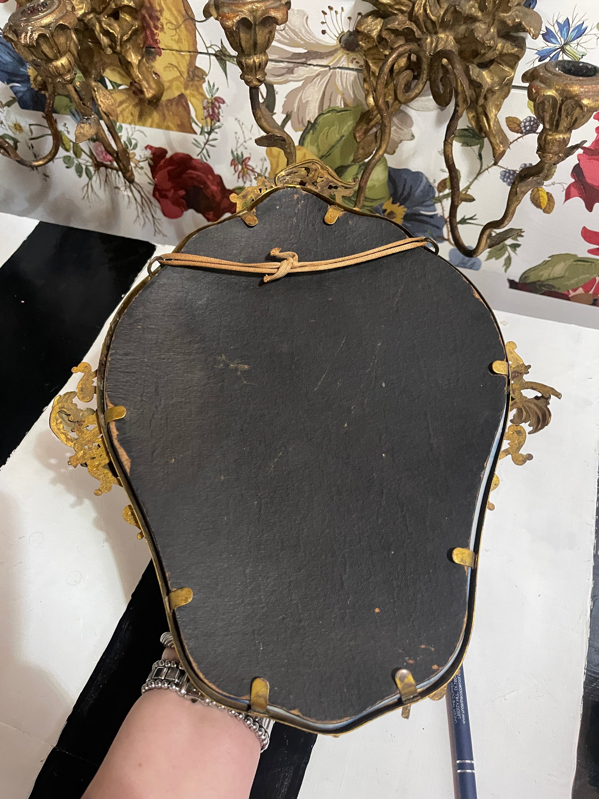 Antique Wave Crest Porcelain Plaque, Pink Roses on Opaque White with Gold Rococo Scrolled Metal Border