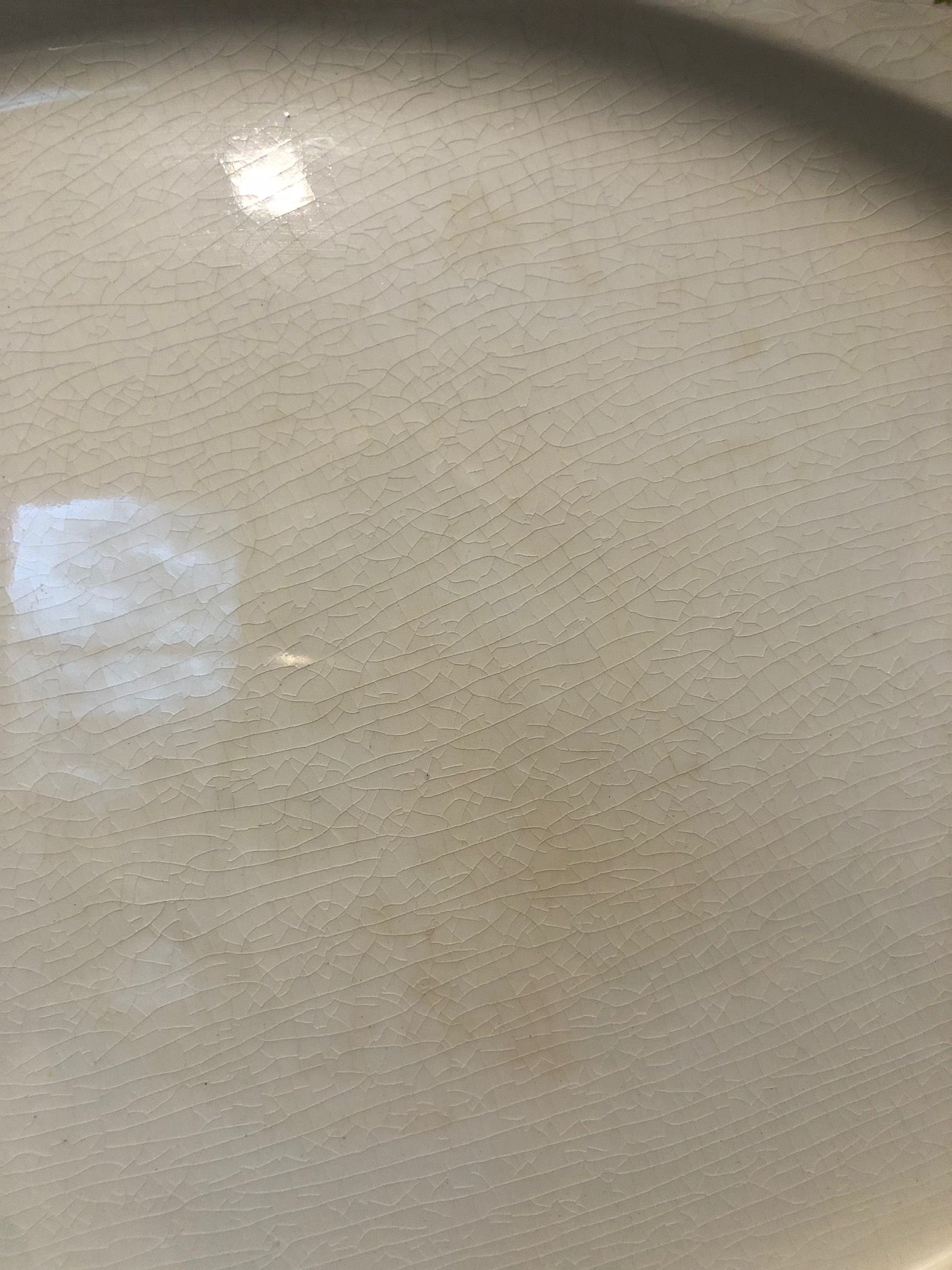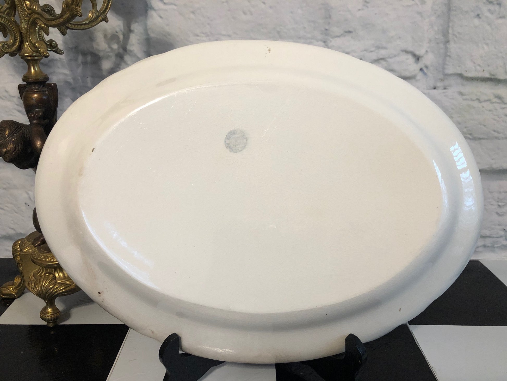 There is crazing and discoloration and even a few little imperfections in the original finish, but it still has a lot if life left as a serving piece, a focal point on a plate wall, or as one of my favorite uses...a tray for potted plants or bud vases with flowers. Marked Excelsor Porcelain.