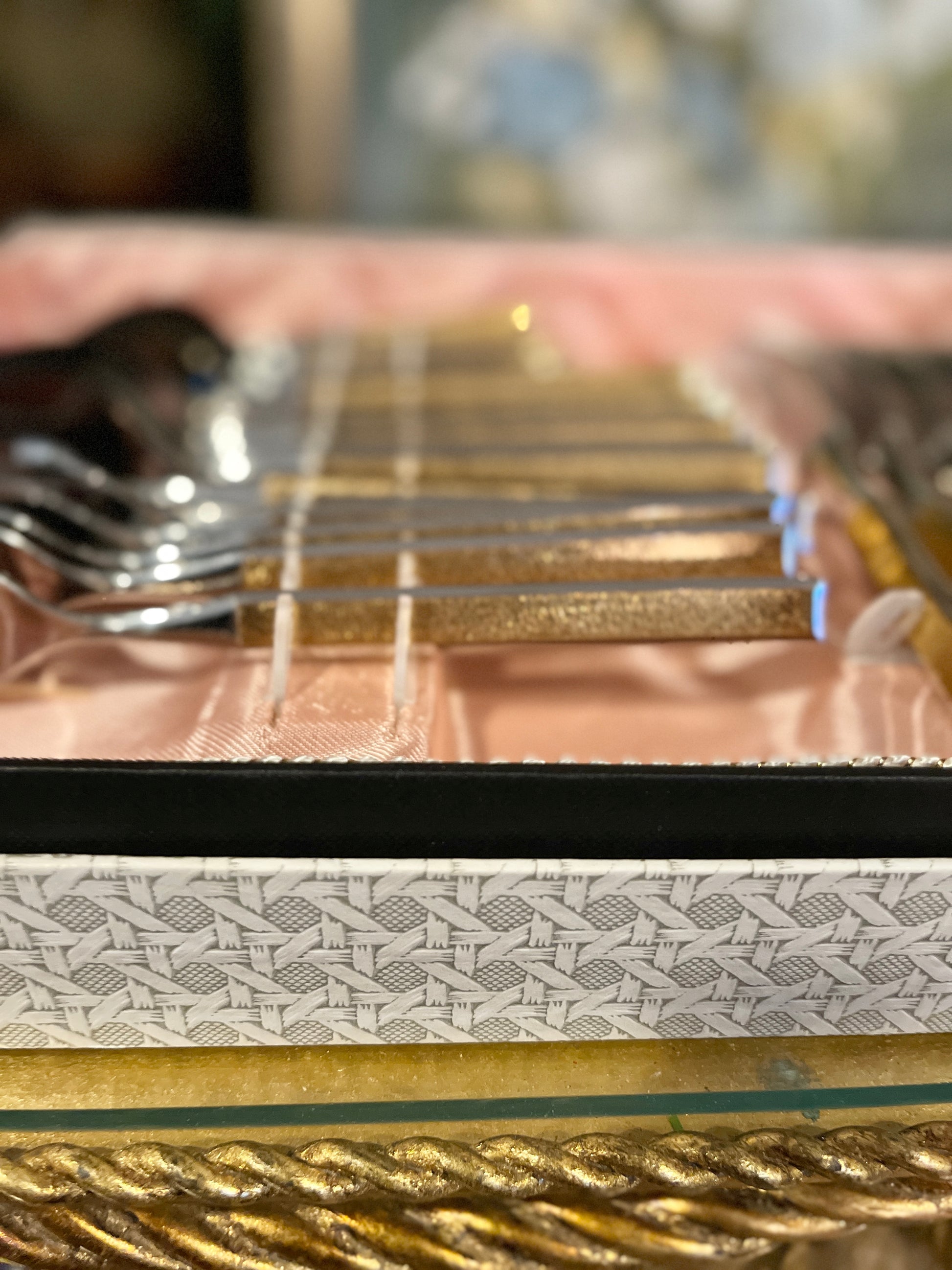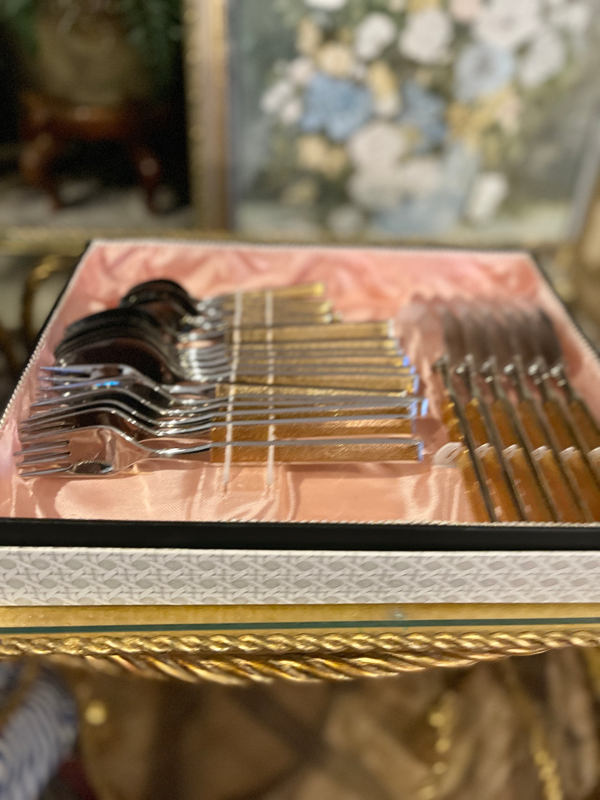 Vintage 1980s Remalux Flatware set in stainless and textured 24kt gold plate. Made in Germany. In the original box.