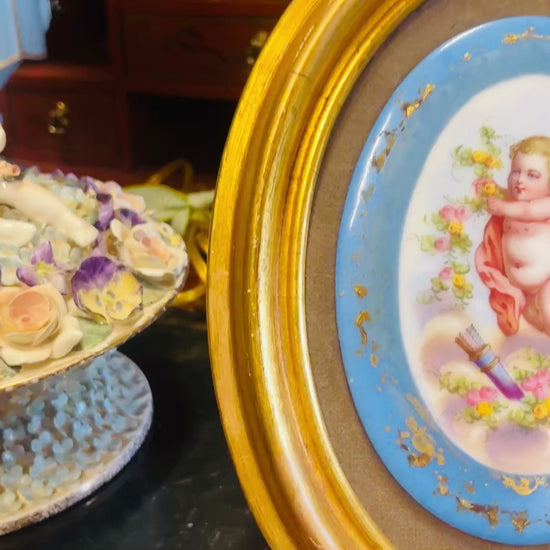Whispering of l’amour and the opulence of 18th-century France, this exquisite hand-painted porcelain plaque captures the timeless charm of a fluttering cherub surrounded by delicate blossoms and clouds of pale pink and blue. Encircled by a ribbon of powder-blue with gilt flourishes and framed in a lavishly gilded oval frame, it evokes the gilded salons of Versailles and the romance of the French Rococo era.