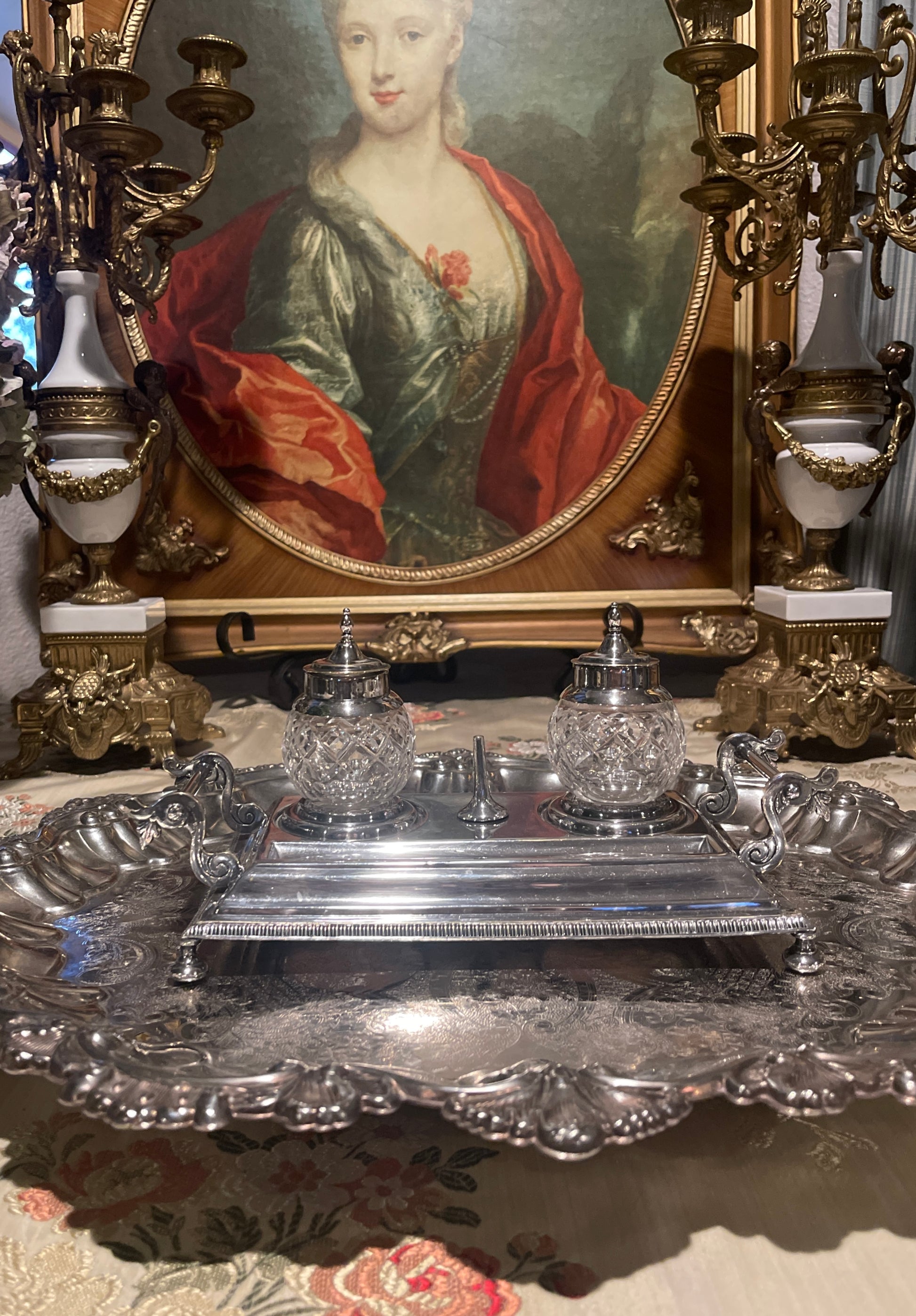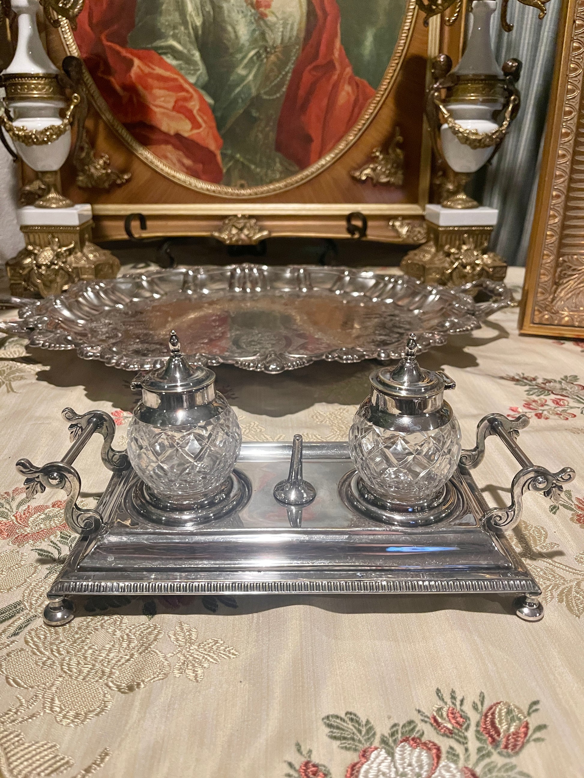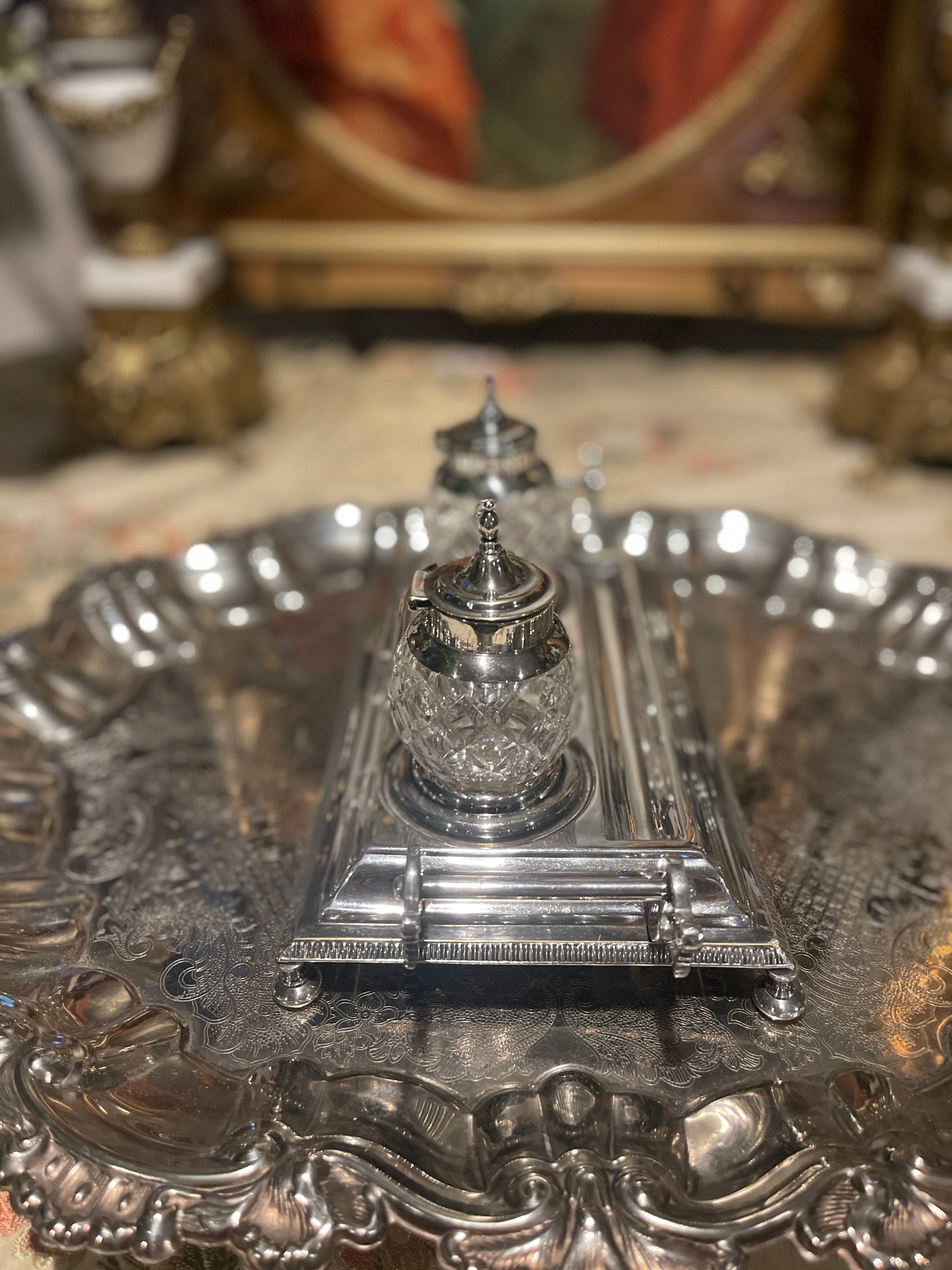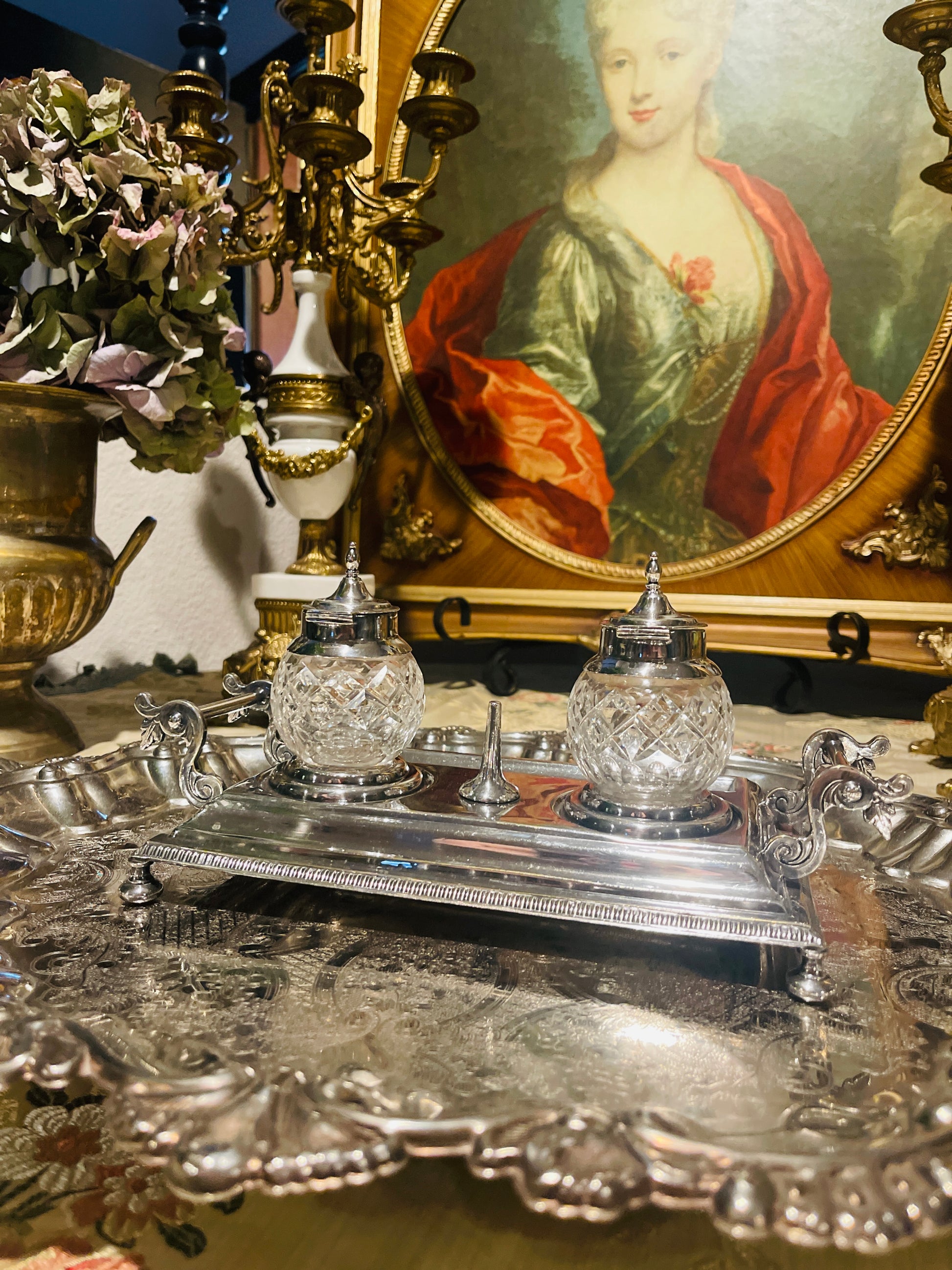 Classic Silver Plate and Cut Crystal Ink Well, Estate Decor