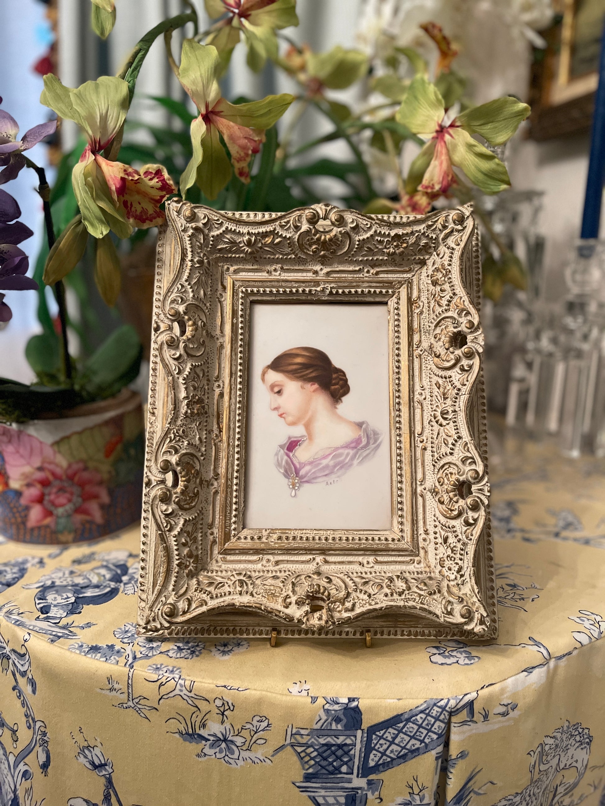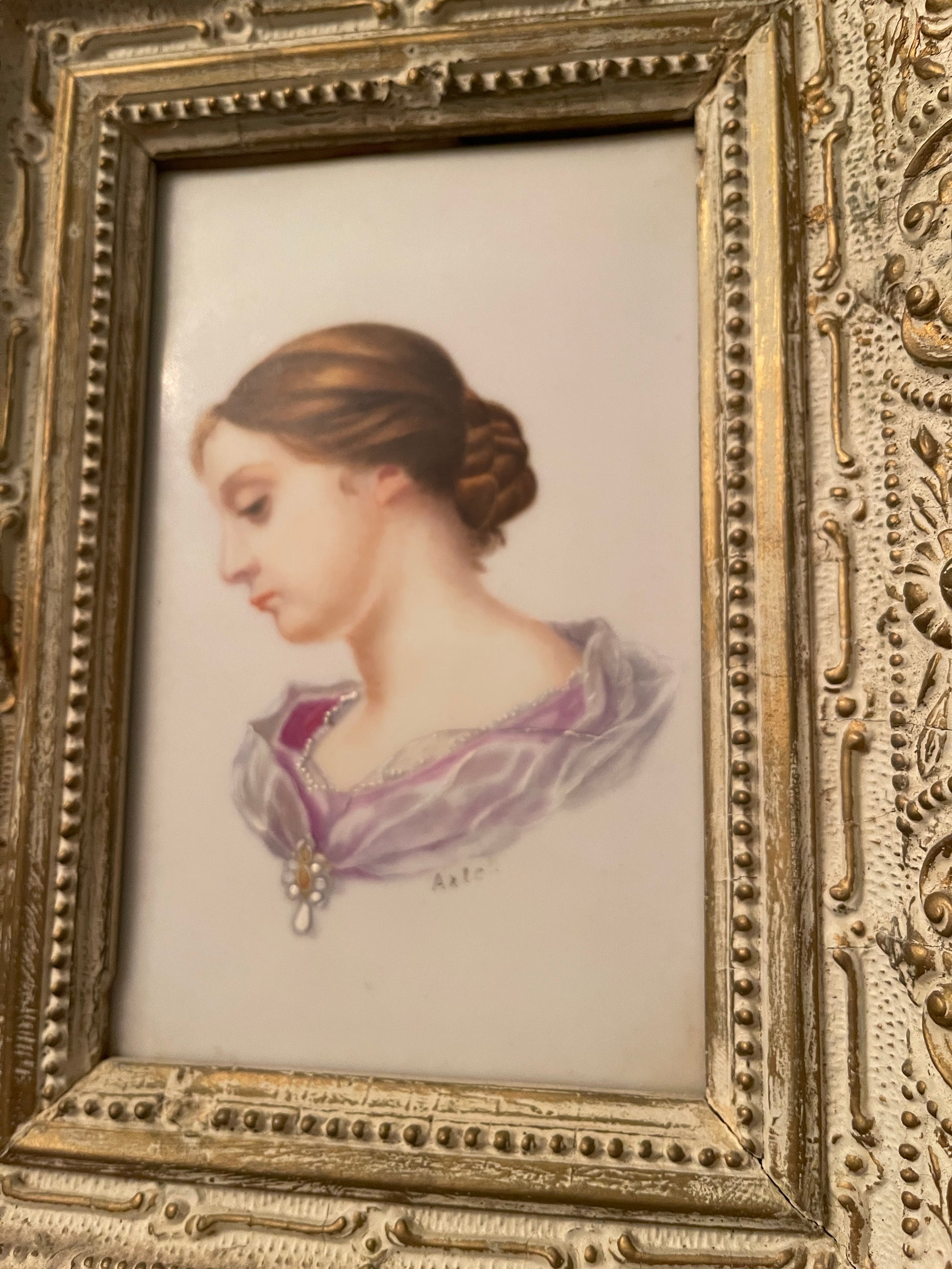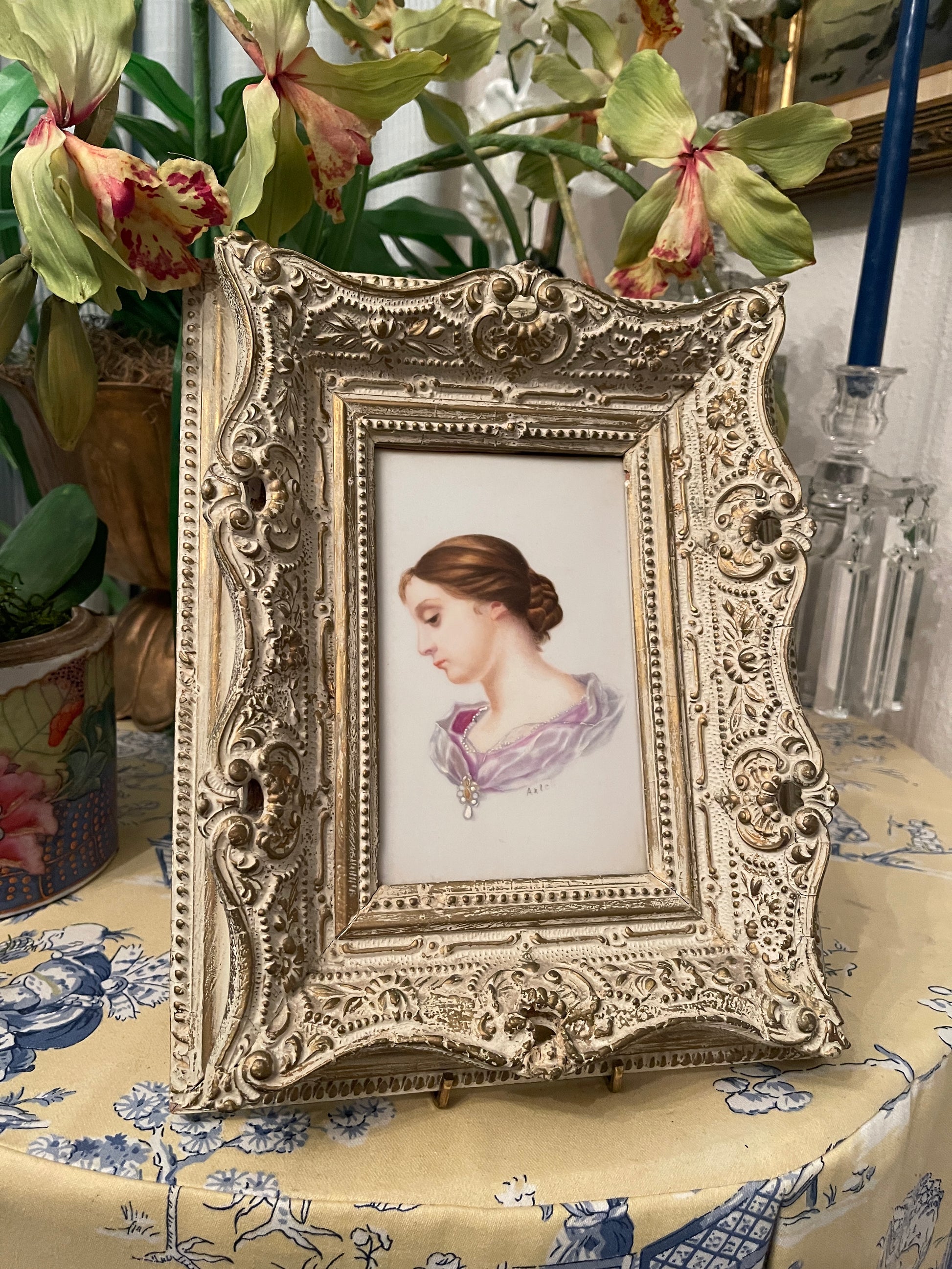 It measures 9.25” wide x 11.5” tall from the outside corners of the frame. It has been professionally framed with a wire and is ready to hang. The porcelain( shown) measures 6.5” x 4.75”. It's in lively estate condition with age appropriate wear to the frame. (Easel NOT included)