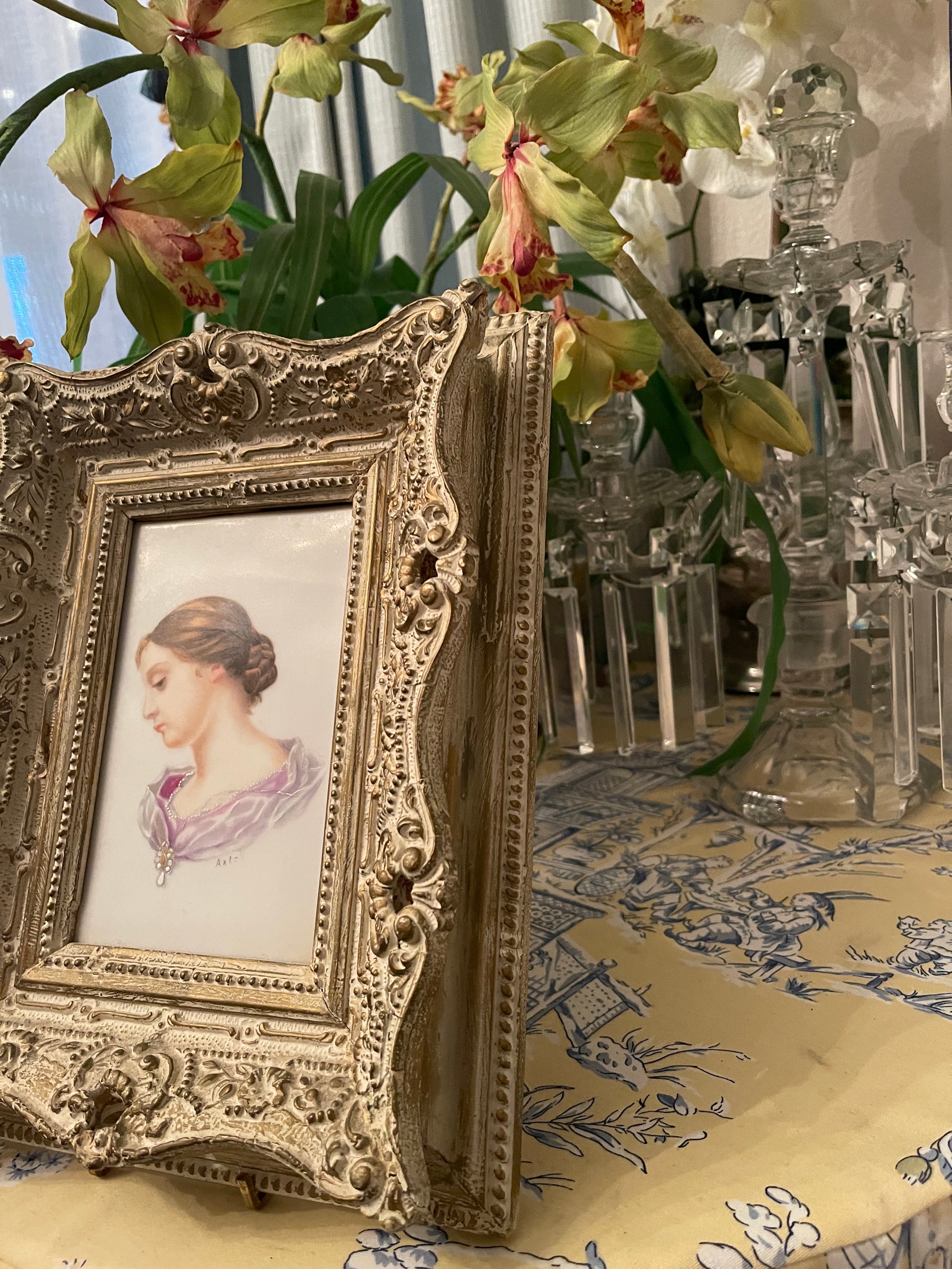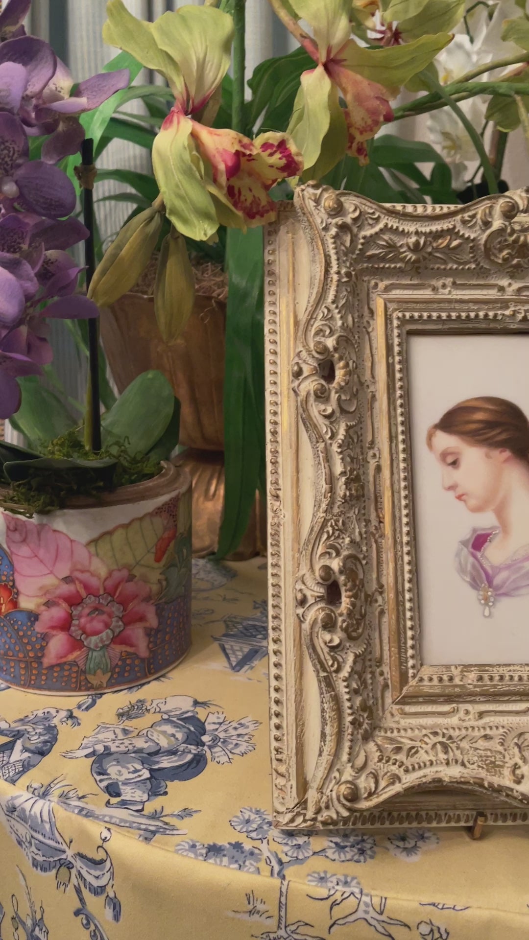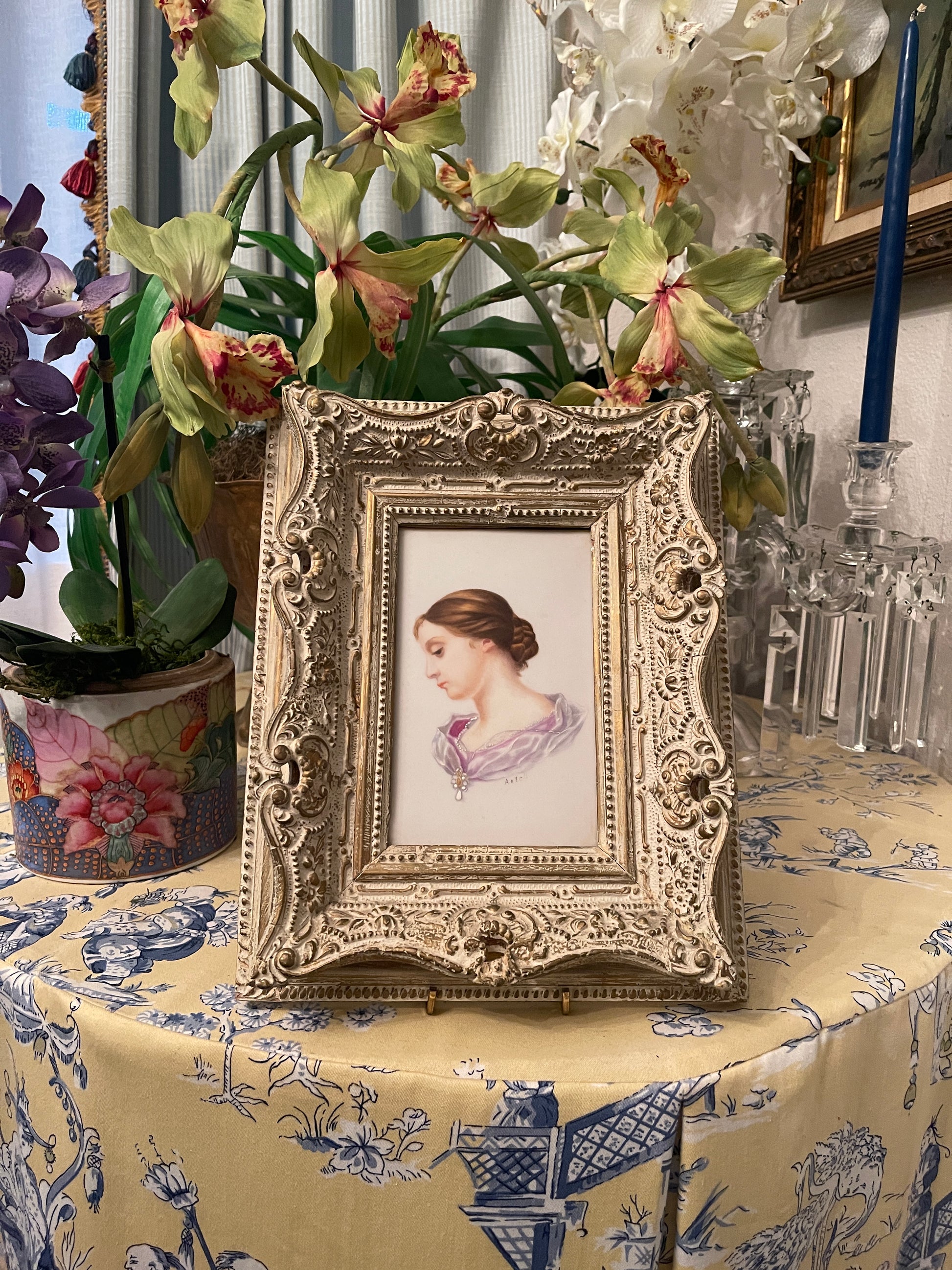 It measures 9.25” wide x 11.5” tall from the outside corners of the frame. It has been professionally framed with a wire and is ready to hang. The porcelain( shown) measures 6.5” x 4.75”. It's in lively estate condition with age appropriate wear to the frame. (Easel NOT included)