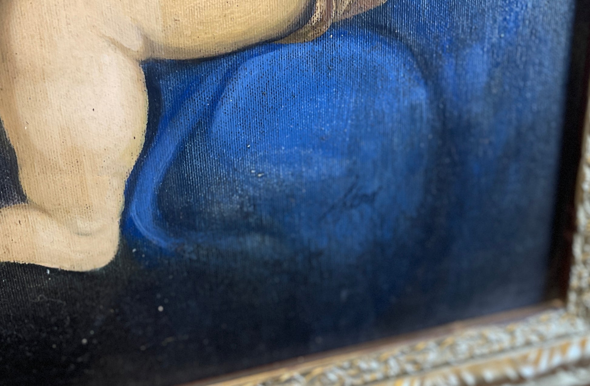 I acquired this piece at the glorious Central Texas estate of a world-renowned business leader who purchased it in Italy. It’s oil on linen enveloped in an ornate gold wood frame. it’s artist signed, but I don’t find any informatiin on them.