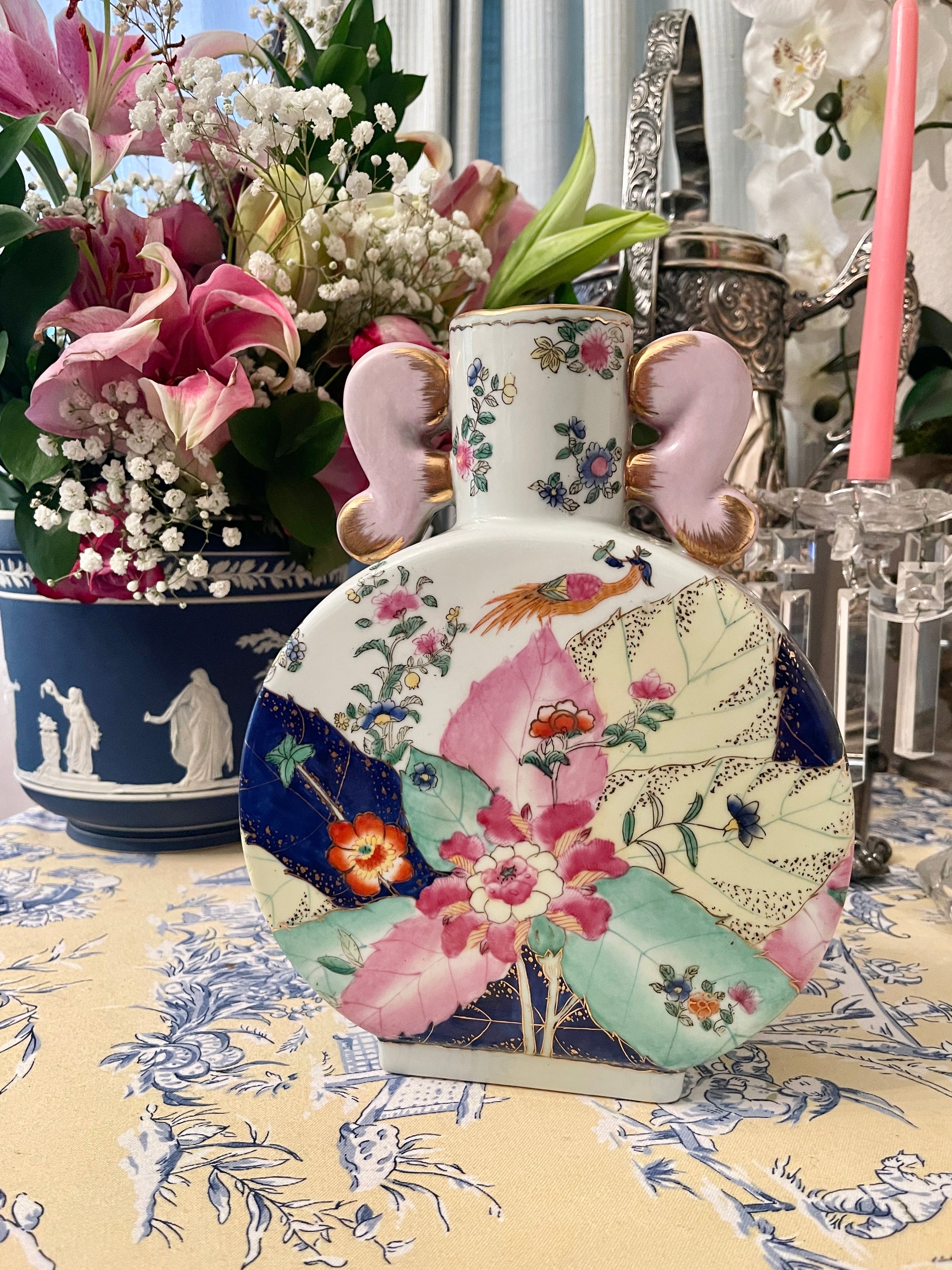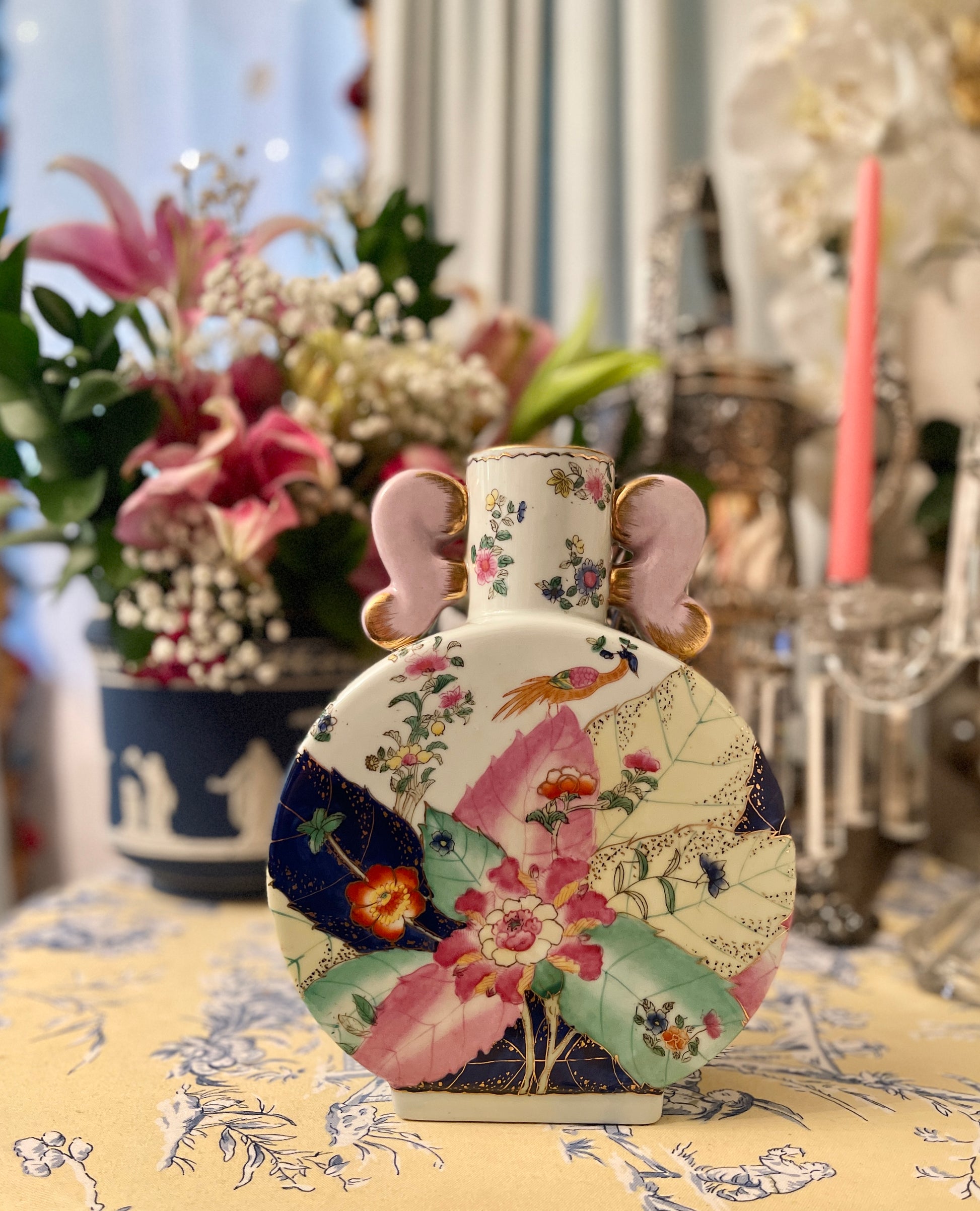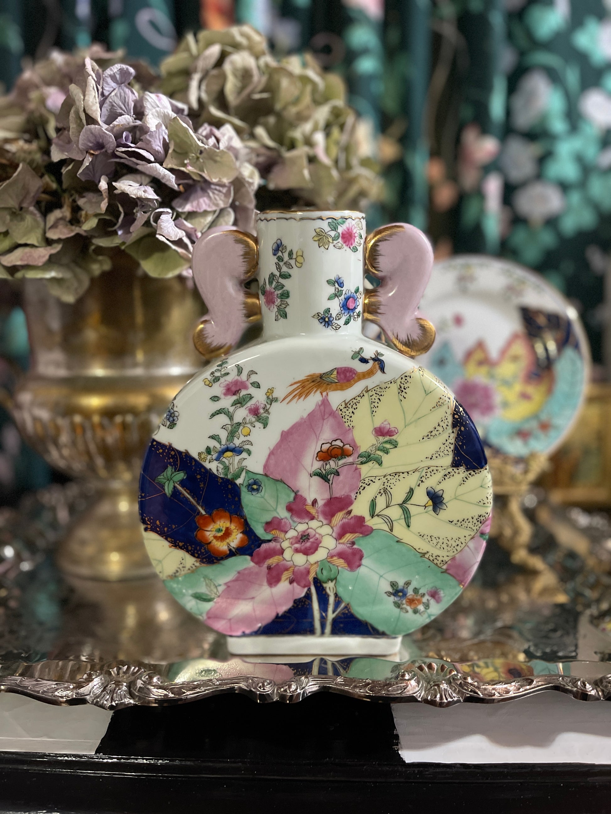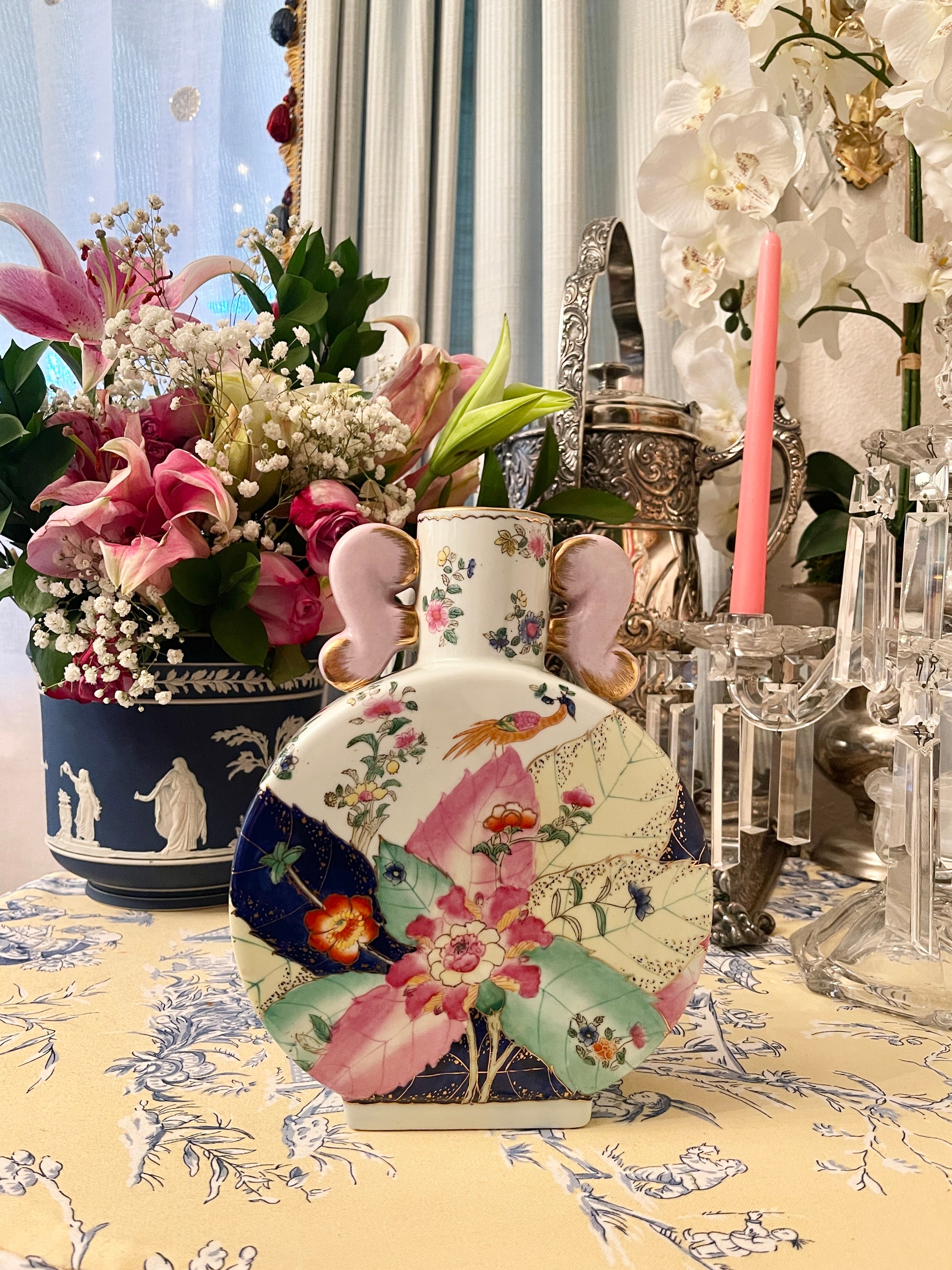 This stunning United Wilson Tobacco Leaf Moon Flask or Vase is a first for me. Beautifully hand painted in vibrant shades of blue, pink, and green with the chinoiserie phoenix atop one of the leaves in this glorious tobacco leaf design. The large scrolling pink handles with gold accents adds that extra touch showing the superb quality of this piece. Marked UW 1891 on the reverse.